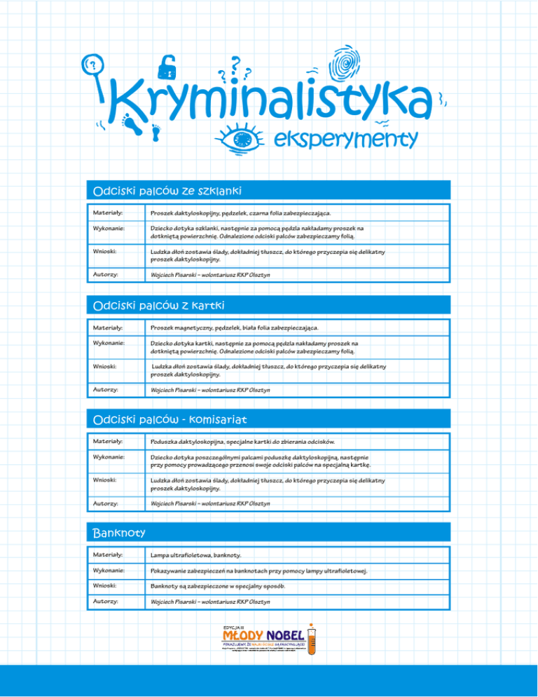 Kryminalistyka eksperymenty Odciski palców ze szklanki Materiały: Proszek daktyloskopijny, pędzelek, czarna folia zabezpieczająca. Wykonanie: Dziecko dotyka szklanki, następnie za pomocą pędzla nakładamy proszek na dotkniętą powierzchnię. Odnalezione odciski palców zabezpieczamy folią. Wnioski: Ludzka dłoń zostawia ślady, dokładniej tłuszcz, do którego przyczepia się delikatny proszek daktyloskopijny. Autorzy: Wojciech Pisarski – wolontariusz RKP Olsztyn Odciski palców z kartki Materiały: Proszek magnetyczny, pędzelek, biała folia zabezpieczająca. Wykonanie: Dziecko dotyka kartki, następnie za pomocą pędzla nakładamy proszek na dotkniętą powierzchnię. Odnalezione odciski palców zabezpieczamy folią. Wnioski: Ludzka dłoń zostawia ślady, dokładniej tłuszcz, do którego przyczepia się delikatny proszek daktyloskopijny. Autorzy: Wojciech Pisarski – wolontariusz RKP Olsztyn Odciski palców - komisariat Materiały: Poduszka daktyloskopijna, specjalne kartki do zbierania odcisków. Wykonanie: Dziecko dotyka poszczególnymi palcami poduszkę daktyloskopijną, następnie przy pomocy prowadzącego przenosi swoje odciski palców na specjalną kartkę. Wnioski: Ludzka dłoń zostawia ślady, dokładniej tłuszcz, do którego przyczepia się delikatny proszek daktyloskopijny. Autorzy: Wojciech Pisarski – wolontariusz RKP Olsztyn Banknoty Materiały: Lampa ultrafioletowa, banknoty. Wykonanie: Pokazywanie zabezpieczeń na banknotach przy pomocy lampy ultrafioletowej. Wnioski: Banknoty są zabezpieczone w specjalny sposób. Autorzy: Wojciech Pisarski – wolontariusz RKP Olsztyn