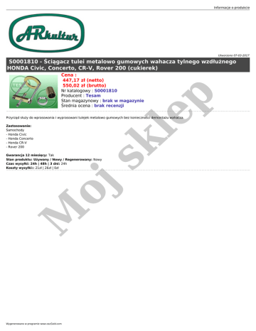 Informacje o produkcie Utworzono 07-03-2017 S0001810 - Ściągacz tulei metalowo gumowych wahacza tylnego wzdłużnego HONDA Civic, Concerto, CR-V, Rover 200 (cukierek) Cena : 447,17 zł (netto) 550,02 zł (brutto) ep Nr katalogowy : S0001810 Producent : Tesam Stan magazynowy : brak w magazynie Średnia ocena : brak recenzji Zastosowanie: Samochody - Honda Civic - Honda Concerto - Honda CR-V - Rover 200 sk l Przyrząd służy do wprasowania i wyprasowani tulejek metalowo gumowych bez konieczności demontażu wahacza. M oj Gwarancja 12 miesięcy: Tak Stan produktu: Używany / Nowy / Regenerowany: Nowy Czas wysyłki: 24h | 48h | 3 dni: 24h Koszty wysyłki:: 21zł | 26zł | 0zł Wygenerowano w programie www.oscGold.com
