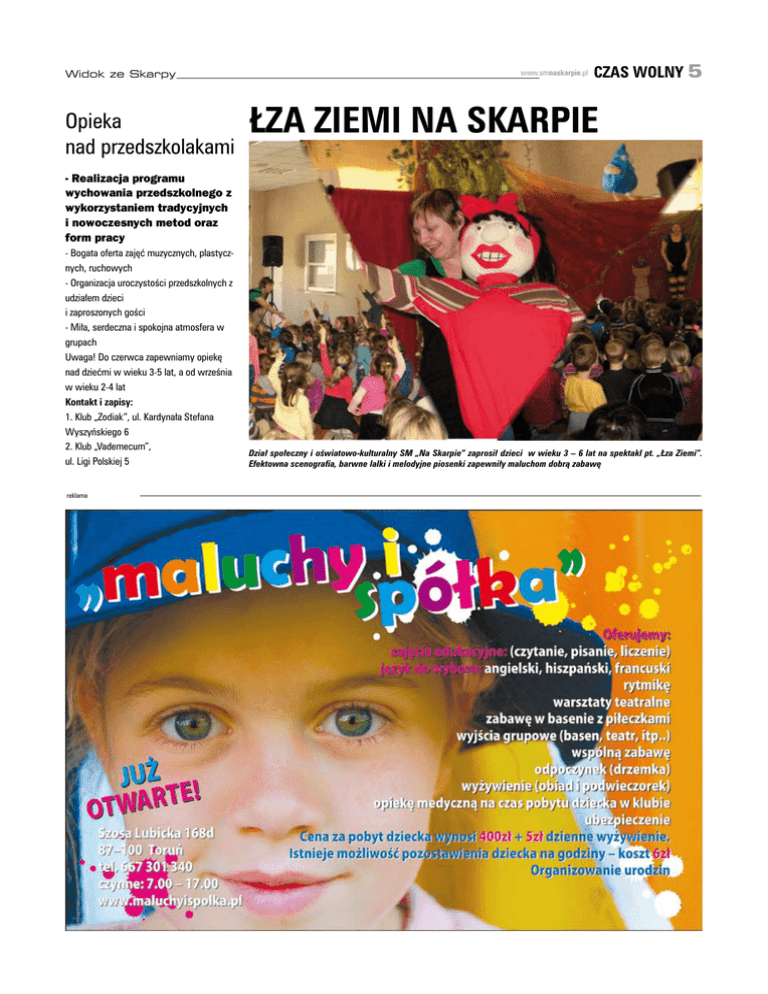 Widok ze Skarpy Opieka nad przedszkolakami www.smnaskarpie.pl czas wolny 5 Łza Ziemi na Skarpie - Realizacja programu wychowania przedszkolnego z wykorzystaniem tradycyjnych i nowoczesnych metod oraz form pracy - Bogata oferta zajęć muzycznych, plastycznych, ruchowych - Organizacja uroczystości przedszkolnych z udziałem dzieci i zaproszonych gości - Miła, serdeczna i spokojna atmosfera w grupach Uwaga! Do czerwca zapewniamy opiekę nad dziećmi w wieku 3-5 lat, a od września w wieku 2-4 lat Kontakt i zapisy: 1. Klub „Zodiak”, ul. Kardynała Stefana Wyszyńskiego 6 2. Klub „Vademecum”, ul. Ligi Polskiej 5 reklama Dział społeczny i oświatowo-kulturalny SM „Na Skarpie” zaprosił dzieci w wieku 3 – 6 lat na spektakl pt. „Łza Ziemi”. Efektowna scenografia, barwne lalki i melodyjne piosenki zapewniły maluchom dobrą zabawę