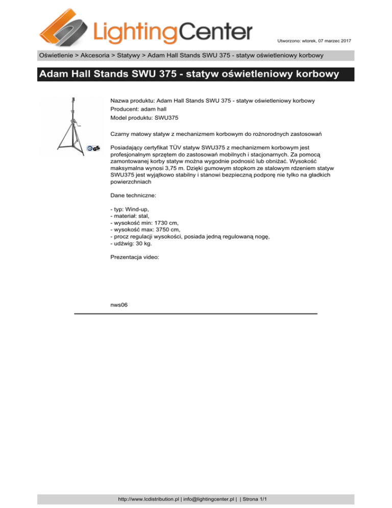 Utworzono: wtorek, 07 marzec 2017 Oświetlenie > Akcesoria > Statywy > Adam Hall Stands SWU 375 - statyw oświetleniowy korbowy Adam Hall Stands SWU 375 - statyw oświetleniowy korbowy Nazwa produktu: Adam Hall Stands SWU 375 - statyw oświetleniowy korbowy Producent: adam hall Model produktu: SWU375 Czarny matowy statyw z mechanizmem korbowym do rożnorodnych zastosowań Posiadający certyfikat TÜV statyw SWU375 z mechanizmem korbowym jest profesjonalnym sprzętem do zastosowań mobilnych i stacjonarnych. Za pomocą zamontowanej korby statyw można wygodnie podnosić lub obniżać. Wysokość maksymalna wynosi 3,75 m. Dzięki gumowym stopkom ze stalowym rdzeniem statyw SWU375 jest wyjątkowo stabilny i stanowi bezpieczną podporę nie tylko na gładkich powierzchniach Dane techniczne: - typ: Wind-up, - materiał: stal, - wysokość min: 1730 cm, - wysokość max: 3750 cm, - procz regulacji wysokości, posiada jedną regulowaną nogę, - udźwig: 30 kg. Prezentacja video: nws06 http://www.lcdistribution.pl | [email protected] | | Strona 1/1