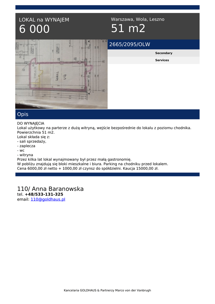 LOKAL na WYNAJEM 6 000 Warszawa, Wola, Leszno 51 m2 2665/2095/OLW Secondary Services Opis DO WYNAJĘCIA Lokal użytkowy na parterze z dużą witryną, wejście bezpośrednie do lokalu z poziomu chodnika. Powierzchnia 51 m2. Lokal składa się z: - sali sprzedaży, - zaplecza - wc - witryna Przez kilka lat lokal wynajmowany był przez małą gastronomię. W pobliżu znajdują się bloki mieszkalne i biura. Parking na chodniku przed lokalem. Cena 6000,00 zł netto + 1000,00 zł czynsz do spółdzielni. Kaucja 15000,00 zł. 110/ Anna Baranowska tel. +48/533-131-325 email: [email protected] Kancelaria GOLDHAUS & Partnerzy Marco von der Vanbrugh Powered by TCPDF (www.tcpdf.org)