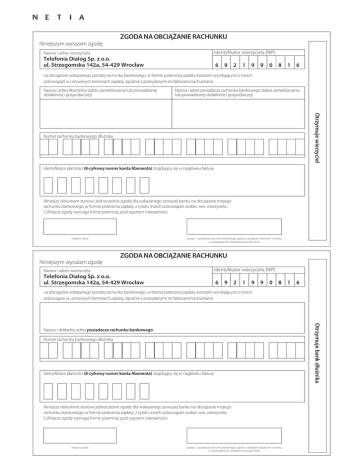 Niniejszym wyrażam zgodę ZGODA NA OBCIĄŻANIE RACHUNKU Identyfikator wierzyciela (NIP) Nazwa i adres wierzyciela Telefonia Dialog Sp. z o.o. ul. Strzegomska 142a, 54-429 Wrocław 6 9 2 1 9 9 0 8 1 6 na obciążanie wskazanego poniżej rachunku bankowego, w formie polecenia zapłaty, kwotami wynikającymi z moich zobowiązań w umownych terminach zapłaty, zgodnie z przesyłanymi mi fakturami/rachunkami Nazwa i adres Abonenta (adres zameldowania lub prowadzonej działalności gospodarczej) Nazwa i adres posiadacza rachunku bankowego (adres zameldowania lub prowadzonej działalności gospodarczej) Otrzymuje wierzyciel Numer rachunku bankowego dłużnika Identyfikator płatności (8-cyfrowy numer konta Abonenta) znajdujący się w nagłówku faktury Niniejszy dokument stanowi jednocześnie zgodę dla wskazanego powyżej banku na obciążanie mojego rachunku bankowego, w formie polecenia zapłaty, z tytułu moich zobowiązań wobec ww. wierzyciela. Cofnięcie zgody wymaga formy pisemnej, pod rygorem nieważności. (miejsce i data) Niniejszym wyrażam zgodę (podpis – posiadacza rachunku bankowego, zgodny z podpisem złożonym w banku, a w przypadku firm dodatkowo pieczęć firmy) ZGODA NA OBCIĄŻANIE RACHUNKU Identyfikator wierzyciela (NIP) Nazwa i adres wierzyciela Telefonia Dialog Sp. z o.o. ul. Strzegomska 142a, 54-429 Wrocław 6 9 2 1 9 9 0 8 1 6 na obciążanie wskazanego poniżej rachunku bankowego, w formie polecenia zapłaty, kwotami wynikającymi z moich zobowiązań w umownych terminach zapłaty, zgodnie z przesyłanymi mi fakturami/rachunkami Numer rachunku bankowego dłużnika Identyfikator płatności (8-cyfrowy numer konta Abonenta) znajdujący się w nagłówku faktury Niniejszy dokument stanowi jednocześnie zgodę dla wskazanego powyżej banku na obciążanie mojego rachunku bankowego, w formie polecenia zapłaty, z tytułu moich zobowiązań wobec ww. wierzyciela. Cofnięcie zgody wymaga formy pisemnej, pod rygorem nieważności. (miejsce i data) (podpis – posiadacza rachunku bankowego, zgodny z podpisem złożonym w banku, a w przypadku firm dodatkowo pieczęć firmy) Otrzymuje bank dłużnika Nazwa i dokładny adres posiadacza rachunku bankowego