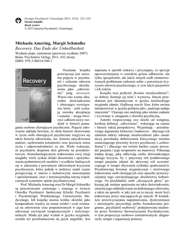 Postępy Psychiatrii i Neurologii 2013; 22(3): 223–224 Ocena książki Book review © 2013 Instytut Psychiatrii i Neurologii Michaela Amering, Margit Schmolke Recovery. Das Ende der Unheilbarkeit Wydanie piąte, zmienione (pierwsze wydanie 2007) Bonn. Psychiatrie Verlag; 2011, 432 strony ISBN: 978-3-88414-540-1 Oceniana książka poświęcona jest nowemu pojęciu w psychiatrii i ochronie zdrowia psychicznego określanemu jako „zdrowienie” (ang. recovery). Wnosi ono ważne idee, realne doświadczenia i obiecujące rozwiązania, które – jeśli zyskają szeroką akceptację i uznanie – mogą otworzyć całkiem nowy rozdział w historii pomagania osobom chorującym psychicznie. Pojęcie zdrowienia zakłada bowiem, że obok historii chorowania w życiu osób chorujących psychicznie rozgrywa się także historia zdrowienia, tzn. historia odzyskiwania nadziei, zachowania tożsamości oraz poczucia sensu życia i odpowiedzialności za nie. Wiele wskazuje, że psychiatria skupiona dziś głównie na przedmiotowym, biotechnologicznym traktowaniu swej misji mogłaby wiele zyskać dzięki docenieniu i spożytkowaniu podmiotowych zasobów i wysiłków budzących się w zderzeniu z poważnym zdrowotnym kryzysem psychicznym, które jednak w praktyce nadal często przegrywają w starciu z kulturowymi stereotypami i uprzedzeniami, oraz z instytucjonalną rutyną współczesnych systemów opieki psychiatrycznej. Prof. Michaela Amering oraz Dr Margit Schmolke są pracownicami cenionego i znanego w świecie Ośrodka Psychiatrii Społecznej Kliniki Psychiatrii i Psychoterapii Wiedeńskiego Uniwersytetu Medycznego. Ich książkę można krótko określić jako kompendium wiedzy na temat źródeł i cech orientacji na zdrowienie oraz proponowanych w jego konsekwencji rozwiązań terapeutycznych i instytucjonalnych. Miała już pięć wydań w języku oryginału, została też przetłumaczona na język angielski. Jest napisana w sposób ciekawy i przystępny, co sprzyja upowszechnianiu w szerokim gronie odbiorców, nie tylko specjalistów, ale także innych osób zainteresowanych problemem radzenia sobie z poważnym kryzysem zdrowia psychicznego, w tym także pacjentów i ich rodzin. Książka nosi podtytuł „Koniec nieuleczalności”, co dobrze ilustruje jej treść i wymowę. Innym przesłaniem jest idiomatyczne w języku niemieckiego oryginału zdanie: Hoffnung macht Sinn, które można interpretować w języku polskim jako „nadzieja nadaje znaczenie”. Ukazuje ono nadzieję jako istotne zadanie i wyzwanie w zmaganiu z choroba psychiczną. Autorki rozpoczynają swe dzieło od wstępnej, krótkiej definicji „zdrowienia”, wskazując na szanse i bariery takiej perspektywy. Wyjaśniają – przedstawiając argumenty kliniczne i badawcze – dlaczego ich zdaniem należy odsunąć nieuleczalność jako zasadniczą przesłankę definiowania klasycznego terminu oznaczającego poważny kryzys psychiczny („schizofrenia”) i dlaczego ten termin bardzo często prowadzi pacjenta i jego terapeutów na manowce. Pokazują trudną drogę, jaką odbywają osoby doświadczające takiego kryzysu, by z pasywnej roli poddawanego terapii pacjenta zdążać do aktywnej roli uczestniczącego w terapii obywatela (członka społeczności). Przedstawiają brzemię stygmatyzacji i nierównego traktowania osób chorujących oraz sposoby przezwyciężania tego zawstydzającego dziedzictwa kulturowego. Na przykładzie osób „słyszących głosy” pokazują jak zmiana spojrzenia na takie doświadczenie, zmienia jego oddziaływanie na dotkniętego człowieka, a także na sposób, w jaki jest on (a raczej: może być) traktowany przez otaczających go innych. W kontekście przezwyciężania napiętnowania, dyskryminacji i stereotypów przywołuje próby formułowania programu „psychiatrii osobowej” podejmowane niedawno przez Światowe Stowarzyszenie Psychiatryczne, w tym propozycje osobowo zorientowanych: diagnostyki, terapii i organizacji pomocy. 224 Naszkicowawszy „zdrowienia” jako pewną propozycję, perspektywę, orientację czy model dla ochrony zdrowia psychicznego, Autorki podejmują próbę własnej definicji i opisu jego właściwości i kontekstu. Zwracają uwagę na znaczenie strategicznych rozstrzygnięć polityki w zakresie zdrowia psychicznego, na rolę udziału i współdziałania użytkowników opieki psychiatrycznej (pacjentów i ich rodzin), na znaczenie prężności psychicznej (ang. resilience) jako czynnika zdrowienia, na zadania w zakresie promocji i profilaktyki, zabiegania o jakość życia i umacnianie (ang. empowerment). Przytaczają też oparte na dowodach argumenty legitymizujące znaczenie „zdrowienia” a także dowody – jak się wydaje – szczególnie przemawiające do wyobraźni i pobudzające do refleksji, bo oparte na realnych doświadczeniach osób (m.in. Dan Fisher, Pat Deegan, Helen Glover, Wilma Boewing), których zmagania z chorobą psychiczną stały się przykładem realności zdrowienia i płynących zeń korzyści indywidualnych czy społecznych. Zyskały one zainteresowanie i uznanie w różnych częściach świata i zapoczątkowały interesujące programy myślenia i publicznego działania. W kolejnych rozdziałach Autorki podejmują temat zadań i rozwiązań, które mogą (powinny) zostać podjęte, by model myślenia i działania respektujący „zdrowienie” upowszechnić i wdrożyć do praktyki w badaniach, terapii i organizacji opieki zdrowotnej. Wskazują gdzie szukać partnerów i sojuszników w tym dziele, Jacek Wciórka a co należałoby przemyśleć i może zreformować. Uważnemu polskiemu czytelnikowi ta część książki może przywołać refleksje dotyczące Narodowego Programu Ochrony Zdrowia Psychicznego oraz oczekiwań i barier na jakie napotyka w Polsce ten program reformowania opieki psychiatrycznej. Czytelnik, który sięgnie po tę książkę znajdzie w niej niezwykle interesujący i obiecujący opis perspektywy „zdrowienia”. Zape