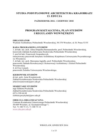 STUDIA PODYPLOMOWE ARCHITEKTURA KRAJOBRAZU 13. EDYCJA PAŹDZIERNIK 2016 - CZERWIEC 2018 PROGRAM KSZTAŁCENIA, PLAN STUDIÓW I REGULAMIN WEWNĘTRZNY ORGANIZATOR Wydział Architektury Politechniki Wrocławskiej, 50-370 Wrocław, ul. B. Prusa 53/55 RADA PROGRAMOWA STUDIÓW 1. dr hab. inż. arch. Alina Drapella-Hermansdorfer, prof. Politechniki Wrocławskiej, kierownik Zakładu Kształtowania Środowiska Politechniki Wrocławskiej 2. prof dr hab. Franciszek Gospodarczyk, emerytowany pracownik Instytutu Architektury Krajobrazu Uniwersytetu Przyrodniczego we Wrocławiu 3. dr hab. inż. arch. Marzanna Jagiełło, prof. Politechniki Wrocławskiej, pracownik Zakładu Rewaloryzacji i Konserwacji Architektury i Zieleni Politechniki Wrocławskiej 4. dr Ewa Lenard, pracownik Zielnika Uniwersytetu Wrocławskiego. KIEROWNIK STUDIÓW dr inż. arch. Artur Kwaśniewski Zakład Kształtowania Środowiska Politechniki Wrocławskiej [email protected] SEKRETARZ STUDIÓW mgr Elżbieta Przybylak Zakład Kształtowania Środowiska Politechniki Wrocławskiej (071) 320 64 60 [email protected] OBSŁUGA ORGANIZACYJNA Centrum Kształcenia Ustawicznego Politechniki Wrocławskiej 50-609 Wrocław, ul. Szymanowskiego 7, Tel. 71 340 75 15, 71 340 75 14 www.cku.pwr.edu.pl WROCŁAW, KWIECIEŃ 2016 1 z 13 I. PROGRAM KSZTAŁCENIA I ZASADY ORGANIZACYJNE 1. OPIS STUDIÓW PODYPLOMOWYCH 1.1. ZAŁOŻENIA PROGRAMOWE 1.1.1. Studia Podyplomowe Architektura Krajobrazu (dalej określone jako „Studia”) są ukierunkowane na nauczanie projektowania; mają na celu przekazanie uczestnikom wiedzy i umiejętności związanych z projektowaniem i z urządzaniem terenów zieleni. 1.1.2. Przedmiotem zajęć jest: - wiedza planistyczna o komponowaniu przestrzeni i kształtowaniu terenów zieleni, zagospodarowywaniu i ochronie krajobrazu, o zasadach prowadzenia studiów i analiz wstępnych, formułowania programu użytkowego i ideowego założeń ogrodowych, parkowych, placów i skwerów miejskich, o planowaniu w skali krajobrazu, - wiedza przyrodnicza niezbędna dla prawidłowego doboru roślin oraz pielęgnacji ogrodów i parków, - wiedza techniczna i technologiczna oraz organizacyjno-prawna związana z urządzaniem terenów zieleni, - podstawy wiedzy historyczno-konserwatorskiej pozwalającej prawidłowo adaptować i kształtować historyczne założenia zieleni. - umiejętność sporządzania kompletnych opracowań projektowych (w tym również: odręcznego opracowywania koncepcji projektowych i sporządzania makiet). 1.1.3. Studia trwają cztery semestry, od października 2016 do czerwca 2018, obejmują 428 godzin lekcyjnych przeznaczonych na wykłady, ćwiczenia projektowe i seminaria. (Zgodnie z zasadami przyjętymi na Politechnice Wrocławskiej 1 godzina lekcyjna to 45 minut zajęć i 15 minut przerwy). 1.1.4. Zajęcia odbywają się w soboty, w godzinach 9.15-17.00, w siedzibie Wydziału Architektury (Wrocław, ul. B. Prusa 53/55) oraz w terenie (Ogród Botaniczny, Park Szczytnicki). Łącznie odbędą się 54 spotkania, w tym jedne obligatoryjne zajęcia wyjazdowe (w 4. semestrze). 1.1.5. Zajęcia będą prowadzone przez pracowników naukowych Politechniki Wrocławskiej, Uniwersytetu Przyrodniczego we Wrocławiu, Uniwersytetu Wrocławskiego oraz przez praktyków związanych zawodowo z kształtowaniem terenów zieleni. 1.1.6. Absolwenci otrzymują świadectwo ukończenia Studiów w zakresie projektowania i pielęgnacji terenów zieleni, podpisane przez Rektora Politechniki Wrocławskiej. 1.2. KRYTERIA NABORU 1.2. 1. Studia mają charakter ogólnopolski. 1.2.2. W Studiach mogą uczestniczyć absolwenci studiów wyższych (licencjackich i magisterskich) na wydziałach i kierunkach: a) architektura; b) architektura wnętrz i inne kierunki projektowe wyższych uczelni plastycznych; c) ochrona zabytków; d) budownictwo; e) planowanie przestrzenne; f) rolnictwo; g) ogrodnictwo h) leśnictwo; i) biologia. 1.2.3. Liczba uczestników jest ograniczona do 36 osób. 2 z 13 1.2.4. Ostateczne decyzje dotyczące przyjęcia na Studia podejmuje Komisja Rekrutacyjna obejmująca przedstawicieli Rady Programowej Studiów i kierownika Studiów. 1.3. WARUNKI UCZESTNICTWA I UKOŃCZENIA STUDIÓW 1.3.1. Warunki przyjęcia na Studia: a) dostarczenie zgłoszenia i załączników na adres Centrum Kształcenia Ustawicznego Politechniki Wrocławskiej (zob. 7.1.-7.2.) b) decyzja Komisji Rekrutacyjnej o przyjęciu na Studia c) zawarcie z Politechniką Wrocławską umowy na świadczenie usługi edukacyjnej na studiach podyplomowych - poprzez wypełnienie i podpisanie druku nadesłanego wraz z informacją o przyjęciu na Studia. 1.3.2. Warunkiem ukończenia Studiów jest spełnienie następujących wymogów: a) zaliczenie wszystkich kursów na podstawie frekwencji na zajęciach (wymagana jest obecność na co najmniej połowie zajęć wykładowych i projektowych) oraz ocen z egzaminów i projektów semestralnych; b) udział w co najmniej sześciu seminariach projektowych (służących do prezentowania i omawiania postępu prac nad projektem stanowiącym pracę końcową); c) uzyskanie pozytywnej oceny z egzaminu końcowego (będącego obroną pracy końcowej); d) terminowe uiszczanie opłat semestralnych za udział w Studiach (zob. 6.2.). 2. ZAKŁADANE EFEKTY KSZTAŁCENIA 2.1. Absolwent Studiów Podyplomowych Architektura Krajobrazu: a) rozumie konieczność projektowania zgodnego z uwarunkowaniami środowiskowymi – dyktowanymi przez środowisko przyrodnicze, kulturowe, społeczne; b) ma wiedzę nt. funkcjonowania środowiska przyrodniczego oraz nt. doboru gatunkowego roślin i możliwości ich wykorzystywania w ogrodach, parkach, w krajobrazie miejskim i otwartym; ma podstawową wiedzę nt. pielęgnacji drzew, krzewów, roślin jednorocznych i bylin; c) ma wiedzę nt. związków między funkcjonowaniem człowieka a cechami otoczenia (środowiska przyrodniczego i społecznego) nt. roli tych zależności w projektowaniu przestrzeni; zna założenia idei zrównoważon