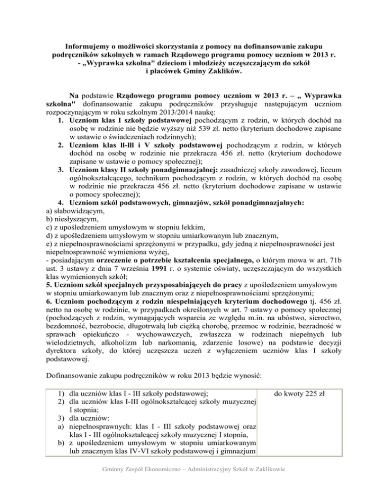 Informujemy o możliwości skorzystania z pomocy na dofinansowanie zakupu podręczników szkolnych w ramach Rządowego programu pomocy uczniom w 2013 r. - „Wyprawka szkolna" dzieciom i młodzieży uczęszczającym do szkół i placówek Gminy Zaklików. Na podstawie Rządowego programu pomocy uczniom w 2013 r. – „ Wyprawka szkolna" dofinansowanie zakupu podręczników przysługuje następującym uczniom rozpoczynającym w roku szkolnym 2013/2014 naukę: 1. Uczniom klas I szkoły podstawowej pochodzącym z rodzin, w których dochód na osobę w rodzinie nie będzie wyższy niż 539 zł. netto (kryterium dochodowe zapisane w ustawie o świadczeniach rodzinnych); 2. Uczniom klas ll-lll i V szkoły podstawowej pochodzącym z rodzin, w których dochód na osobę w rodzinie nie przekracza 456 zł. netto (kryterium dochodowe zapisane w ustawie o pomocy społecznej); 3. Uczniom klasy II szkoły ponadgimnazjalnej: zasadniczej szkoły zawodowej, liceum ogólnokształcącego, technikum pochodzącym z rodzin, w których dochód na osobę w rodzinie nie przekracza 456 zł. netto (kryterium dochodowe zapisane w ustawie o pomocy społecznej); 4. Uczniom szkól podstawowych, gimnazjów, szkół ponadgimnazjalnych: a) słabowidzącym, b) niesłyszącym, c) z upośledzeniem umysłowym w stopniu lekkim, d) z upośledzeniem umysłowym w stopniu umiarkowanym lub znacznym, e) z niepełnosprawnościami sprzężonymi w przypadku, gdy jedną z niepełnosprawności jest niepełnosprawność wymieniona wyżej, - posiadającym orzeczenie o potrzebie kształcenia specjalnego, o którym mowa w art. 71b ust. 3 ustawy z dnia 7 września 1991 r. o systemie oświaty, uczęszczającym do wszystkich klas wymienionych szkół; 5. Uczniom szkół specjalnych przysposabiających do pracy z upośledzeniem umysłowym w stopniu umiarkowanym lub znacznym oraz z niepełnosprawnościami sprzężonymi; 6. Uczniom pochodzącym z rodzin niespełniających kryterium dochodowego tj. 456 zł. netto na osobę w rodzinie, w przypadkach określonych w art. 7 ustawy o pomocy społecznej (pochodzących z rodzin, wymagających wsparcia ze względu m.in. na ubóstwo, sieroctwo, bezdomność, bezrobocie, długotrwałą lub ciężką chorobę, przemoc w rodzinie, bezradność w sprawach opiekuńczo - wychowawczych, zwłaszcza w rodzinach niepełnych lub wielodzietnych, alkoholizm lub narkomanią, zdarzenie losowe) na podstawie decyzji dyrektora szkoły, do której uczęszcza uczeń z wyłączeniem uczniów klas I szkoły podstawowej. Dofinansowanie zakupu podręczników w roku 2013 będzie wynosić: 1) dla uczniów klas I - III szkoły podstawowej; 2) dla uczniów klas I-III ogólnokształcącej szkoły muzycznej I stopnia; 3) dla uczniów: a) niepełnosprawnych: klas I - III szkoły podstawowej oraz klas I - III ogólnokształcącej szkoły muzycznej I stopnia, b) z upośledzeniem umysłowym w stopniu umiarkowanym lub znacznym klas IV-VI szkoły podstawowej i gimnazjum do kwoty 225 zł Gminny Zespół Ekonomiczno – Administracyjny Szkół w Zaklikowie - niekorzystających z podręczników przeznaczonych do kształcenia specjalnego dopuszczonych do użytku szkolnego przez ministra właściwego do spraw oświaty i wychowania; 4) dla uczniów szkoły specjalnej przysposabiającej do pracy dla uczniów: 1) niepełnosprawnych (z wyjątkiem uczniów słabowidzących): klas I-III szkoły podstawowej oraz klas I-III ogólnokształcącej szkoły muzycznej I stopnia, 2) z upośledzeniem umysłowym w stopniu umiarkowanym lub znacznym klas IV-VI szkoły podstawowej i gimnazjum - korzystających z podręczników przeznaczonych do kształcenia specjalnego dopuszczonych do użytku szkolnego przez ministra właściwego do spraw oświaty i wychowania; w przypadku korzystania z części podręczników przeznaczonych do kształcenia ogólnego (niebędących podręcznikami przeznaczonymi do kształcenia specjalnego) dopuszczonych do użytku szkolnego przez ministra właściwego do spraw oświaty i wychowania, książek pomocniczych lub materiałów dydaktycznych, koszt ich nie może być wyższy niż 25% kwoty 770 zł 1) dla uczniów klasy V szkoły podstawowej; 2) dla uczniów klasy V ogólnokształcącej szkoły muzycznej I stopnia oraz klasy II ogólnokształcącej szkoły baletowej, 3) 3) dla uczniów niepełnosprawnych (z wyjątkiem uczniów z upośledzeniem umysłowym w stopniu umiarkowanym lub znacznym): klas IV-VI szkoły podstawowej, klas IV-VI ogólnokształcącej szkoły muzycznej I stopnia oraz klas I-III ogólnokształcącej szkoły baletowej, niekorzystających z podręczników przeznaczonych do kształcenia specjalnego dopuszczonych do użytku szkolnego przez ministra właściwego do spraw oświaty i wychowania Dla uczniów niepełnosprawnych (z wyjątkiem uczniów słabowidzących oraz uczniów z upośledzeniem umysłowym w stopniu umiarkowanym lub znacznym): klas IV-VI szkoły podstawowej, klas IV-VI ogólnokształcącej szkoły muzycznej I stopnia oraz klas I-III ogólnokształcącej szkoły baletowej, korzystających z podręczników przeznaczonych do kształcenia specjalnego dopuszczonych do użytku szkolnego przez ministra właściwego do spraw oświaty i wychowania; w przypadku korzystania z części podręczników przeznaczonych do kształcenia ogólnego (niebędących podręcznikami przeznaczonymi do kształcenia specjalnego) dopuszczonych do użytku szkolnego przez ministra właściwego do spraw oświaty i wychowania, koszt ich nie może być wyższy niż 40% kwoty 770 zł Dla uczniów niepełnosprawnych (z wyjątkiem uczniów z upośledzeniem umysłowym w stopniu umiarkowanym lub znacznym): gimnazjum, klas I-III ogólnokształcącej szkoły do kwoty 770 zł do kwoty 325 zł do kwoty 770 zł do kwoty 350 zł Gminny Zespół Ekonomiczno – Administracyjny Szkół w Zaklikowie muzycznej II stopnia, klas I-III ogólnokształcącej szkoły sztuk pięknych oraz klas IV-VI ogólnokształcącej szkoły baletowej, niekorzystających z podr