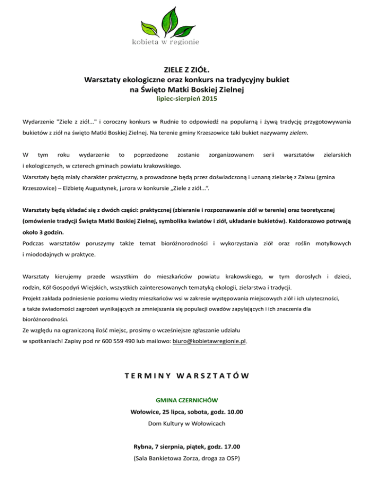 ZIELE Z ZIÓŁ. Warsztaty ekologiczne oraz konkurs na tradycyjny bukiet na Święto Matki Boskiej Zielnej lipiec-sierpień 2015 Wydarzenie "Ziele z ziół..." i coroczny konkurs w Rudnie to odpowiedź na popularną i żywą tradycję przygotowywania bukietów z ziół na święto Matki Boskiej Zielnej. Na terenie gminy Krzeszowice taki bukiet nazywamy zielem. W tym roku wydarzenie to poprzedzone zostanie zorganizowanem serii warsztatów zielarskich i ekologicznych, w czterech gminach powiatu krakowskiego. Warsztaty będą miały charakter praktyczny, a prowadzone będą przez doświadczoną i uznaną zielarkę z Zalasu (gmina Krzeszowice) – Elżbietę Augustynek, jurora w konkursie „Ziele z ziół...“. Warsztaty będą składać się z dwóch części: praktycznej (zbieranie i rozpoznawanie ziół w terenie) oraz teoretycznej (omówienie tradycji Święta Matki Boskiej Zielnej, symbolika kwiatów i ziół, układanie bukietów). Każdorazowo potrwają około 3 godzin. Podczas warsztatów poruszymy także temat bioróżnorodności i wykorzystania ziół oraz roślin motylkowych i miododajnych w praktyce. Warsztaty kierujemy przede wszystkim do mieszkańców powiatu krakowskiego, w tym dorosłych i dzieci, rodzin, Kół Gospodyń Wiejskich, wszystkich zainteresowanych tematyką ekologii, zielarstwa i tradycji. Projekt zakłada podniesienie poziomu wiedzy mieszkańców wsi w zakresie występowania miejscowych ziół i ich użyteczności, a także świadomości zagrożeń wynikających ze zmniejszania się populacji owadów zapylających i ich znaczenia dla bioróżnorodności. Ze względu na ograniczoną ilość miejsc, prosimy o wcześniejsze zgłaszanie udziału w spotkaniach! Zapisy pod nr 600 559 490 lub mailowo: [email protected]. TERMINY WARSZTATÓW GMINA CZERNICHÓW Wołowice, 25 lipca, sobota, godz. 10.00 Dom Kultury w Wołowicach Rybna, 7 sierpnia, piątek, godz. 17.00 (Sala Bankietowa Zorza, droga za OSP) GMINA KRZESZOWICE Rudno, 30 lipca, czwartek, godz. 10.00 (Szkoła w Rudnie; warsztaty dla dzieci i dorosłych) Nowa Góra – 10 sierpnia 2015, godz. 10.00 (Rynek w Nowej Górze, przy fontannie) *** GMINA JERZMANOWICE – PRZEGINIA Szklary – 24 lipca, piątek, godz. 17.00 (obok skały Brodło, dojazd od strony wsi Łazy) Sąspów, 28 lipca, wtorek, godz. 17.00 (Sąspów-Pasieka, przy drodze powiatowej, w kierunku na Ojców) *** GMINA LISZKI Kryspinów, 3 sierpnia, poniedziałek, godz. 17.00 Spotkanie z ojcem Leonem Knabitem i Elżbietą Augustynek (Szkoła w Kryspinowie) *** Uroczysty konkurs bukietów odbędzie się 15 sierpnia 2015 roku w Rudnie (gmina Krzeszowice), w kaplicy św. Rafała Kalinowskiego, przy drodze na zamek Tęczyn. PROGRAM od 9.00 – rejestracja bukietów konkursowych 10.15 – Msza św. i poświęcenie bukietów 11.30 - koncert pieśni Maryjnych – chór Stowarzyszenia Wokół Rybnej 12.00 – koncert pieśni słowiańskich od 12.30 – poczęstunek Ok. 13.30 – rozstrzygnięcie konkursu i wręczenie nagród Organizatorzy: fundacja Kobieta w Regionie, Stowarzyszenie Rozwoju Wsi Rudno Projekt jest współfinansowany przez Powiat Krakowski oraz Gminę Krzeszowice.