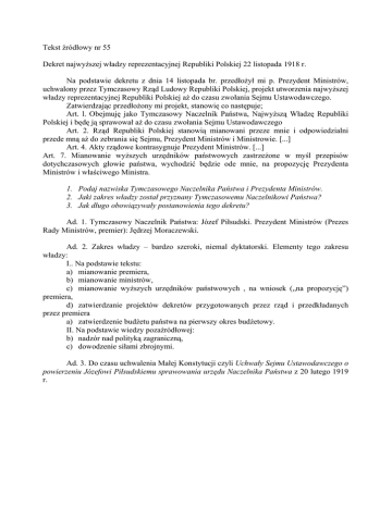 Tekst źródłowy nr 55 Dekret najwyższej władzy reprezentacyjnej Republiki Polskiej 22 listopada 1918 r. Na podstawie dekretu z dnia 14 listopada br. przedłożył mi p. Prezydent Ministrów, uchwalony przez Tymczasowy Rząd Ludowy Republiki Polskiej, projekt utworzenia najwyższej władzy reprezentacyjnej Republiki Polskiej aż do czasu zwołania Sejmu Ustawodawczego. Zatwierdzając przedłożony mi projekt, stanowię co następuje; Art. l. Obejmuję jako Tymczasowy Naczelnik Państwa, Najwyższą Władzę Republiki Polskiej i będę ją sprawował aż do czasu zwołania Sejmu Ustawodawczego Art. 2. Rząd Republiki Polskiej stanowią mianowani przeze mnie i odpowiedzialni przede mną aż do zebrania się Sejmu, Prezydent Ministrów i Ministrowie. [...] Art. 4. Akty rządowe kontrasygnuje Prezydent Ministrów. [...] Art. 7. Mianowanie wyższych urzędników państwowych zastrzeżone w myśl przepisów dotychczasowych głowie państwa, wychodzić będzie ode mnie, na propozycję Prezydenta Ministrów i właściwego Ministra. 1. Podaj nazwiska Tymczasowego Naczelnika Państwa i Prezydenta Ministrów. 2. Jaki zakres władzy został przyznany Tymczasowemu Naczelnikowi Państwa? 3. Jak długo obowiązywały postanowienia tego dekretu? Ad. 1. Tymczasowy Naczelnik Państwa: Józef Piłsudski. Prezydent Ministrów (Prezes Rady Ministrów, premier): Jędrzej Moraczewski. Ad. 2. Zakres władzy – bardzo szeroki, niemal dyktatorski. Elementy tego zakresu władzy: I.. Na podstawie tekstu: a) mianowanie premiera, b) mianowanie ministrów, c) mianowanie wyższych urzędników państwowych , na wniosek („na propozycję”) premiera, d) zatwierdzanie projektów dekretów przygotowanych przez rząd i przedkładanych przez premiera a) zatwierdzenie budżetu państwa na pierwszy okres budżetowy. II. Na podstawie wiedzy pozaźródłowej: b) nadzór nad polityką zagraniczną, c) dowodzenie siłami zbrojnymi. Ad. 3. Do czasu uchwalenia Małej Konstytucji czyli Uchwały Sejmu Ustawodawczego o powierzeniu Józefowi Piłsudskiemu sprawowania urzędu Naczelnika Państwa z 20 lutego 1919 r.