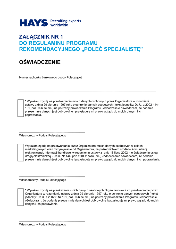 ZAŁĄCZNIK NR 1 DO REGULAMINU PROGRAMU REKOMENDACYJNEGO „POLEĆ SPECJALISTĘ” OŚWIADCZENIE Numer rachunku bankowego osoby Polecającej ----------------------------------------------------------------------------------------------------------------------------- -------------* Wyrażam zgodę na przetwarzanie moich danych osobowych przez Organizatora w rozumieniu ustawy z dnia 29 sierpnia 1997 roku o ochronie danych osobowych ( tekst jednolity: Dz.U. z 2002 r. Nr 101, poz. 926 ze zm.) na potrzeby prowadzenia Programu.Jednocześnie oświadczam, że podanie przeze mnie danych jest dobrowolne i przysługuje mi prawo wglądu do moich danych i ich poprawiania. ------------------------------------------------------------------Własnoręczny Podpis Polecającego Wyrażam zgodę na przetwarzanie przez Organizatora moich danych osobowych w celach marketingowych oraz otrzymywanie od Organizatora, za pośrednictwem środków komunikacji elektronicznej, informacji handlowej w rozumieniu ustawy z dnia 18 lipca 2002 r. o świadczeniu usług drogą elektroniczną - Dz.U. Nr 144, poz.1204 z późn. zm.) Jednocześnie oświadczam, że podanie przeze mnie danych jest dobrowolne i przysługuje mi prawo wglądu do moich danych i ich poprawiania. ------------------------------------------------------------------Własnoręczny Podpis Polecającego * Wyrażam zgodę na przekazanie moich danych osobowych Organizatorowi i ich przetwarzanie przez Organizatora w rozumieniu ustawy z dnia 29 sierpnia 1997 roku o ochronie danych osobowych ( tekst jednolity: Dz.U. z 2002 r. Nr 101, poz. 926 ze zm.) na potrzeby prowadzenia Programu.Jednocześnie oświadczam, że podanie przeze mnie danych jest dobrowolne i przysługuje mi prawo wglądu do moich danych i ich poprawiania. ------------------------------------------------------------------Własnoręczny Podpis Polecającego Wyrażam zgodę na przetwarzanie przez Organizatora moich danych osobowych w celach marketingowych oraz otrzymywanie od Organizatora, za pośrednictwem środków komunikacji elektronicznej, informacji handlowej w rozumieniu ustawy z dnia 18 lipca 2002 r. o świadczeniu usług drogą elektroniczną - Dz.U. Nr 144, poz.1204 z późn. zm.) Jednocześnie oświadczam, że podanie przeze mnie danych jest dobrowolne i przysługuje mi prawo wglądu do moich danych i ich poprawiania. ------------------------------------------------------------------Własnoręczny Podpis Polecającego Administratorem danych osobowych zebranych podczas Programu jest HAYS Poland Sp. z o.o., z siedzibą w Warszawie, ul. Złota 59, 00-120 Warszawa. Podanie danych osobowych jest dobrowolne, jednakże jest niezbędne w celu otrzymania Nagrody. HAYS Poland informuje o przysługującym Panu/Pani prawie do dostępu do swoich danych, jak również do żądania ich poprawienia lub usunięcia. * Obowiązkowa zgoda