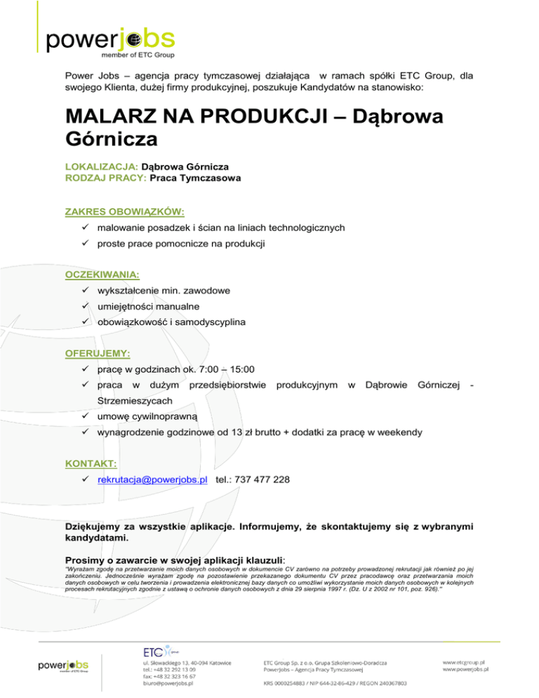 Power Jobs – agencja pracy tymczasowej działająca w ramach spółki ETC Group, dla swojego Klienta, dużej firmy produkcyjnej, poszukuje Kandydatów na stanowisko: MALARZ NA PRODUKCJI – Dąbrowa Górnicza LOKALIZACJA: Dąbrowa Górnicza RODZAJ PRACY: Praca Tymczasowa ZAKRES OBOWIĄZKÓW: malowanie posadzek i ścian na liniach technologicznych proste prace pomocnicze na produkcji OCZEKIWANIA: wykształcenie min. zawodowe umiejętności manualne obowiązkowość i samodyscyplina OFERUJEMY: pracę w godzinach ok. 7:00 – 15:00 praca w dużym przedsiębiorstwie produkcyjnym w Dąbrowie Górniczej - Strzemieszycach umowę cywilnoprawną wynagrodzenie godzinowe od 13 zł brutto + dodatki za pracę w weekendy KONTAKT: [email protected] tel.: 737 477 228 Dziękujemy za wszystkie aplikacje. Informujemy, że skontaktujemy się z wybranymi kandydatami. Prosimy o zawarcie w swojej aplikacji klauzuli: Strona | 1 "Wyrażam zgodę na przetwarzanie moich danych osobowych w dokumencie CV zarówno na potrzeby prowadzonej rekrutacji jak również po jej zakończeniu. Jednocześnie wyrażam zgodę na pozostawienie przekazanego dokumentu CV przez pracodawcę oraz przetwarzania moich danych osobowych w celu tworzenia i prowadzenia elektronicznej bazy danych co umożliwi wykorzystanie moich danych osobowych w kolejnych procesach rekrutacyjnych zgodnie z ustawą o ochronie danych osobowych z dnia 29 sierpnia 1997 r. (Dz. U z 2002 nr 101, poz. 926)."