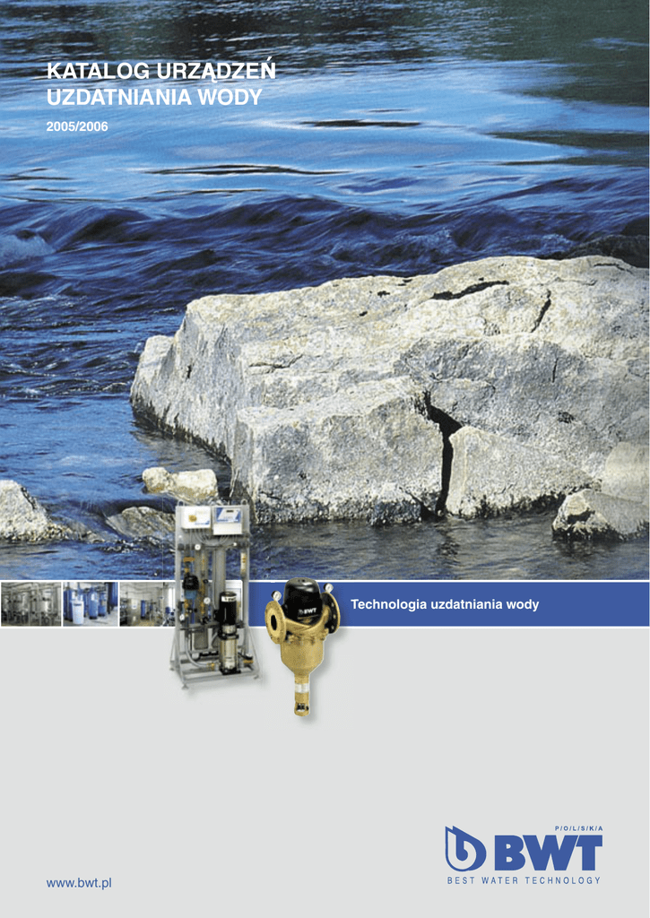 KATALOG URZĄDZEŃ UZDATNIANIA WODY 2005/2006 Technologia uzdatniania wody www.bwt.pl Szanowni Państwo, Z przyjemnością oddajemy w Państwa ręce kolejną edycję katalogu urządzeń technologii uzdatniania wody firmy BWT Polska. Mamy nadzieję, że opisy techniczne oraz fotografie urządzeń przedstawionych w katalogu okażą się pomocne przy doborze produktów, a materiały informacyjne zamieszczone na początku katalogu pozwolą na dokładniejsze zapoznanie się z problematyką uzdatniania wody. Jednocześnie informujemy, że wszystkie nasze urządzenia spełniają wymagania Polskie oraz Unii Europejskiej, a także posiadają stosowne atesty. Z nadzieją na owocną współpracę - łączymy wyrazy szacunku, Dział Technologii Uzdatniania Wody MATERIAŁY INFORMACYJNE INFORMACJE OGÓLNE .............................................................................. 6 PODSTAWOWE WSKAŹNIKI JAKOŚCI WODY ............................................ 8 WYMAGANIA DOTYCZĄCE JAKOŚCI WODY ............................................ 10 PROJEKTOWANIE INSTALACJI WODY OCZYSZCZONEJ ORAZ WODY DO INJEKCJI WFI ............................................................... 16 METODY UZDATNIANIA WODY ................................................................ 24 FILTRACJA MECHANICZNA ..................................................................... 25 ODŻELAZIANIE, ODMANGANIANIE ......................................................... 25 FILTRACJA NA WĘGLU AKTYWNYM ....................................................... 28 MAGNETYZERY ........................................................................................ 29 ZMIĘKCZANIE .......................................................................................... 29 DOZOWANIE PREPARATÓW CHEMICZNYCH ........................................... 32 USUWANIE AZOTANÓW ........................................................................... 33 DEMINERALIZACJA ................................................................................. 34 Demineralizacja wody metodą odwróconej osmozy .............................. 34 Demineralizacja wody metodą wymiany jonowej ................................... 35 Demineralizacja wody metodą elektrodejonizacji .................................. 36 DEZYNFEKCJA ......................................................................................... 39 PRZYKŁADOWE SCHEMATY TECHNOLOGICZNE.................................... 40 P /O/L/S/K/A 4 URZĄDZENIA BWT FILTRACJA MECHANICZNA ..................................................................... 50 PRZERYWACZE STRUGI .......................................................................... 77 NAPOWIETRZANIE ................................................................................... 78 ODŻELAZIANIE/ODMANGANIANIE .......................................................... 79 OCHRONA PRZED OSADAMI WAPNIA I MAGNEZU ................................. 91 WITALIZACJA WODY ................................................................................ 94 ELEKTRONICZNA KONTROLA SIECI WODOCIĄGOWYCH ....................... 94 ZMIĘKCZANIE .......................................................................................... 95 OSPRZĘT DO ZMIĘKCZACZY ................................................................. 119 AUTOMATYCZNY POMIAR PARAMETRÓW WODY ................................. 121 UKŁADY DOZUJĄCE .............................................................................. 126 UKŁADY DOZUJĄCE - CZĘŚCI .............................................................. 132 PREPARATY CHEMICZNE DO DOZOWANIA ........................................... 138 TESTERY ................................................................................................ 139 URZĄDZENIA DO PŁUKANIA INSTALACJI ............................................ 141 USUWANIA KAMIENIA KOTŁOWEGO .................................................... 142 OCHRONA SYSTEMÓW GRZEWCZYCH O MOCY DO 350 kW ................ 145 USUWANIE AZOTANÓW ......................................................................... 147 AUTOMATYKA ODSALANIA ................................................................... 148 ODWRÓCONA OSMOZA .......................................................................... 149 ZBIORNIKI MAGAZYNOWE .................................................................... 153 DEMINERALIZACJA .............................................................................. 154 DEMINERALIZACJA NA ZŁOŻU MIESZANYM ........................................ 155 DEZYNFEKCJA UV ................................................................................. 157 WODA DLA FARMACJI ............................................................................ 163 P/O/L/S /K/A 5 INFORMACJE OGÓLNE Po powietrzu, którym oddychamy, woda jest podstawowym czynnikiem niezbędnym do życia. Stanowi ona ok. 70% ogólnej wagi ciała u ludzi dorosłych. Dzienne zapotrzebowanie organizmu ludzkiego na wodę pitną wynosi 2-3 litry. Jej brak w organizmie doprowadza nieuchronnie do śmierci w ciągu kilku dni. Woda jest najlepszym rozpuszczalnikiem występującym w środowisku naturalnym. Dlatego też zawiera prawie wszystkie związki znajdujące się w skorupie ziemskiej. Występują one w różnych stężeniach w zależności od ich powszechności, stopnia rozpuszczalności oraz wielu różnorodnych procesów fizykochemicznych. Stężenia związków w wodach naturalnych wahają się przeciętnie od kilku µg/l do kilkuset mg/l. Substancje znajdujące się w wodzie to substancje pochodzenia naturalnego i substancje wprowadzone do wód wskutek gospodarczej działalności człowieka (często nie występujące w przyrodzie), stanowiące zanieczyszczenia wód naturalnych. Wody występujące w przyrodzie możemy podzielić na: - wody powierzchniowe; - wody podziemne. WODY POWIERZCHNIOWE PODZIEMNE OPADOWE GRUNTOWE P�YTKIE - ma�a twardo�� - jako�