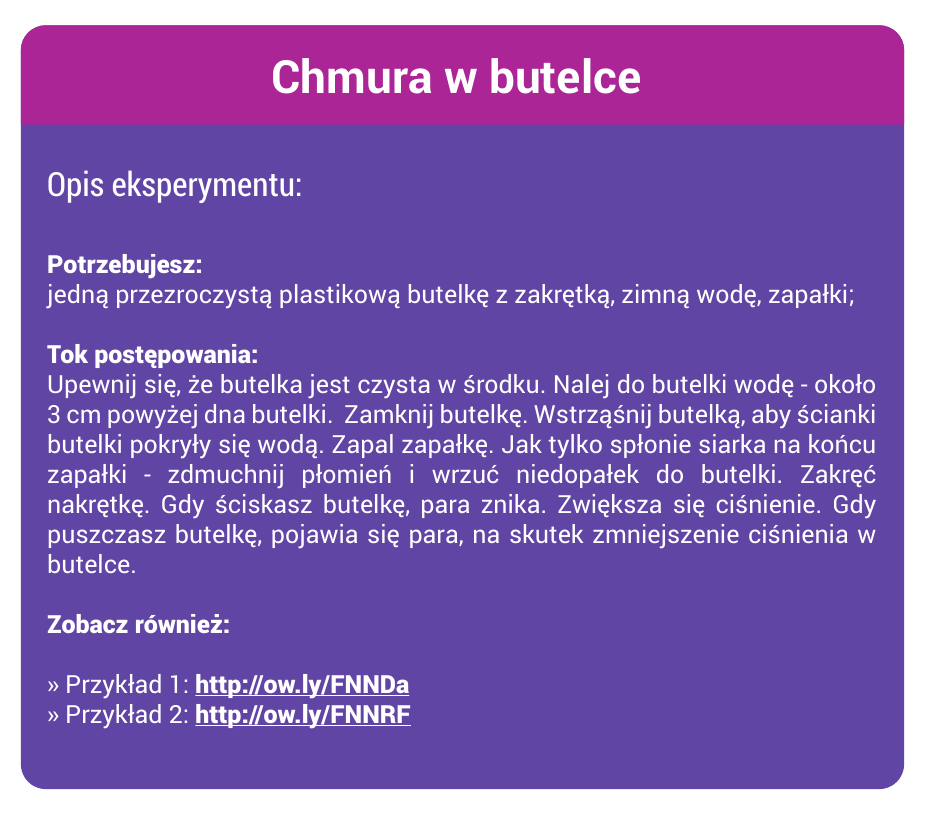 Chmura w butelce Opis eksperymentu: Potrzebujesz: jedną przezroczystą plastikową butelkę z zakrętką, zimną wodę, zapałki; Tok postępowania: Upewnij się, że butelka jest czysta w środku. Nalej do butelki wodę - około 3 cm powyżej dna butelki. Zamknij butelkę. Wstrząśnij butelką, aby ścianki butelki pokryły się wodą. Zapal zapałkę. Jak tylko spłonie siarka na końcu zapałki - zdmuchnij płomień i wrzuć niedopałek do butelki. Zakręć nakrętkę. Gdy ściskasz butelkę, para znika. Zwiększa się ciśnienie. Gdy puszczasz butelkę, pojawia się para, na skutek zmniejszenie ciśnienia w butelce. Zobacz również: » Przykład 1: http://ow.ly/FNNDa » Przykład 2: http://ow.ly/FNNRF