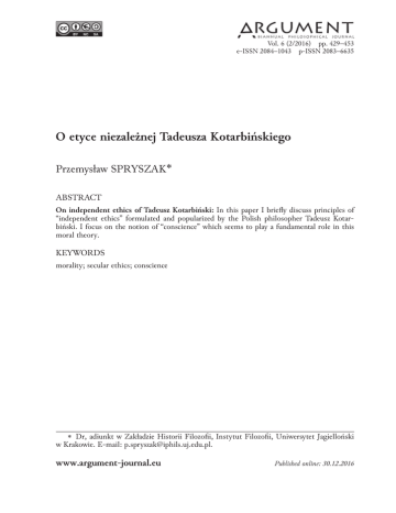 Vol. 6 (2/2016) pp. 429–453 e‑ISSN 2084–1043 p‑ISSN 2083–6635 O etyce niezależnej Tadeusza Kotarbińskiego Przemysław SPRYSZAK* ABSTRACT On independent ethics of Tadeusz Kotarbiński: In this paper I briefly discuss principles of “independent ethics” formulated and popularized by the Polish philosopher Tadeusz Kotar‑ biński. I focus on the notion of “conscience” which seems to play a fundamental role in this moral theory. KEYWORDS morality; secular ethics; conscience * Dr, adiunkt w Zakładzie Historii Filozofii, Instytut Filozofii, Uniwersytet Jagielloński w Krakowie. E‑mail: [email protected]. www.argument-journal.eu Published online: 30.12.2016 430 Przemysław SPRYSZAK Nieco ponad sto lat temu, w roku 1915, Polska Akademia Umiejętności (z sie‑ dzibą w Krakowie) wydała rozprawę doktorską Tadeusza Kotarbińskiego, zaty‑ tułowaną Utylitaryzm w etyce Milla i Spencera, napisaną pod kierunkiem Kazi‑ mierza Twardowskiego. Niedawno miniona okrągła rocznica wydania tej książki w dalszym ciągu stwarza okazję do analizy etyki niezależnej Kotarbińskiego, będącej wyrazem jego dojrzałych poglądów etycznych. W zgodnej opinii kryty‑ ków wyewoluowały one z owych rozważań nad utylitaryzmem, jakkolwiek nie wyłącznie z nich, gdyż już w roku 1913 ukazały się Szkice praktyczne, zaś rok 1914 przyniósł ważny szkic pod tytułem Utylitaryzm a etyka litości, którego au‑ tor opowiedział się za drugą przeciw pierwszemu1. Już liczba prac poświęconych przez Kotarbińskiego etyce niezależnej wskazuje, że namysł nad problematyką moralną, nadający ewangelicznej „etyce litości” coraz bardziej namacalną postać „etyki świeckiej”, pozostał ważną częścią jego filozofii. Opracowaniu i popularyzacji tego rodzaju etyki poświęcone są liczne pra‑ ce filozofa powstałe od połowy lat pięćdziesiątych ubiegłego wieku, z któ‑ rych bodaj najważniejszą stanowią Zagadnienia etyki niezależnej, opublikowane w roku 19562. Temu filozoficznemu przedsięwzięciu towarzyszyły także liczne prace komentatorów i krytyków, ogłaszane przede wszystkim na łamach Stu‑ diów Filozoficznych, Ruchu Filozoficznego, Roczników Filozoficznych oraz Etyki. Do grona autorów piszących o koncepcji Kotarbińskiego należeli tacy filozo‑ fowie jak: Henryk Elzenberg, Bronisław Baczko, Marek Fritzhand, Henryk Jankowski, księża Tadeusz Styczeń, Andrzej Szostek, Karol Wojtyła, a ponadto Andrzej Grzegorczyk, Maria Ossowska oraz Ija Lazari‑Pawłowska3. Wszystkie trzy prace przedrukowane zostały w kolejności chronologicznej w pierwszym tomie Wyboru pism Kotarbińskiego (Kotarbiński, 1959: 13–168; 178–185; 215–330). Obie wczesne prace poświęcone utylitaryzmowi można znaleźć również w: Kotarbiński, 1987: 23–88. 2 Zob. Kotarbiński, 1987: 140–149. Zapowiedzią wszystkich tych rozpraw jest szkic pt. O tak zwanej miłości bliźniego, zamieszczony w roku 1937 na łamach poświęconego opiece spo‑ łecznej Przeglądu Społecznego (Kotarbiński, 1987: 262–267). Ostatnimi pracami dotyczącymi etyki niezależnej okazały się rozprawki: Tezy etyki niezależnej i Jak i dlaczego powstała etyka nie‑ zależna z wzorcem naczelnym spolegliwego opiekuna?, opublikowane w latach 1986 i 1987, zatem po śmierci autora. Zob. Kotarbiński 1987: 194–197. 3 O ile idea etyki niezależnej znajduje wyraz w pracach Kotarbińskiego powstających od połowy lat pięćdziesiątych XX wieku, o tyle sama ta idea miała zjawić się w jego świadomości znacznie wcześniej. Barbara Stanosz, w trakcie dyskusji panelowej nad jego etyką niezależną zorganizowanej z inicjatywy Rady Krajowej Towarzystwa Kultury Świeckiej im. Tadeusza Ko‑ tarbińskiego oraz redakcji dwumiesięcznika Res Humana w marcu 2005 roku, zwróciła uwagę, że myśl o stworzeniu tego rodzaju etyki powziął on w wieku lat siedemnastu. To pierwsze uświadomienie sobie owej idei miało się dokonać za sprawą swoistego filozoficznego „olśnie‑ nia”. Zob. Wobec moralnych problemów naszych czasów — z dziedzictwa myśli Tadeusza Kotar‑ bińskiego (Panel, 2006). W kwestii rozwoju poglądów etycznych tego filozofa zob. Choroszy, 1997: 28–110. Jan F. Choroszy wyróżnia następujące fazy: okres przynależności tychże do etyki chrześcijańskiej (do roku 1901), do etyki utylitarnej (od około roku 1903–1905 do lat 1909– –1910 lub nawet roku 1907), następnie przezwyciężenie utylitaryzmu (do roku 1914), okres wątpliwości i poszukiwań, aż wreszcie sformułowanie etyki spolegliwego opiekuna (rok 1948). 1 O etyce niezależnej Tadeusza Kotarbińskiego 431 Historia szerzej pojętej „etyki niezależnej” nie sprowadza się rzecz jasna do losów koncepcji opracowanej przez Kotarbińskiego. Początkują ją bodaj już rozważania sofistów, etyka sokratejska i arystotelesowska. Można ją odnaleźć w moralistyce epikurejskiej, silnie oddziałującej na kolejne epoki, jak również w średniowiecznej via moderna, racjonalistycznym systemie Spinozy, natura‑ listycznej antropologii Thomasa Hobbesa, następnie w stanowiskach etycz‑ nych głosicieli „zmysłu moralnego”: Henry’ego More’a, lorda Shaftesbury’ego, Francisa Hutchesona oraz Davida Hume’a, tudzież u utylitarystów takich jak Jeremy Bentham, James Mill, wspomniani na początku John Stuart Mill oraz Herbert Spencer. W tę tradycję nietrudno wpisać rozważania etyczne wielu autorów dwudziestowiecznych, chociażby George’a Edwarda Moore’a czy Ber‑ tranda Russella. Z pewnymi zastrzeżeniami za etykę niezależną można uznawać stanowiska Jeana‑Jacques’a Rousseau, Immanuela Kanta czy Georga Wilhelma Friedricha Hegla. W każdej ze swych historycznych postaci mniej lub bardziej świadomie po‑ żądana i uznawana „niezależność” etyki polegała na jej logicznej, niekoniecznie jednak treściowej i genetycznej niezależności od zasad religijnych, czy to religii 
