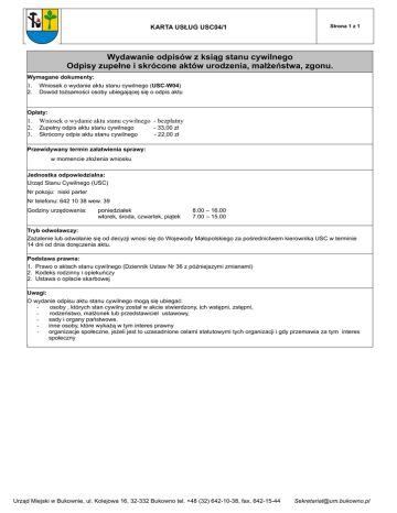 KARTA USŁUG USC04/1 Strona 1 z 1 Wydawanie odpisów z ksiąg stanu cywilnego Odpisy zupełne i skrócone aktów urodzenia, małżeństwa, zgonu. Wymagane dokumenty: 1. 2. Wniosek o wydanie aktu stanu cywilnego (USC-W04) Dowód tożsamości osoby ubiegającej się o odpis aktu Opłaty: 1. 2. 3. Wniosek o wydanie aktu stanu cywilnego - bezpłatny Zupełny odpis aktu stanu cywilnego Skrócony odpis aktu stanu cywilnego - 33,00 zł - 22,00 zł Przewidywany termin załatwienia sprawy: w momencie złożenia wniosku Jednostka odpowiedzialna: Urząd Stanu Cywilnego (USC) Nr pokoju: niski parter Nr telefonu: 642 10 38 wew. 39 Godziny urzędowania: poniedziałek wtorek, środa, czwartek, piątek 8.00 – 16.00 7.00 – 15.00 Tryb odwoławczy: Zażalenie lub odwołanie się od decyzji wnosi się do Wojewody Małopolskiego za pośrednictwem kierownika USC w terminie 14 dni od dnia doręczenia aktu. Podstawa prawna: 1. Prawo o aktach stanu cywilnego (Dziennik Ustaw Nr 36 z późniejszymi zmianami) 2. Kodeks rodzinny i opiekuńczy 2. Ustawa o opłacie skarbowej Uwagi: O wydanie odpisu aktu stanu cywilnego mogą się ubiegać: osoby , których stan cywilny został w akcie stwierdzony, ich wstępni, zstępni, rodzeństwo, małżonek lub przedstawiciel ustawowy, sady i organy państwowe, inne osoby, które wykażą w tym interes prawny organizacje społeczne, jeżeli jest to uzasadnione celami statutowymi tych organizacji i gdy przemawia za tym interes społeczny . Urząd Miejski w Bukownie, ul. Kolejowa 16, 32-332 Bukowno tel. +48 (32) 642-10-38, fax. 642-15-44 [email protected]