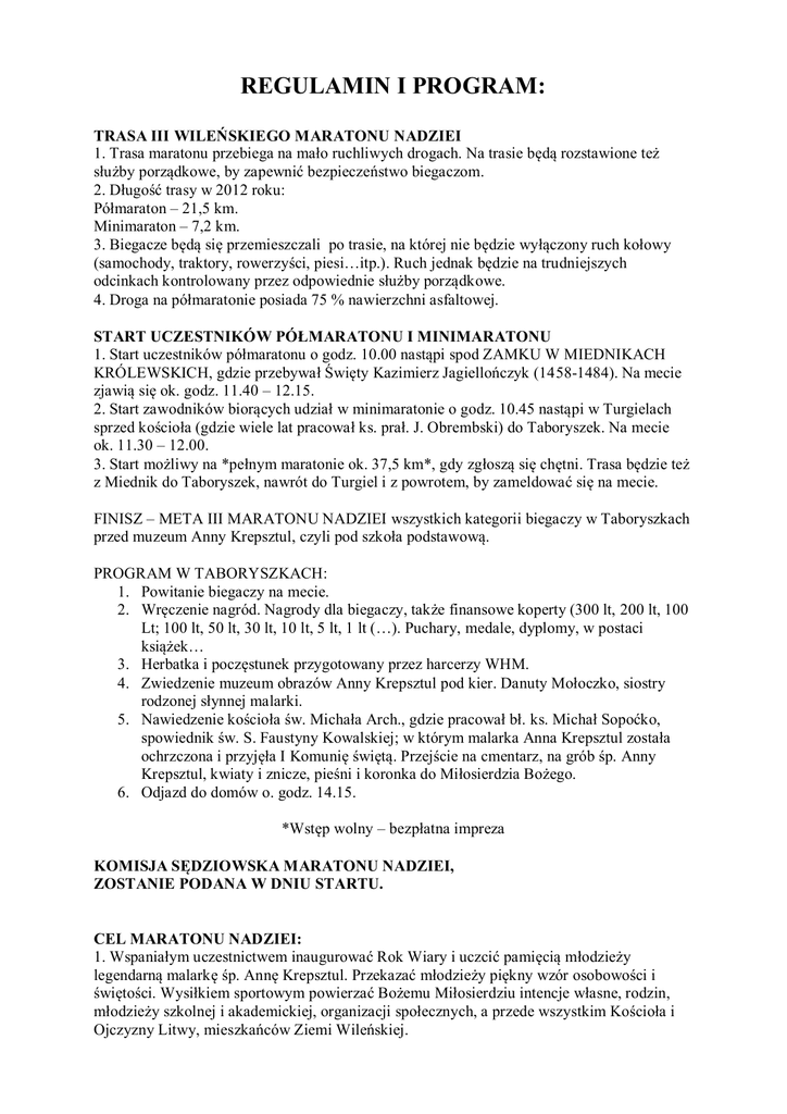 REGULAMIN I PROGRAM: TRASA III WILEŃSKIEGO MARATONU NADZIEI 1. Trasa maratonu przebiega na mało ruchliwych drogach. Na trasie będą rozstawione też służby porządkowe, by zapewnić bezpieczeństwo biegaczom. 2. Długość trasy w 2012 roku: Półmaraton – 21,5 km. Minimaraton – 7,2 km. 3. Biegacze będą się przemieszczali po trasie, na której nie będzie wyłączony ruch kołowy (samochody, traktory, rowerzyści, piesi…itp.). Ruch jednak będzie na trudniejszych odcinkach kontrolowany przez odpowiednie służby porządkowe. 4. Droga na półmaratonie posiada 75 % nawierzchni asfaltowej. START UCZESTNIKÓW PÓŁMARATONU I MINIMARATONU 1. Start uczestników półmaratonu o godz. 10.00 nastąpi spod ZAMKU W MIEDNIKACH KRÓLEWSKICH, gdzie przebywał Święty Kazimierz Jagiellończyk (1458-1484). Na mecie zjawią się ok. godz. 11.40 – 12.15. 2. Start zawodników biorących udział w minimaratonie o godz. 10.45 nastąpi w Turgielach sprzed kościoła (gdzie wiele lat pracował ks. prał. J. Obrembski) do Taboryszek. Na mecie ok. 11.30 – 12.00. 3. Start możliwy na *pełnym maratonie ok. 37,5 km*, gdy zgłoszą się chętni. Trasa będzie też z Miednik do Taboryszek, nawrót do Turgiel i z powrotem, by zameldować się na mecie. FINISZ – META III MARATONU NADZIEI wszystkich kategorii biegaczy w Taboryszkach przed muzeum Anny Krepsztul, czyli pod szkoła podstawową. PROGRAM W TABORYSZKACH: 1. Powitanie biegaczy na mecie. 2. Wręczenie nagród. Nagrody dla biegaczy, także finansowe koperty (300 lt, 200 lt, 100 Lt; 100 lt, 50 lt, 30 lt, 10 lt, 5 lt, 1 lt (…). Puchary, medale, dyplomy, w postaci książek… 3. Herbatka i poczęstunek przygotowany przez harcerzy WHM. 4. Zwiedzenie muzeum obrazów Anny Krepsztul pod kier. Danuty Mołoczko, siostry rodzonej słynnej malarki. 5. Nawiedzenie kościoła św. Michała Arch., gdzie pracował bł. ks. Michał Sopoćko, spowiednik św. S. Faustyny Kowalskiej; w którym malarka Anna Krepsztul została ochrzczona i przyjęła I Komunię świętą. Przejście na cmentarz, na grób śp. Anny Krepsztul, kwiaty i znicze, pieśni i koronka do Miłosierdzia Bożego. 6. Odjazd do domów o. godz. 14.15. *Wstęp wolny – bezpłatna impreza KOMISJA SĘDZIOWSKA MARATONU NADZIEI, ZOSTANIE PODANA W DNIU STARTU. CEL MARATONU NADZIEI: 1. Wspaniałym uczestnictwem inaugurować Rok Wiary i uczcić pamięcią młodzieży legendarną malarkę śp. Annę Krepsztul. Przekazać młodzieży piękny wzór osobowości i świętości. Wysiłkiem sportowym powierzać Bożemu Miłosierdziu intencje własne, rodzin, młodzieży szkolnej i akademickiej, organizacji społecznych, a przede wszystkim Kościoła i Ojczyzny Litwy, mieszkańców Ziemi Wileńskiej. 2. Popularyzacja i propagowanie biegu jako zdrowego trybu zycia. 3. Budzenie do aktywności młodego pokolenia w duchu wartości religijnych i patriotycznych, do bycia twórczym i odważnym samym sobą. OBOWIĄZKI I ODPOWIEDZIALNOŚĆ ORGANIZATORÓW MARATONU Organizatorzy zobowiązują się: 1. Opieka medyczna w czasie maratonu oraz po jego zakończeniu 2. Odżywianie na trasie i wszelka pomoc 3. Nagrody pieniężne głównym zwycięzcom, pamiątki i medale uczestnikom LIMIT CZASU 1. Zawodników Półmaratonu 21,5 km obowiązuje limit czasu - 3 h. Gdyby był pełny Maraton, to limit – 5,5 h. 2. Zawodnicy Półmaratonu z Miednik, którzy nie dobiegną do mety do godz. 13.00 nie będą klasyfikowani. PUNKTY ODŻYWIANIA 1.Punkty odżywiania zaopatrzone w napój izotoniczny, wodę, banany i rodzynki będą rozmieszczone co 5 kilometrów od startu z Miednik, a w mniejszych odległościach dla innych kategorii maratonu (3 km). UCZESTNICTWO 1. W „III Wileńskim Maratonie Nadziei im. Jana Pawła II” (na dystansie 21,5 km ) prawo startu mają wyłącznie osoby, które ukończyły 15 lat (rocznik 1997 już może), a w minimaratonie mogą uczestniczyć wszyscy chętni. W pełnym maratonie – ukończone 18 lat. 2. 11 października, przed startem zawodnicy otrzymują pakiety startowe zawierające m.in. numer startowy, agrafki. Zawodnik musi sam zadbać o sportowy strój dla siebie: buty biegowe, koszulka. 3. Osoba zgłoszona do biegu otrzymuje numer na 15 minut przed startem. W momencie przydzielenia biegaczowi numeru startowego powinien będzie on własnoręcznie złożyć podpis na liście startowej na podstawie dokumentu ze zdjęciem. Numer musi być widocznie umieszczony na koszulce biegacza z przodu i z tyłu. Nie wolno zgubić numeru lub przekazywać innej osobie biegnącej – w takim wypadku grozi dyskwalifikacja. 4.Warunkiem dopuszczenia zawodnika do biegu *pełny maraton 37,5 będzie złożenie podpisu pod oświadczeniem o zdolności do udziału w biegu maratońskim albo przedstawienie zaświadczenia lekarskiego o braku przeciwwskazań do udziału w biegu maratońskim i półmaraton 21,195 km. 5. Decyzje lekarzy dotyczące kontynuowania biegu podczas imprezy są ostateczne i nieodwołalne. ZGŁOSZENIA 1. Zgłoszenia osób/biegaczy przyjmowane są pod adresem [email protected] Zgłoszenia przyjmowane są włącznie do dnia 10 październik 2012 r. Zgłoszenie w ostatniej chwili też możliwe (wyjątkowo). 2. Za zgłoszenie uważa się przesłanie pocztą elektroniczną lub dostarczenie wypełnionego i podpisanego własnoręcznie przez uczestnika formularza zgłoszenia (strona www.whm.lt). W przypadku zgłoszeń przez internet, podpisy zostaną uzupełnione podczas weryfikacji przed startem maratonu. KLASYFIKACJE 1. Podczas Maratonu Nadziei - prowadzone będą następujące klasyfikacje: Pół-maraton - Open kobiety i mężczyźni; - chłopcy i dziewczęta do 18 lat (1994 – 1997 roczniki) *1994 – 1995; *1996 -1997 wyróżnienia według różnic wiekowych - kobiety i mężczyźni: 19 – 25 lat (1987-1993 roczniki ); 26 – 40 lat (1985-1971 roczniki); 41 lat i starsi Mini-maraton - Open kobiety i mężczyźni; - chłopcy i dziewczęta do 14 lat; 15-16 lat. (1996-1997 roczniki), 17-18 lat (1994-1995 roc