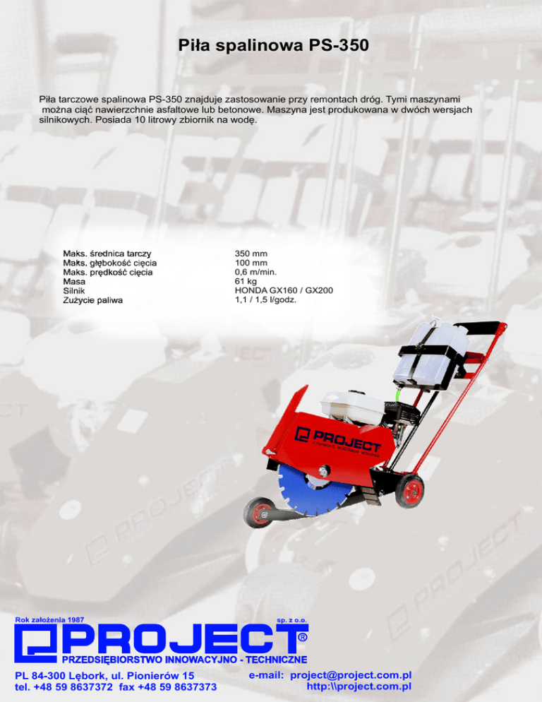 Piła spalinowa PS-350 Piła tarczowe spalinowa PS-350 znajduje zastosowanie przy remontach dróg. Tymi maszynami można ciąć nawierzchnie asfaltowe lub betonowe. Maszyna jest produkowana w dwóch wersjach silnikowych. Posiada 10 litrowy zbiornik na wodę. 350 mm 100 mm 0,6 m/min. 61 kg HONDA GX160 / GX200 1,1 / 1,5 l/godz. PL 84-300 Lębork, ul. Pionierów 15 tel. +48 59 8637372 fax +48 59 8637373 e-mail: [email protected] http:\\project.com.pl