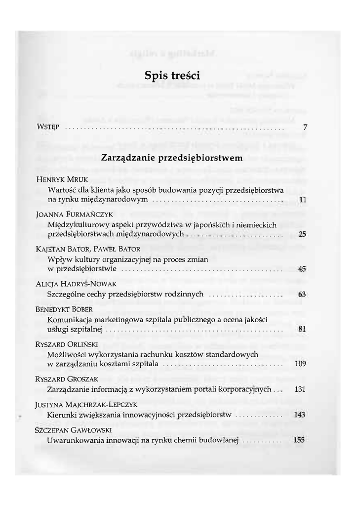 Spis treści WSTĘP 7 Zarządzanie przedsiębiorstwem HENRYK MRUK Wartość dla klienta jako sposób budowania pozycji przedsiębiorstwa na rynku międzynarodowym 11 JOANNA FURMAŃCZYK Międzykulturowy aspekt przywództwa w japońskich i niemieckich przedsiębiorstwach międzynarodowych 25 KAJETAN BATOR, PAWEŁ BATOR Wpływ kultury organizacyjnej na proces zmian w przedsiębiorstwie 45 ALICJA HADRYŚ-NOWAK Szczególne cechy przedsiębiorstw rodzinnych 63 BENEDYKT BOBER Komunikacja marketingowa szpitala publicznego a ocena jakości usługi szpitalnej 81 RYSZARD ORLIŃSKI Możliwości wykorzystania rachunku kosztów standardowych w zarządzaniu kosztami szpitala 109 RYSZARD GROSZAK Zarządzanie informacją z wykorzystaniem portali korporacyjnych .. . 131 JUSTYNA MAJCHRZAK-LEPCZYK Kierunki zwiększania innowacyjności przedsiębiorstw 143 SZCZEPAN GAWŁOWSKI Uwarunkowania innowacji na rynku chemii budowlanej 155 Marketing a religia LILIANNA NOWAK Wizerunek Matki Bożej w przekazach komercyjnych - dylematy i kontrowersje 171 JAROSŁAW SZANDURSKI Marketing personalny Jezusa z Nazaretu i Franciszka z Asyżu 197 RYSZARD GROSZAK Internet a działalność Kościoła katolickiego w Polsce NOTY O AUTORACH 215 221
