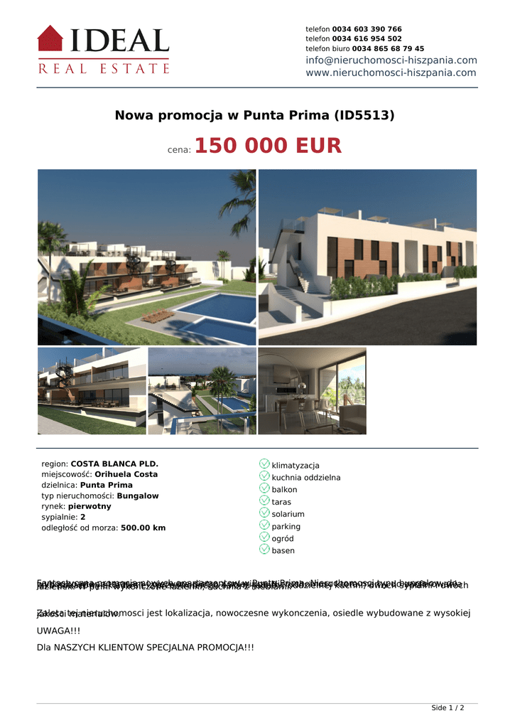 telefon 0034 603 390 766 telefon 0034 616 954 502 telefon biuro 0034 865 68 79 45 [email protected] www.nieruchomosci-hiszpania.com Nowa promocja w Punta Prima (ID5513) cena: 150 000 EUR region: COSTA BLANCA PLD. miejscowość: Orihuela Costa dzielnica: Punta Prima typ nieruchomości: Bungalow rynek: pierwotny sypialnie: 2 odległość od morza: 500.00 km klimatyzacja kuchnia oddzielna balkon taras solarium parking ogród basen Fantastyczna promocja nowych apartamentow w Punta Prima. Nieruchomosci typu do wyboru parter zsklada tarasem izpierwsze pietro zsalonu-jadalni, solarium. Nieruchomosc ktora mamy dobungalow, zaoferowania jako pokazowy sie przestronnego oddzielnej kuchni, dwoch sypialni i dwoch lazienek. W pelni wykonczone lazienki, kuchnia z meblami. Zaleta tej nieruchomosci jest lokalizacja, nowoczesne wykonczenia, osiedle wybudowane z wysokiej jakosci materialow. UWAGA!!! Dla NASZYCH KLIENTOW SPECJALNA PROMOCJA!!! Side 1 / 2 Jezeli zakupisz przez firme IDEAL zwracamy koszty przelotu do Hiszpanii!!! Nie zwlekaj, zadzwon juz dzis i umow sie na wizyte!!! www.nieruchomosci-hiszpania.com Side 2 / 2 Powered by TCPDF (www.tcpdf.org)