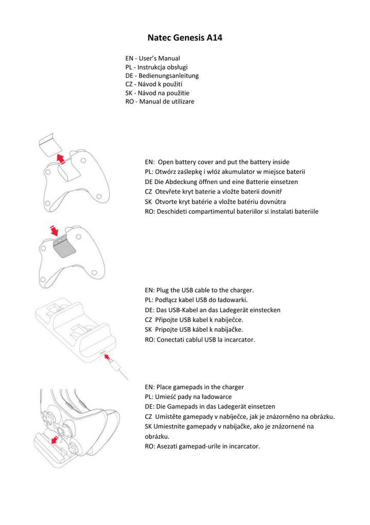 Natec Genesis A14 EN - User’s Manual PL - Instrukcja obsługi DE - Bedienungsanleitung CZ - Návod k použití SK - Návod na použitie RO - Manual de utilizare EN: Open battery cover and put the battery inside PL: Otwórz zaślepkę i włóż akumulator w miejsce baterii DE Die Abdeckung öffnen und eine Batterie einsetzen CZ Otevřete kryt baterie a vložte baterii dovnitř SK Otvorte kryt batérie a vložte batériu dovnútra RO: Deschideti compartimentul bateriilor si instalati bateriile EN: Plug the USB cable to the charger. PL: Podłącz kabel USB do ładowarki. DE: Das USB-Kabel an das Ladegerät einstecken CZ Připojte USB kabel k nabíječce. SK Pripojte USB kábel k nabíjačke. RO: Conectati cablul USB la incarcator. EN: Place gamepads in the charger PL: Umieść pady na ładowarce DE: Die Gamepads in das Ladegerät einsetzen CZ Umístěte gamepady v nabíječce, jak je znázorněno na obrázku. SK Umiestnite gamepady v nabíjačke, ako je znázornené na obrázku. RO: Asezati gamepad-urile in incarcator. EN - GENERAL INFORMATION The safe product, conforming to the EU requirements. The product is made in accordance with RoHS European standard. The standard was issued in order to decrease the amount of the electronic and electrical waste emitted into the atmosphere. The WEEE symbol (the crossed-out wheeled bin) using indicates that this product in not home waste. You protect the environment when you recycle hazardous waste appropriately. In order to get detailed information about recycling this product please contact your retailer or a local authority. PL - UWAGI Produkt bezpieczny, zgodny z wymaganiami UE. Produkt wyprodukowany zgodnie z europejską normą RoHS. Jej celem jest zmniejszenie ilości substancji niebezpiecznych, przenikających do środowiska z odpadów elektrycznych i elektronicznych. Użycie symbolu WEEE (przekreślony kosz) oznacza, że niniejszy produkt nie może być traktowany jako odpad domowy. Zapewniając prawidłową utylizację pomagasz chronić środowisko naturalne. W celu uzyskania szczegółowych informacji dotyczących recyklingu niniejszego produktu należy skontaktować się z punktem sprzedaży detalicznej, w którym dokonano zakupu lub organem władzy lokalnej. DE - WICHTIGE HINWEISE: Diese Produkt ist auf Übereinstimmung mit den Anforderungen einer EU-Richtlinie Diese Produkt wird in Übereinstimmung mit der RoHS Direktive hergestellt.RoHS ist eine Richtlinie der EU mit dem Ziel gesundheits- und umweltschädliche Substanzen in elektronischen Geräten zu reduzieren. Das Symbol der durchgestrichenen Mülltonne bedeutet, dass dieses Produkt nicht mit dem unsortierten Hausmüll entsorgt werden darf – Sie sind daher dazu verpfl ichtet, es an einer offi ziell ausgewiesenen Sammelstelle für Elektrogeräte abzugeben. Informationen zu Sammelstellen in Ihrer Nähe erhalten Sie bei örtlichen Behörden, Wertstoffhöfen oder dem Geschäft, in dem Sie dieses Produkt erworben haben. Die separate Sammlung und Verwertung alter Elektrogeräte verhindert, dass darin enthaltene Stoffe die Gesundheit des Menschen und die Umwelt gefährden. CZ - OBECNÉ INFORMACE Bezpečný výrobek splňující požadavky EU. Zařízení je vyrobené v souladu s evropskou normou RoHS, které účelem je snížení nebezpečných látek unikajících do prostředí z elektrických a elektronických odpadů. Použití symbolu WEEE (škrtnutý koš) znamená, že s těmto výrobkem nelze nakládat jak s domácím odpadem. Správným znehodnocením chráníte životní prostředí. Podrobné informace o recyklaci tohoto výrobku Vám poskytne prodejce, nebo místní orgány státní správy. SK - VŠEOBECNÉ INFORMÁCIE: Bezpečný výrobok splňujúci požiadavky EÚ. Zariadenie je vyrobené v súlade s európskou normou RoHS, ktorej účelom je zníženie nebezpečných látok unikajúcich do prostredia, z elektrických a elektronických odpadov. Použitie symbolu WEEE (škrtnutý kôš) znamená, že s týmto výrobkom nie je dovolené postupovať ako s domácim odpadom. Správnym znehodnotením chránite životné prostredie. Podrobné informácie o recyklácií tohoto výrobku Vám poskytne predajca, alebo miestne orgány štátnej správy.