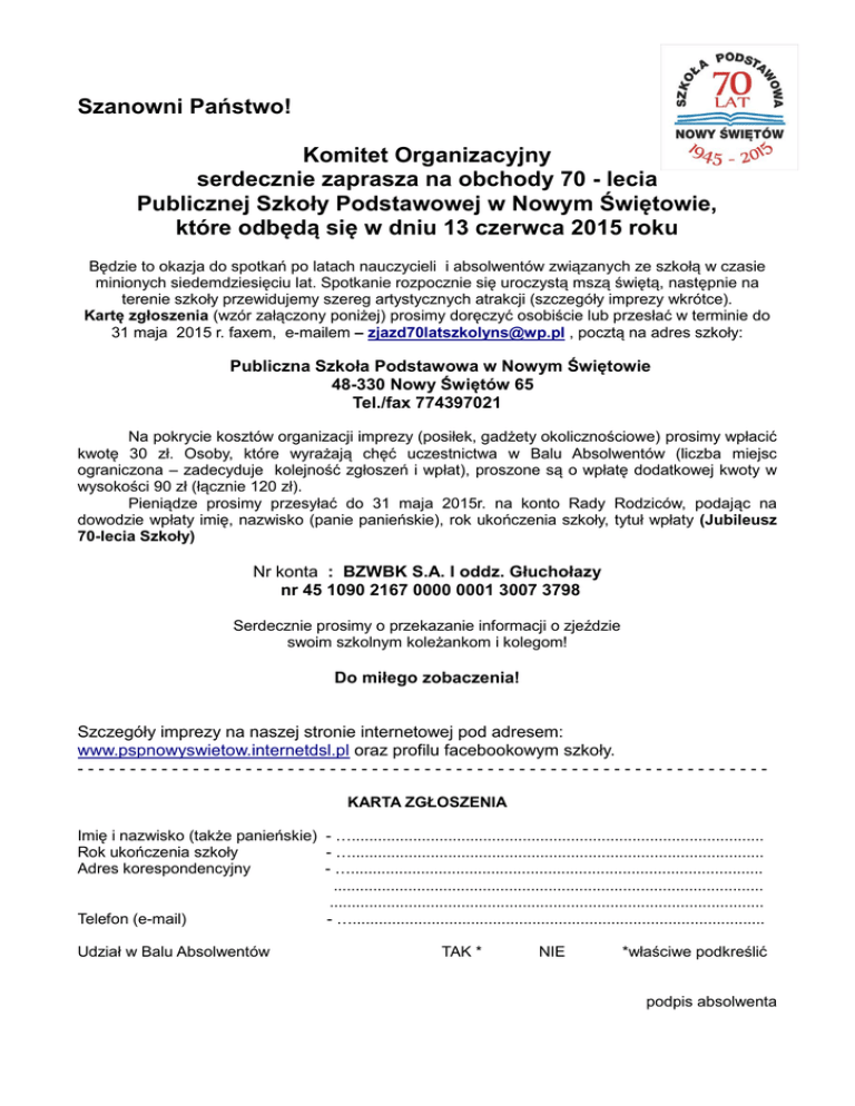 Szanowni Państwo! Komitet Organizacyjny serdecznie zaprasza na obchody 70 - lecia Publicznej Szkoły Podstawowej w Nowym Świętowie, które odbędą się w dniu 13 czerwca 2015 roku Będzie to okazja do spotkań po latach nauczycieli i absolwentów związanych ze szkołą w czasie minionych siedemdziesięciu lat. Spotkanie rozpocznie się uroczystą mszą świętą, następnie na terenie szkoły przewidujemy szereg artystycznych atrakcji (szczegóły imprezy wkrótce). Kartę zgłoszenia (wzór załączony poniżej) prosimy doręczyć osobiście lub przesłać w terminie do 31 maja 2015 r. faxem, e-mailem – [email protected] , pocztą na adres szkoły: Publiczna Szkoła Podstawowa w Nowym Świętowie 48-330 Nowy Świętów 65 Tel./fax 774397021 Na pokrycie kosztów organizacji imprezy (posiłek, gadżety okolicznościowe) prosimy wpłacić kwotę 30 zł. Osoby, które wyrażają chęć uczestnictwa w Balu Absolwentów (liczba miejsc ograniczona – zadecyduje kolejność zgłoszeń i wpłat), proszone są o wpłatę dodatkowej kwoty w wysokości 90 zł (łącznie 120 zł). Pieniądze prosimy przesyłać do 31 maja 2015r. na konto Rady Rodziców, podając na dowodzie wpłaty imię, nazwisko (panie panieńskie), rok ukończenia szkoły, tytuł wpłaty (Jubileusz 70-lecia Szkoły) Nr konta : BZWBK S.A. I oddz. Głuchołazy nr 45 1090 2167 0000 0001 3007 3798 Serdecznie prosimy o przekazanie informacji o zjeździe swoim szkolnym koleżankom i kolegom! Do miłego zobaczenia! Szczegóły imprezy na naszej stronie internetowej pod adresem: www.pspnowyswietow.internetdsl.pl oraz profilu facebookowym szkoły. -----------------------------------------------------------------KARTA ZGŁOSZENIA Imię i nazwisko (także panieńskie) - ….............................................................................................. Rok ukończenia szkoły - ….............................................................................................. Adres korespondencyjny - ….............................................................................................. .................................................................................................. ................................................................................................... Telefon (e-mail) - ….............................................................................................. Udział w Balu Absolwentów TAK * NIE *właściwe podkreślić podpis absolwenta