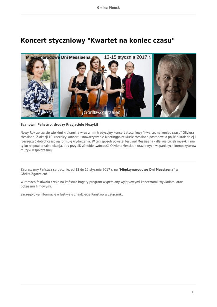 Gmina Pieńsk Koncert styczniowy "Kwartet na koniec czasu" Szanowni Państwo, drodzy Przyjaciele Muzyki! Nowy Rok zbliża się wielkimi krokami, a wraz z nim tradycyjny koncert styczniowy "Kwartet na koniec czasu" Oliviera Messiaen. Z okazji 10. rocznicy koncertu stowarzyszenie Meetingpoint Music Messiaen postanowiło pójść o krok dalej i rozszerzyć dotychczasową formułę wydarzenia. W ten sposób powstał festiwal Messiaena - dla wielbicieli muzyki i nie tylko niepowtarzalna okazja, aby przybliżyć sobie twórczość Oliviera Messiaen oraz innych wspaniałych kompozytorów muzyki współczesnej. Zapraszamy Państwa serdecznie, od 13 do 15 stycznia 2017 r. na "Międzynarodowe Dni Messiaena" w Görlitz-Zgorzelcu! W ramach festiwalu czeka na Państwa bogaty program wypełniony wyjątkowymi koncertami, wykładami oraz pokazami filmowymi. Szczegółowe informacje o festiwalu znajdziecie Państwo w załączniku. 1