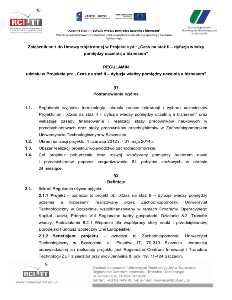 „Czas na staż II – dyfuzja wiedzy pomiędzy uczelnią a biznesem” Projekt współfinansowany ze środków Unii Europejskiej w ramach Europejskiego Funduszu Społecznego Załącznik nr 1 do Umowy trójstronnej w Projekcie pt.: „Czas na staż II – dyfuzja wiedzy pomiędzy uczelnią a biznesem” REGULAMIN udziału w Projekcie pn: „Czas na staż II – dyfuzja wiedzy pomiędzy uczelnią a biznesem” §1 Postanowienia ogólne 1.1. Regulamin wyjaśnia terminologię, określa proces rekrutacji i wyboru uczestników Projektu pn.: „Czas na staż II – dyfuzja wiedzy pomiędzy uczelnią a biznesem” oraz wskazuje zasady finansowania i realizacji staży pracowników naukowych w przedsiębiorstwach oraz staży pracowników przedsiębiorstw w Zachodniopomorskim Uniwersytecie Technologicznym w Szczecinie. 1.2. Okres realizacji projektu: 1 czerwca 2012 r. - 31 maja 2014 r. 1.3. Obszar realizacji projektu: województwo zachodniopomorskie. 1.4. Cel i projektu: pobudzenie przedsiębiorstw poprzez oraz rozwój współpracy zorganizowanie 84 pomiędzy pobytów sektorem stażowych w nauki okresie 24 miesiące. §2 Definicje 2.1. Ilekroć Regulamin używa pojęcia: 2.1.1 Projekt – oznacza to projekt pt.: „Czas na staż II – dyfuzja wiedzy pomiędzy uczelnią a biznesem” realizowany przez Zachodniopomorski Uniwersytet Technologiczny w Szczecinie, współfinansowany w ramach Programu Operacyjnego Kapitał Ludzki, Priorytet VIII Regionalne kadry gospodarki, Działanie 8.2. Transfer wiedzy, Poddziałanie 8.2.1 Wsparcie dla współpracy sfery nauki i przedsiębiorstw, Europejski Fundusz Społeczny Unii Europejskiej. 2.1.2 Beneficjent projektu Technologiczny Szczecinie, w – oznacza al. Piastów to Zachodniopomorski 17, 70-310 Szczecin. Uniwersytet Jednostką odpowiedzialną za realizację projektu jest Regionalne Centrum Innowacji i Transferu Technologii ZUT z siedzibą przy ulicy Janosika 8, pok. 19, 71-424 Szczecin. 2.1.3 Kandydat do projektu – oznacza to: a) Pracownika naukowego lub naukowo-dydaktycznego - specjalistę w określonej dziedzinie naukowej, zatrudnionego w Zachodniopomorskim Uniwersytecie Technologicznym w Szczecinie tytułem umowy o pracę lub aktu mianowania, który jest zainteresowany stażem w prywatnym przedsiębiorstwie i który złożył niezbędne dokumenty rekrutacyjne, b) Pracownika przedsiębiorstwa – osobę zatrudnioną w mikro-, małym lub średnim przedsiębiorstwie z minimum 2 letnim stażem pracy ogółem, znającą strukturę funkcjonowania swojego przedsiębiorstwa oraz posiadającą udokumentowane doświadczenie zawodowe. 2.1.4 Uczestnik projektu – oznacza to Kandydata do projektu, który jako: a) Pracownik Naukowy - wypełnił online na stronie internetowej www.innowacje.zut.edu.pl formularz zgłoszeniowy oraz pozytywnie przeszedł formalną weryfikację dokumentacji i został zakwalifikowany na podstawie oceny merytorycznej do udziału w Projekcie, a następnie dostarczył niezbędne załączniki do Umowy trójstronnej oraz podpisał ją, zyskując tym samym status Stażysty; b Pracownik przedsiębiorstwa - wypełnił online na stronie internetowej www.innowacje.zut.edu.pl formularz zgłoszeniowy oraz pozytywnie przeszedł formalną weryfikację dokumentacji i został zakwalifikowany na podstawie oceny merytorycznej do udziału w Projekcie, a następnie dostarczył niezbędne załączniki do Umowy trójstronnej oraz podpisał ją, zyskując tym samym status Stażysty; 2.1.5 Komisja rekrutacyjna – oznacza to komisję, która ocenia pod względem formalnym i merytorycznym dokumentację złożoną przez Kandydatów do projektu i dokonuje, przy zastosowaniu specjalnie w tym celu przygotowanego formularza oceny kwalifikacji do udziału w Projekcie. W skład Komisji rekrutacyjnej wchodzą: Przewodniczący komisji oraz 2 członków Komisji.. 2.1.6 Kryteria formalne – oznacza to następujące kryteria kwalifikacji do udziału w Projekcie, jakie muszą spełnić: 2.1.6.1 Pracownik Naukowy: a) zatrudnienie w Zachodniopomorskim Uniwersytecie Technologicznym w Szczecinie w charakterze pracownika naukowego lub naukowo-dydaktycznego tytułem umowy o pracę lub aktem mianowania z minimum stopniem magistra, jest uczestnikiem studiów doktoranckich (warunkiem jest zatrudnienie w ZUT), jest adiunktem lub osobą ze stanowiskiem powyżej doktora, umowa z ZUT nie może kończyć się w trakcie odbywania stażu, b) złożenie prawidłowo dokumentacji rekrutacyjnej. i zgodnie ze stanem faktycznym wypełnionej 2.1.6.2 Pracownik przedsiębiorstwa a) posiadanie minimum 2-letniego stażu pracy ogółem, posiadanie umowy o pracę w danym przedsiębiorstwie, umowa nie może kończyć się w trakcie odbywania stażu, b) złożenie prawidłowo i zgodnie ze stanem faktycznym wypełnionej dokumentacji rekrutacyjnej. 2.1.7 Staż – oznacza to okres czasu określony w Umowie trójstronnej, podczas którego Pracownik naukowy lub Pracownik przedsiębiorstwa zobowiązany jest do odbycia stażu polegającego m.in. na pogłębieniu doświadczenia zawodowego w dziedzinie nauki oraz podejścia biznesowego do komercjalizacji wyników pracy naukowej na warunkach określonych w Umowie trójstronnej oraz w Szczegółowym Harmonogramie Stażu. 2.1.8 Stażysta – oznacza to uczestnika Projektu, który jako Pracownik naukowy lub Pracownik przedsiębiorstwa realizuje postanowienia zawartej trójstronnej Umowy, Szczegółowego Harmonogramu Stażu, oraz sporządzonej na potrzeby rozliczeń Umowy stażowej. 2.1.9 Przyjmujący na staż – oznacza to prywatne przedsiębiorstwo posiadające prawną formę zarejestrowanej działalności gospodarczej które to prowadzi działalność na terenie województwa zachodniopomorskiego. Przedsiębiorstwo może mieć główną siedzibę w innych częściach Polski lub za granicą musi jednocześnie prowadzić działalność na terenie województwa zachodniopomorskiego. Dodatkowo status Przyjmującego na staż posiada również jednostka ZUT (wydział, z