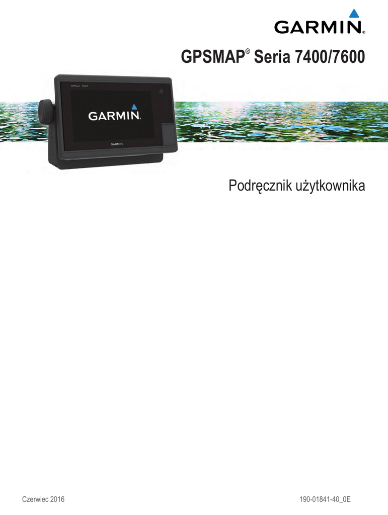 GPSMAP Seria 7400/7600 ® Podręcznik użytkownika Czerwiec 2016 190-01841-40_0E Wszelkie prawa zastrzeżone. Zgodnie z prawami autorskimi, kopiowanie niniejszego podręcznika użytkownika w całości lub częściowo bez pisemnej zgody firmy Garmin jest zabronione. Firma Garmin zastrzega sobie prawo do wprowadzenia zmian, ulepszeń do produktów lub ich zawartości niniejszego podręcznika użytkownika bez konieczności powiadamiania o tym jakiejkolwiek osoby lub organizacji. Odwiedź stronę internetową www.garmin.com, aby pobrać bieżące aktualizacje i informacje uzupełniające dotyczące użytkowania niniejszego produktu. Garmin , logo Garmin, BlueChart , g2 Vision , GPSMAP , FUSION , Ultrascroll oraz VIRB są znakami towarowymi firmy Garmin Ltd. lub jej oddziałów zarejestrowanymi w Stanach Zjednoczonych i innych krajach. Fantom™, FUSION-Link™, Garmin Helm™, Garmin LakeVü™, Garmin Nautix™, Garmin Quickdraw™, GCV™, GMR™, GRID™, GXM™, HomePort™, MotionScope™, Panoptix™, quatix , Shadow Drive™ oraz SmartMode™ są znakami towarowymi firmy Garmin Ltd. lub jej oddziałów. Wykorzystywanie tych znaków bez wyraźnej zgody firmy Garmin jest zabronione. ® ® ® ® ® ® ® ® Android™ jest znakiem towarowym firmy Google™ Inc. CZone™ jest znakiem towarowym firmy Power Products, LLC. FLIR jest zarejestrowanym znakiem towarowym firmy FLIR Systems, Inc. Logo SDHC jest znakiem towarowym firmy SD-3C, LLC. SiriusXM jest zastrzeżonym znakiem towarowym firmy SiriusXM Radio Inc. Wi‑Fi jest zastrzeżonym znakiem towarowym firmy Wi-Fi Alliance Corporation. Windows jest zastrzeżonym znakiem towarowym firmy Microsoft Corporation w Stanach Zjednoczonych i w innych krajach. Wszystkie pozostałe znaki towarowe i prawa autorskie stanowią własność poszczególnych jednostek. ® ® ® ® Spis treści Wstęp............................................................................... 1 Ogólne informacje o urządzeniu ................................................. 1 Korzystanie z ekranu dotykowego ......................................... 1 Przyciski na ekranie ............................................................... 1 Porady i skróty ....................................................................... 1 Blokowanie ekranu dotykowego ............................................ 1 Uzyskiwanie dostępu do podręcznika użytkownika w ploterze nawigacyjnym ............................................................................. 1 Pobieranie podręczników użytkownika ....................................... 1 Źródła dodatkowych informacji ................................................... 1 Wkładanie karty pamięci ............................................................. 1 Wkładanie kart pamięci ............................................................... 2 Aktualizacja oprogramowania ..................................................... 2 Ładowanie nowego oprogramowania na kartę pamięci ......... 2 Aktualizacja oprogramowania urządzenia ............................. 2 Sygnały satelitarne GPS ............................................................. 2 Wybór źródła GPS ................................................................. 2 Dostosowywanie plotera nawigacyjnego.................... 2 Ekran główny .............................................................................. 2 Dodawanie pozycji do Ulubionych ......................................... 3 Dostosowywanie stron ................................................................ 3 Dostosowywanie układu trybu SmartMode lub strony kombinacji .............................................................................. 3 Dodawanie układu SmartMode .............................................. 3 Dodawanie własnego ekranu kombinacji ............................... 3 Dostosowywanie nakładek danych ........................................ 3 Resetowanie układów stacji ................................................... 3 Zapamiętane ustawienia ............................................................. 3 Zapisywanie nowego zapamiętanego ustawienia .................. 4 Zarządzanie zapamiętanymi ustawieniami ............................ 4 Ustawianie typu jednostki ........................................................... 4 Regulowanie podświetlenia ........................................................ 4 Dostosowywanie schematu kolorów ........................................... 4 Mapy i widoki map 3D.................................................... 4 Mapa nawigacyjna i morska mapa wędkarska ........................... 4 Powiększanie i pomniejszanie przy użyciu ekranu dotykowego ............................................................................ 4 Wybór mapy ........................................................................... 4 Pomiar dystansu na mapie .................................................... 5 Symbole mapy ....................................................................... 5 Wyświetlanie innej mapy ........................................................ 5 Tworzenie punktu na mapie ................................................... 5 Wyświetlanie na mapie informacji o pozycji i o obiekcie ........ 5 Wyświetlanie szczegółowych informacji o pomocach nawigacyjnych ........................................................................ 5 Nawigacja do punktu na mapie .............................................. 5 Linia kierunku i znaczniki kątów ............................................. 5 Ustawianie linii kierunku i kursu nad dnem ....................... 5 Włączanie znaczników kątów ............................................ 6 Płatne mapy ................................................................................ 6 Wyświetlanie informacji o stacjach pływów ............................ 6 Animowane wskaźniki pływów i prądów ............................ 6 Wyświetlanie wskaźni