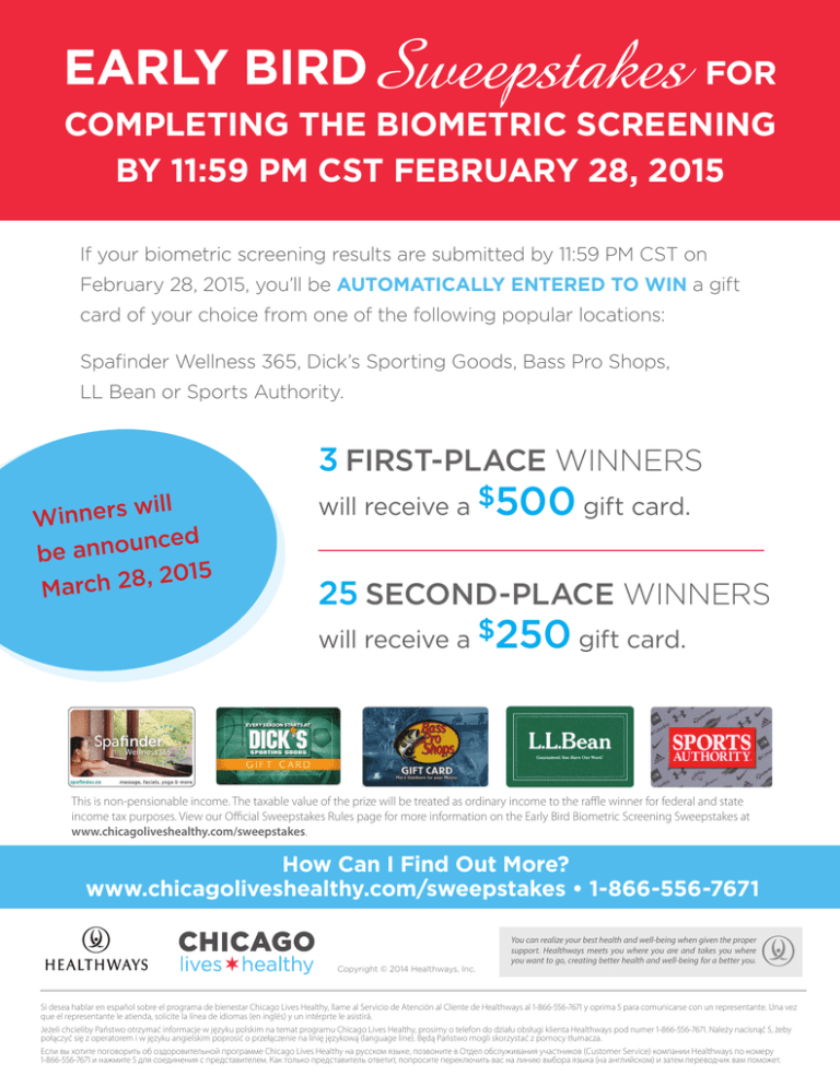 EARLY FOR EARLY BIRD BIRDSweepstakes FOR Sweepstakes FOR COMPLETING SCREENING COMPLETING COMPLETING THE THE BIOMETRIC BIOMETRIC SCREENING SCREENING BY 28,2015 2015 BY11:59 11:59 PM PM CST CST FEBRUARY FEBRUARY 28, IfIf If your yourbiometric biometricscreening screening results results are submitted PMCST CSTon on your biometric submitted by by11:59 11:59PM PM CST on February February28, 28,2015, 2015,you’ll you’llbe be AUTOMATICALLY AUTOMATICALLY ENTERED TOWIN WINaaagift gift February 28, 2015, ENTEREDTO TO WIN gift card cardof yourchoice choicefrom fromone one of of the the following following popular popularlocations: locations: card ofofyour your choice from one of the following popular locations: Spafinder SpafinderWellness Wellness365, 365,Dick’s Dick’s Sporting Sporting Goods, Goods,Bass BassPro ProShops, Shops, Spafinder Wellness 365, Dick’s Sporting Goods, Bass Pro Shops, LL LL Bean Beanor orSports SportsAuthority. Authority. LL Bean or Sports Authority. 3 FIRST-PLACE WINNERS WINNERS 33 FIRST-PLACE FIRST-PLACE WINNERS illlilll w ressrsw e n n innin i w WW r Wi ne uu dd ce ce nn o no d an e c bebeaann n u o n e b 15 15 00 ,2 ,2 8 8 2 2 h h c c 5 r r 1 a a 0 MMrch 28, 2 Ma 500 500gift giftcard. card. 500 gift card. $ $ will will receive receive a a $ will receive a 25 25 SECOND-PLACE SECOND-PLACE WINNERS WINNERS 25 SECOND-PLACE WINNERS 250 250gift giftcard. card. 250 gift card. $ will will receive receive a a$ $ will receive a ThisThis is non-pensionable is non-pensionable income. income. The Thetaxable taxablevalue valueofofthe theprize prize will will be treated treated as as ordinary ordinaryincome incometotothe theraffle raffle winner winner forfor federal federal andand state state income income taxtax purposes. purposes. View View our our Official OfficialSweepstakes SweepstakesRules Rulespage page for for more information informationon onthe theEarly EarlyBird BirdBiometric Biometric Screening Screening Sweepstakes Sweepstakes at at Thiswww.chicagoliveshealthy.com/sweepstakes. is non-pensionable income. The taxable value of the prize will be treated as ordinary income to the raffle winner for federal and state www.chicagoliveshealthy.com/sweepstakes. income tax purposes. View our Official Sweepstakes Rules page for more information on the Early Bird Biometric Screening Sweepstakes at www.chicagoliveshealthy.com/sweepstakes. How How Can Can I Find Out Out More? More? www.chicagoliveshealthy.com/sweepstakes www.chicagoliveshealthy.com/sweepstakes 1-866-556-7671 How Can I Find Out More?••1-866-556-7671 www.chicagoliveshealthy.com/sweepstakes • 1-866-556-7671 Copyright Copyright © © 2014 2014 Healthways, Healthways, Inc. Inc. You Youcan canrealize realize your your best best health health andand well-being well-being when when given given the proper the proper support. support.Healthways Healthways meets meets youyou where where youyou are are andand takestakes you you where where you youwant want toto go,go, creating creating better better health health andand well-being well-being for afor better a better you. you. You can realize your best health and well-being when given the proper support. Healthways meets you where you are and takes you where you want to go, creating better health and well-being for a better you. Copyright © 2014 Healthways, Inc. Si desea Si desea hablar hablar en español en español sobre sobre el programa el programa de de bienestar bienestar Chicago Chicago Lives LivesHealthy, Healthy,llame llamealalServicio Servicio de de Atención Atención al al Cliente Clientede deHealthways Healthwaysalal1-866-556-7671 1-866-556-7671 y oprima y oprima 5 para 5 para comunicarse comunicarse concon un representante. un representante. Una vez Una vez que elque representante el representante le atienda, le atienda, solicite solicite la línea la línea de de idiomas idiomas (en(en inglés) inglés) y un y unintérprte intérprteleleasistirá. asistirá. JeżeliJeżeli chcieliby chcieliby Państwo Państwo otrzymać otrzymać informacje informacje w języku w języku polskim polskim nana temat tematprogramu programuChicago ChicagoLives Lives Healthy, Healthy, prosimy prosimy ootelefon telefondo dodziału działuobsługi obsługiklienta klienta Healthways Healthways pod pod numer numer 1-866-556-7671. 1-866-556-7671. Należy Należy nacisnąć nacisnąć 5, żeby 5, żeby połączyć połączyć się z się operatorem z operatorem języku i w języku angielskim angielskim poprosić o Chicago przełączenie o przełączenie nalinię linięjęzykową językową (language line). Będą al Państwo Państwo mogli skorzystać skorzystać z pomocy z1-866-556-7671 pomocy tłumacza. tłumacza. Si desea hablar en españoli w sobre el programa depoprosić bienestar Livesna Healthy, llame al (language Servicio deline). Atención Clientemogli de Healthways al y oprima 5 para comunicarse con un representante. Una vez que el representante le atienda, solicite la línea de idiomas (en inglés) y un intérprte le asistirá. Если Если вы хотите вы хотите поговорить поговорить об оздоровительной об оздоровительной программе программе Chicago ChicagoLives LivesHealthy Healthyна нарусском русском языке, языке, позвоните позвоните ввОтдел Отделобслуживания обслуживанияучастников участников (Customer (Customer Service) Service) компании компании Healthways Healthways по номеру по номеру 1-866-556-7671 нажмите и нажмите 5 для 5 для соединения соединения сw представителем. сjęzyku представителем. Как Как только только представитель представитель ответит, попросите попросите переключить переклю