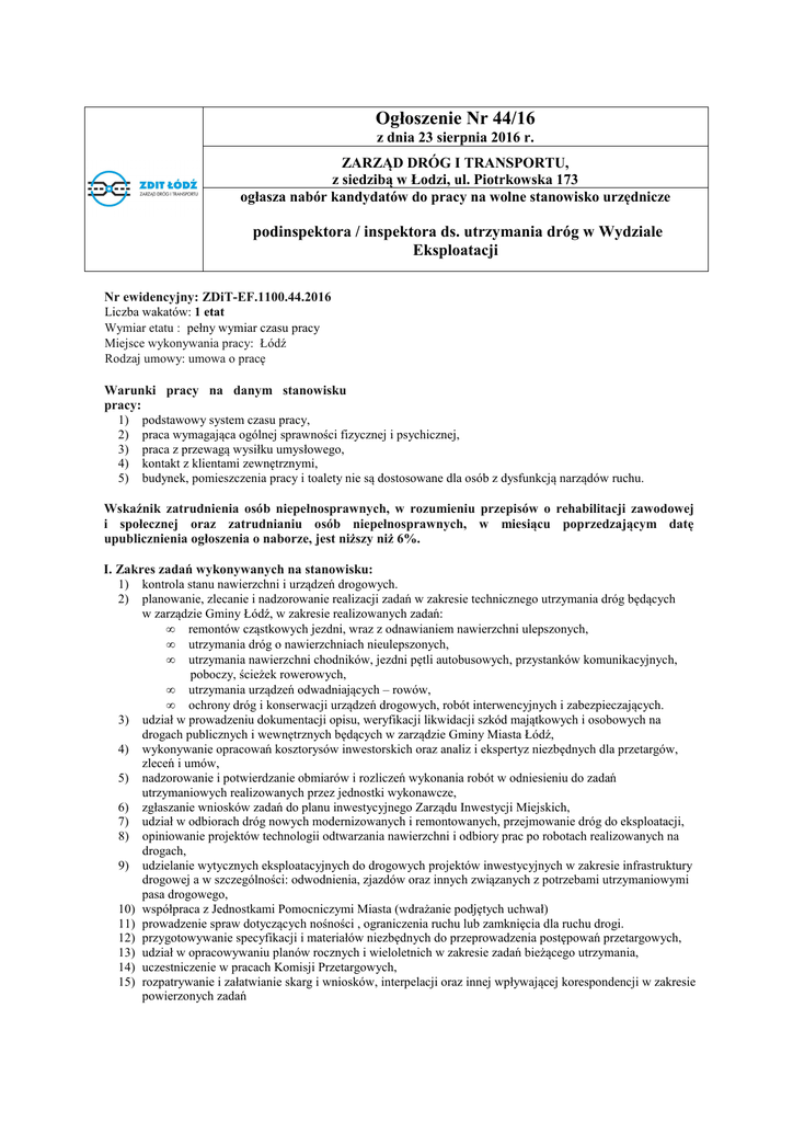 Nabór Nr 44/16 - Zarząd Dróg i Transportu