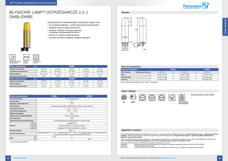 Optyczne urządzenia sygnalizujące Błyskowe lampy ostrzegawcze 2,5 J DWBL/DWBS 200 64 Lampy błyskowe do bezpośredniego montażu przy miejscu pracy • nie występuje oślepienie – jednak alarmowanie jest skuteczne • dostępne również z dopuszczeniem GL • obudowa i kątownik mocujący wykonany z solidnego, anodowanego aluminium • odporna na uderzenia pokrywa lampy • rury flash chronione dodatkowo pałąkiem stalowym Lampy błyskowe Wymiary Ø 54 30 Ø 6,5 36 50 r= 5m Zasięg sygnalizacji według EN 54 M20 + 55 °C IP 54 - 40 °C Rodzaj ochrony Temperatura robocza Dane elektryczne DWBL AC Dane do zamówienia Napięcie znamionowe 230 V AC 110 V AC 48 V AC 42 V AC 24 V AC Częstotliwość znamionowa 50 / 60 Hz 50 / 60 Hz 50 / 60 Hz 50 / 60 Hz 50 / 60 Hz 185 – 255 V 90 – 135 V 40 – 54 V 35 – 50 V 20 – 30 V 0,04 A 0,05 A 0,26 A 0,29 A 0,5 A Zakres działania Znamionowy pobór prądu Dane elektryczne DWBS DC Napięcie znamionowe 12 V DC 24 V DC 48 V DC 60 V DC 80 V DC Zakres działania 10 – 15 V 18 – 30 V 40 – 60 V 50 – 72 V 64 – 96 V 0,27 A 0,15 A 0,1 A 0,07 A 0,067 A Znamionowy pobór prądu Numery artykułów Kolor pokrywy DWBL Napięcie znamionowe DWBS 230 V AC 110 V AC 24 V DC żółty 210 05 10 3 000 210 05 16 3 000 210 05 80 3 000 pomarańczowy 210 05 10 4 000 210 05 16 4 000 210 05 80 4 000 czerwony 210 05 10 5 000 210 05 16 5 000 210 05 80 5 000 Numery artykułów pozostałych kolorów i napięć - na zapytanie Opcje / Osprzęt Dane mechaniczne DWBL Sekwencja błysków 2,5 J - 40 °C ... + 55 °C Temperatura składowania - 40 °C ... + 70 °C Wilgotność względna po 8.000.000 błyskach występuje jeszcze 70% emisji światła pokrywa poliwęglan (PC) obudowa aluminium (Al Mg Si 1) anodowany na żółto podstawa poliwęglan (PC) wzmacniany włóknem szklanym Przepust kablowy Zgodność z normami M20 x 1,5 jednoprzewodowo 0,5 – 2,5 mm , cienkoprzewodowo 0,5 – 1,5 mm , nie występuje oślepienie – jednak alarmowanie jest skutecznez tulejkami na końcach przewodów DIN 46228/1 2 Zaciski przyłączeniowe AC DC www.pfannenberg.pl Numer artykułu: 287 10 50 0 041 100% Żywotność żarowej lampy błyskowej 68 GOST IP 54 (montaż pionowy) Czas załączania przy przezroczystej pokrywie 120 90% Rodzaj ochrony według EN 60529 1 90 przezroczysty, biały, żółty, pomarańczowy, czerwony, zielony, niebieski Temperatura robocza Masa GL 8 cd 1 Kolor pokrywy Materiał 30 1 Hz = 60 błysków/min. Energia błysku Natężenie światła (DIN 5037) Dalsze informacje na stronie 104/105 DWBS 2 270 g 300 g Lampy błyskowe odpowiadają swymi właściwościami optycznymi normie europejskiej DIN EN 842 pod tytułem “Bezpieczeństwo maszyn – sygnalizacja optyczna zagrożeń“. Możliwość opcjonalnego spełnienia wymagań normy DIN EN 981 po tytułem “Bezpieczeństwo maszyn – sygnalizacja optyczno-akustyczna zagrożeń i sygnały informacyjne“. Czerwony kolor świateł jest sygnałem awaryjnym, a żółty sygnałem ostrzegawczym, co odpowiada wymaganiom normy IEC 73 / DIN EN 60073 / VDE 0199 pod tytułem “Kodowanie urządzeń sygnalizacyjnych i elementów obsługi za pomocą kolorów i pozostałych metod“. Informacje na temat optycznych sygnalizatorów zagrożenia znajdują się w normach: EN 60825-1 Bezpieczeństwo przed promieniowaniem pochodzącym od urządzeń laserowych, identyczne IEC 825 i DIN-VDE 0837 DIN EN 54Instalacje sygnalizacji pożarowej DIN 54113-2Zasady ochrony przed promieniowaniem w zastosowaniach technicznych w urządzeniach rentgenowskich do 500 kV Dalsze informacje techniczne znajdą Państwo w internecie na stronie www.pfannenberg.pl 69