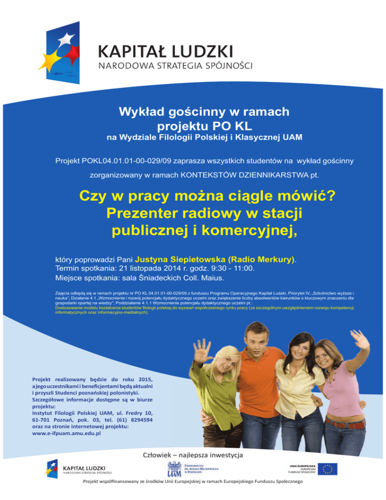 Wykład gościnny w ramach projektu PO KL na Wydziale Filologii Polskiej i Klasycznej UAM Projekt POKL04.01.01-00-029/09 zaprasza wszystkich studentów na wykład gościnny zorganizowany w ramach KONTEKSTÓW DZIENNIKARSTWA pt. Czy w pracy można ciągle mówić? Prezenter radiowy w stacji publicznej i komercyjnej, który poprowadzi Pani Justyna Siepietowska (Radio Merkury). Termin spotkania: 21 listopada 2014 r. godz. 9:30 - 11:00. Miejsce spotkania: sala Śniadeckich Coll. Maius. Zajęcia odbędą się w ramach projektu nr PO KL 04.01.01-00-029/09 z funduszu Programu Operacyjnego Kapitał Ludzki, Priorytet IV, „Szkolnictwo wyższe i nauka”; Działanie 4.1 „Wzmocnienie i rozwój potencjału dydaktycznego uczelni oraz zwiększenie liczby absolwentów kierunków o kluczowym znaczeniu dla gospodarki opartej na wiedzy”; Poddziałanie 4.1.1 Wzmocnienie potencjału dydaktycznego uczelni pt.: Dostosowanie modelu kształcenia studentów filologii polskiej do wyzwań współczesnego rynku pracy (ze szczególnym uwzględnieniem rozwoju kompetencji informatycznych oraz informacyjno-medialnych). Projekt realizowany będzie do roku 2015, a jego uczestnikami i beneficjentami będą aktualni i przyszli Studenci poznańskiej polonistyki. Szczegółowe informacje dostępne są w biurze projektu: Instytut Filologii Polskiej UAM, ul. Fredry 10, 61-701 Poznań, pok. 03, tel. (61) 8294594 oraz na stronie internetowej projektu: www.e-ifpuam.amu.edu.pl Człowiek – najlepsza inwestycja Projekt współfinansowany ze środków Unii Europejskiej w ramach Europejskiego Funduszu Społecznego