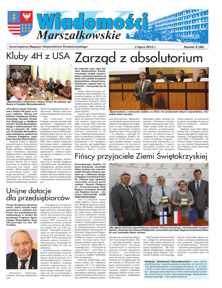 2 lipca 2012 r. Kluby 4H z USA n Amerykañscy klubowicze i liderzy Ruchu 4H podczas spotkania w Urzêdzie Marsza³kowskim. 19-osobowa grupa Amerykanów z klubów 4H goœci w naszym regionie. Wizyta jest efektem wspó³pracy Œwiêtokrzyskiego Oœrodka Doradztwa Rolniczego w Modliszewicach i Urzêdu Marsza³kowskiego z Uniwersytetem Purdue w Lafayette (St. Indiana). W Urzêdzie Marsza³kowskim klubowicze spotkali siê z Piotrem ¯o³¹dkiem, cz³onkiem Zarz¹du Województwa. Podczas wizyty w regionie œwiêtokrzyskim Amer ykanie goœciæ bêd¹ w Jêdrzejowie, Sielpi, Maleñcu, Modliszewicach i Koñskich, odwiedz¹ Stadninê Koni w Micha³owie i Hodowli Krów w Lubczy, wezm¹ udzia³ w Warsztatach Klubowych Ruchu 4H w Ostoi Dworskiej w Cieœlach, które odbywaæ siê bêd¹ pod has³em „Obraz wiejski utkany w pachn¹cym sianie”, spotkaj¹ siê równie¿ z uczniami Gimnazjum im. Jana Paw³a II w Sobkowie oraz Klubami 4H ze Szko³y Podstawowej i Zespo³u Szkó³ Ponadpodstawowych w Nowinach. Wizyta amer ykañskich klubowiczów potrwa do 7 lipca. Jak infor muje Piotr ¯o³¹dek, cz³onek Zarz¹du Województwa - wspó³praca miêdzy Uniwersytetem Purdue w Lafayette a Samorz¹dem Województwa trwa od 2005 roku. Tradycj¹ sta³o siê ju¿, ¿e w latach parzystych nasz region goœci sympatyków Ruchu 4H z USA, zaœ w latach nieparzystych grupa dzieci i m³odzie¿y wiejskiej z województwa œwiêtokrzyskiego wraz ze swymi opiekunami – liderami wolontariuszami przebywa na terenie USA. Wyjazdy studyjne realizowane s¹ w ramach programu „Kszta³towanie œwiadomoœci ekologicznej i postaw proekologicznych wœród uczniów szkó³ wiejskich zrzeszonych w klubach 4H oraz wœród mieszkañców lokalnej spo³ecznoœci województwa œwiêtokrzyskiego”. Unijne dotacje dla przedsiêbiorców Ponad 79 milionów z³otych to kwota, która zosta³a rozdysponowana w ostatnim konkursie dla przedsiêbiorców, realizowanym w ramach Regionalnego Programu Operacyjnego Województwa Œwiêtokr zyskiego na lata 2007-2013. Kazimier z Kotowski, cz³onek Zarz¹du Województwa: – Pocz¹tkowo na dofinansowanie projektów w ramach tego konkursu Zarz¹d Województwa pr zeznaczy³ 58,5 mln z³. Ale zmiany kursu euro i oszczêdnoœci w ramach realizacji RPO pozwoli³y na zwiêkszenie kwoty przeznaczonej na konkurs do poziomu prawie 79 mln 132 tys. z³otych. Pieni¹dze te wystarczy³y na dofinansowanie realizacji 94 projektów spoœród 181, które przesz³y pozytywnie ocenê formalno – mer ytor yczn¹. Pozosta³e 87 projektów trafi³o na listê rezer wow¹. Œwiêtokr zyscy pr zedsiêbiorcy zamier zaj¹ wykor zystaæ unijne dotacje m.in. na zakup nowoczesnych linii technologicznych i innowacyjnych ur z¹dzeñ, budowê centrów logistycznych, wyprowadzenie na r ynek nowych us³ug w zakresie medycyny, czy te¿ na inwestycje z zakresu energetyki odnawialnej. Numer 8 (88) Zarz¹d z absolutorium Na ostatniej sesji radni Sejmiku Województwa Œwiêtokrzyskiego przyjêli sprawozdanie z wykonania bud¿etu za 2011 rok i udzielili Zarz¹dowi Województwa absolutorium. Dwudziestu radnych by³o za, czterech – wstrzyma³o siê od g³osu. Sesja absolutor yjna poprzedzona by³a badaniem wykonania bud¿etu za 2011 rok przez Regionaln¹ Izbê Obrachunkow¹ w Kielcach, która wyda³a pozytywn¹ opiniê o jego realizacji. Takie zdanie wyrazi³a równie¿ Komisja Rewizyjna Sejmiku. Samor z¹d województwa zakoñczy³ 2011 rok z dochodami na poziomie 516 milionów z³otych, natomiast wydatki wynios³y 529 milionów z³otych (plan dochodów zostali wykonany w 89 proc., natomiast wydatków w 75 proc.). Ró¿nica miêdzy dochodami a wydatkami zosta³a pokr yta pieniêdzmi z nadwy¿ki bud¿etowej z lat ubieg³ych. Tym samym, jak podkreœla³a podczas sesji skarbnik wojew ó d z t w a M a r i a F i d z i ñ- n Sprawozdanie z wykonania bud¿etu za 2011 rok przedstawi³ radnym województwa, marsza³ek Adam Jarubas. ska–Dziurzyñska, Województwo Œwiêtokrzyskie wci¹¿ jest jedynym niezad³u¿onym regionem w kraju. Podczas dyskusji nad wykonaniem bud¿etu niektórzy radni mieli uwagi do – ich zdaniem – niskiego poziomu wydatków. Œrednio wyniós³ on 75,25 procent, przy czym wydatki bie¿¹ce zosta³y zrealizowane na poziomie 86,9 proc., a maj¹tkowe (czyli inwestycyjne) – 64,2 procent. Marsza³ek Adam Jarubas wyjaœnia³: - Realizacji bud¿etu zawsze towarzyszy wiele czynników ryzyka, które nie s¹ od nas zale¿ne: przed³u¿aj¹ce siê procesy uzyskiwania zezwoleñ œr odowiskowych, upad³oœæ firm, które realizuj¹ nasze inwestycje drogowe i koniecznoœæ wy³aniania nowych wykonawców. I z takimi sytuacjami mieliœmy do czynienia w 2011 roku. Ale gene- ralnie uwa¿am, ze wykonanie bud¿etu za ubieg³y rok jest na dobr ym poziomie – podkreœla³ marsza³ek. Podczas sesji radni zdecydowali te¿ o przejêciu prowadzenia, jako g³ówny organ prowadz¹cy, Europejskiego Centrum Bajki w Pacanowie. Do miliona z³otych rocznie zwiêkszy siê równie¿ finansowanie tej instytucji przez Samorz¹d Województwa. Fiñscy przyjaciele Ziemi Œwiêtokrzyskiej Przewodnicz¹cy Sejmiku Tadeusz Kowalczyk, marsza³ek Adam Jarubas oraz wicemarsza³ek Grzegorz Œwiercz spotkali siê z cz³onkami delegacji Regionu Centralnej Finlandii. Podczas tego spotkania marsza³ek wr êczy³ dwóm osobom - Helenie Pihlajasaari, Przewodnicz¹cej Rady Regionu Centralnej Finlandii oraz Rauliemu Sorvari - statuetki PRZYJACIEL ZIEMI ŒWIÊTOKRZYSKIEJ. Jest to oficjalna wizyta w³adz regionu, którzy odwiedzili Œwiêtokrzyskie na zaproszenie Marsza³ka Województwa Œwiêtokrzyskiego. W trakcie ca³ej wizyty zaplanowane s¹ liczne spotkania mer ytor yczne, m.in. dot. kontynuacji rozpoczêtych, wspólnych dzia³añ miêdzyregionalnych ze œwiêtokrzyskimi par tnerami (Œwiêtokrzyskim Centrum Doskonalenia Nauczycieli w Kielcach i Regionaln¹ Organizacj¹ Tur ystyczn¹), a tak¿e podjêcia nowych pr zedsiêwziêæ. Finowie bêd¹ mieli okazjê zwiedziæ nasz regio