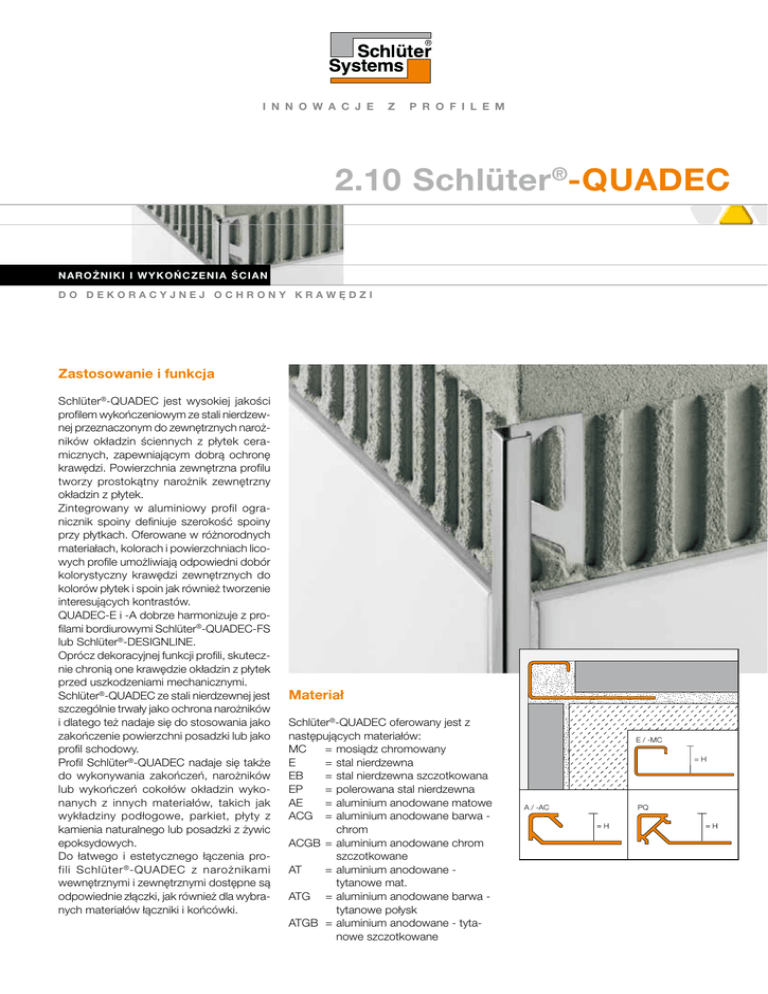 I N N O W A C J E Z P R O F I L E M 2.10 Schlüter®-QUADEC NAROŻNIKI I WYKO Ń C Z E N I A Ś C I A N DO DEKORACYJNEJ OCHRONY KRAWĘDZI Zastosowanie i funkcja Schlüter®-QUADEC jest wysokiej jakości profilem wykończeniowym ze stali nierdzewnej przeznaczonym do zewnętrznych narożników okładzin ściennych z płytek ceramicznych, zapewniającym dobrą ochronę krawędzi. Powierzchnia zewnętrzna profilu tworzy prostokątny narożnik zewnętrzny okładzin z płytek. Zintegrowany w aluminiowy profil ogranicznik spoiny definiuje szerokość spoiny przy płytkach. Oferowane w różnorodnych materiałach, kolorach i powierzchniach licowych profile umożliwiają odpowiedni dobór kolorystyczny krawędzi zewnętrznych do kolorów płytek i spoin jak również tworzenie interesujących kontrastów. QUADEC-E i -A dobrze harmonizuje z profilami bordiurowymi Schlüter®-QUADEC-FS lub Schlüter®-DESIGNLINE. Oprócz dekoracyjnej funkcji profili, skutecznie chronią one krawędzie okładzin z płytek przed uszkodzeniami mechanicznymi. Schlüter®-QUADEC ze stali nierdzewnej jest szczególnie trwały jako ochrona narożników i dlatego też nadaje się do stosowania jako zakończenie powierzchni posadzki lub jako profil schodowy. Profil Schlüter®-QUADEC nadaje się także do wykonywania zakończeń, narożników lub wykończeń cokołów okładzin wykonanych z innych materiałów, takich jak wykładziny podłogowe, parkiet, płyty z kamienia naturalnego lub posadzki z żywic epoksydowych. Do łatwego i estetycznego łączenia profili Schlüter ® -QUADEC z narożnikami wewnętrznymi i zewnętrznymi dostępne są odpowiednie złączki, jak również dla wybranych materiałów łączniki i końcówki. Materiał Schlüter®-QUADEC oferowany jest z następujących materiałów: MC =mosiądz chromowany E =stal nierdzewna EB =stal nierdzewna szczotkowana EP = polerowana stal nierdzewna AE =aluminium anodowane matowe ACG =aluminium anodowane barwa chrom ACGB =aluminium anodowane chrom szczotkowane AT =aluminium anodowane tytanowe mat. ATG =aluminium anodowane barwa tytanowe połysk ATGB =aluminium anodowane - tytanowe szczotkowane E / -MC =H A / -AC PQ 2.10 Schlüter ® -QUADEC AEX = aluminium naturalne matowe szlifowane krzyżowo anodowane AMX = aluminium mosiężne matowe szlifowane krzyżowo anodowane ATX = aluminium tytanowe matowe szlifowane krzyżowo anodowane AQGX = aluminium kwarcowe szare szlifowane krzyżowo anodowane AC =aluminium lakierowane Właściwości materiału i zakres zastosowania: Schlüter ® -QUADEC wykonywany jest z różnorodnych materiałów i posiada różne powierzchni zewnętrzne. Możliwość stosowania przewidzianego typu profilu należy sprawdzić w szczególnych, konkretnych przypadkach w zależności od spodziewanych oddziaływań chemicznych lub obciążeń mechanicznych. Poniżej podano jedynie ogólne wskazówki. Schlüter®-QUADEC-MC (mosiądz chromowany) nadaje się szczególnie do narożników ścian lub zakończeń, np. dopasowanych do chromowanych armatur łazienkowych. Powierzchnie profilu należy chronić przed ścieraniem lub zarysowaniem. Resztki zaprawy lub materiału spoinowego należy natychmiast usuwać. Schlüter®-QUADEC-E jest wysoko odporny na obciążenia i nadaje się w szczególności do obszarów zastosowań, w których należy zapewnić odporność na chemikalia i kwasy, np. w przemyśle spożywczym, w browarach, mleczarniach, kuchniach przemysłowych i szpitalach, jak również w domach prywatnych. W przypadku większych obciążeń, np. w pływalniach (woda słodka) zalecamy stosowanie stali V4A. Również stal nierdzewna nie jest odporna na wszelkie oddziaływania chemiczne, np. na kwas solny lub fluorowodorowy lub pewne roztwory chloru i soli. Należy więc uprzednio wyjaśnić możliwość występowania takich oddziaływań. W zależności od oczekiwanych obciążeń chemicznych można wybierać pomiędzy stopami 1.4301 lub 1.4404. Schlüter®-QUADEC-AE / -ACG / -ACGB / -AEX / -AMX / -ATX / -AQGX / -AT / -ATG / -ATGB (aluminium anodowane): profil aluminiowy posiada uszlachetnioną w procesie anodowania powierzchnię licową, która w normalnych warunkach użytkowych nie ulega zmianie. Powierzchnię profilu należy chronić przed ścieraniem lub zarysowaniem. Aluminium nie jest odporne na środki zasadowe. Materiały zawierające cement w połączeniu z wilgocią mają właściwości zasadowe i mogą w zależności od stężenia i czasu oddziaływania doprowadzić do korozji aluminium (oksydacja). Z tego powodu należy zaprawę i materiał spoinowy natychmiast usunąć z powierzchni licowej i powierzchni świeżo wykonanych okładzin nie należy przykrywać folią. Profil osadzić w całości w warstwie kontaktowej przy płytce, w taki sposób, aby nie powstawały komory, w których mogłaby zbierać się woda. Schlüter®-QUADEC-AC (aluminium powlekane barwnie): aluminium po obróbce wstępnej (chromowanie) i powlekane proszkowym lakierem poliuretanowym. Powłoka jest odporna na promieniowanie UV i warunki atmosferyczne. Widoczne powierzchnie należy chronić przed ścieraniem lub zarysowaniem. Obróbka 1.Schlüter®-QUADEC dobrać odpowiednio do grubości płytek. 2.W miejscach wykończenia okładziny, nanieść klej przy zastosowaniu kielni ząbkowanej. W przypadku mocowania Schlüter ®-QUADEC na zewnętrznym narożniku ściany, najpierw należy wykonać okładzinę ceramiczną jednej ściany i następnie w obszarze krawędzi drugiej ściany nanieść klej do płytek. 3.Perforowane ramię mocujące profilu Schlüter®-QUADEC osadzić w warstwie kleju i odpowiednio ustawić. 4.Perforowane ramię mocujące w całości zaszpachlować klejem do płytek i wypełnić nim otwartą komorę profilu. 5.Graniczące z profilem płytki mocno docisnąć i tak ułożyć, aby licowały one z górną krawędzią profilu. Płytki graniczące z profilem muszą być na całej powierzchni zatopione w warstwie kleju. 6.Płytki dokłada się do bocznego ogr