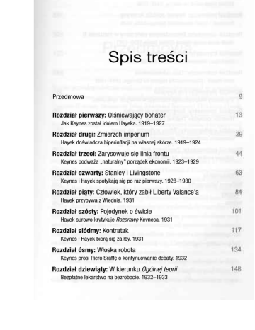 Spis treści Przedmowa Rozdział pierwszy: Olśniewający bohater Jak Keynes został idolem Hayeka. 1919-1927 Rozdział drugi Zmierzch imperium Hayek doświadcza hiperinflacji na własnej skórze. 1919-1924 Rozdział trzeci: Zarysowuje się linia frontu Keynes podważa „naturalny" porządek ekonomii. 1923-1929 Rozdział czwarty: Stanley i Livingstone Keynes i Hayek spotykają się po raz pierwszy. 1928-1930 Rozdział piąty: Człowiek, który zabił Liberty Valance'a Hayek przybywa z Wiednia. 1931 Rozdział szósty: Pojedynek o świcie Hayek surowo krytykuje Rozprawę Keynesa. 1931 Rozdział siódmy: Kontratak Keynes i Hayek biorą się za łby. 1931 Rozdział ósmy: Włoska robota Keynes prosi Piero Sraffę o kontynuowanie debaty. 1932 Rozdział dziewiąty: W kierunku Ogólnej teorii Bezpłatne lekarstwo na bezrobocie. 1932-1933 8 / SPIS TREŚCI Rozdział dziesiąty: Hayek oddaje pole Ogólna teoria 165 czeka na reakcję. 1932-1936 Rozdział jedenasty: Keynes podbija Amerykę 183 Roosevelt i młodzi ekonomiści Nowego Ładu. 1936 Rozdział dwunasty: Beznadziejnie uwięziony w rozdziale 6 Hayek pisze swoją własną Ogólną teorię. 202 1936-1941 Rozdział trzynasty: Droga donikąd 221 Hayek łączy lekarstwa Keynesa na tyranię. 1937-1946 Rozdział czternasty: Lata odosobnienia 243 Mont Pelerin i przeprowadzka Hayeka do Chicago. 1944-1969 Rozdział piętnasty: Era Keynesa 265 Trzy dekady niespotykanego dobrobytu w Ameryce. 1946-1980 Rozdział szesnasty: Kontrrewolucja Hayeka 290 Friedman, Goldwater, Thatcher i Reagan. 1963-1988 Rozdział siedemnasty: Bitwa wybucha na nowo 312 Ekonomiści słodkowodni i słonowodni. 1989-2008 Rozdział osiemnasty: Zwycięzcą jest... 333 Unikanie wielkiej recesji. Od roku 2008 Podziękowania Wybrana bibliografia Przypisy Indeks 346 349 358 426
