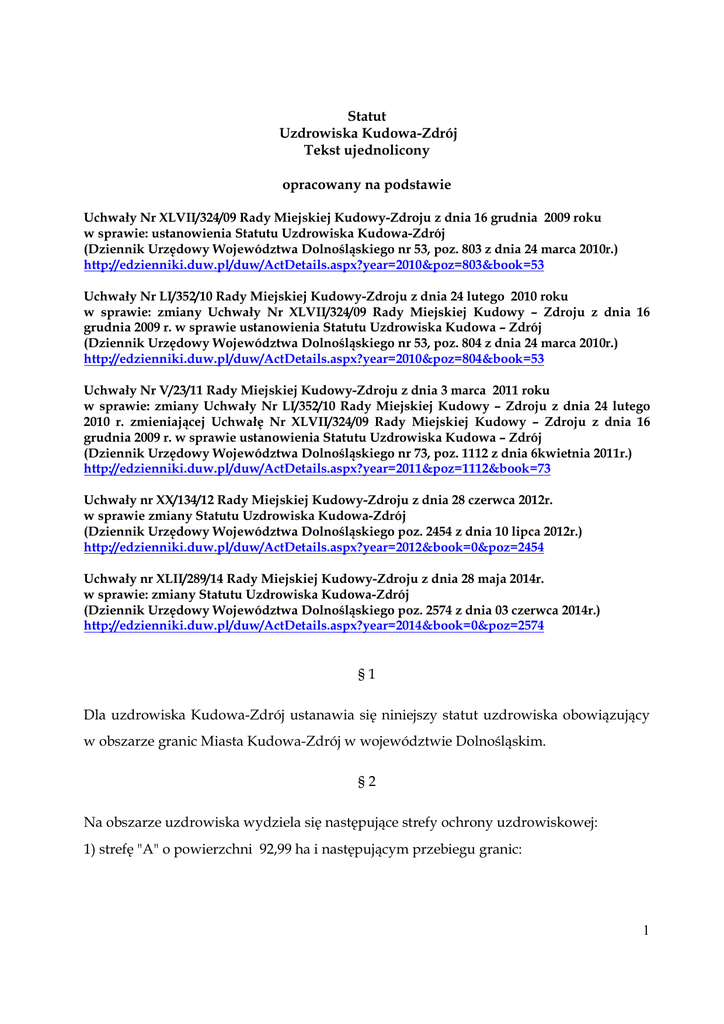 Statut Uzdrowiska Kudowa-Zdrój Tekst ujednolicony opracowany na podstawie Uchwały Nr XLVII/324/09 Rady Miejskiej Kudowy-Zdroju z dnia 16 grudnia 2009 roku w sprawie: ustanowienia Statutu Uzdrowiska Kudowa-Zdrój (Dziennik Urzędowy Województwa Dolnośląskiego nr 53, poz. 803 z dnia 24 marca 2010r.) http://edzienniki.duw.pl/duw/ActDetails.aspx?year=2010&poz=803&book=53 Uchwały Nr LI/352/10 Rady Miejskiej Kudowy-Zdroju z dnia 24 lutego 2010 roku w sprawie: zmiany Uchwały Nr XLVII/324/09 Rady Miejskiej Kudowy – Zdroju z dnia 16 grudnia 2009 r. w sprawie ustanowienia Statutu Uzdrowiska Kudowa – Zdrój (Dziennik Urzędowy Województwa Dolnośląskiego nr 53, poz. 804 z dnia 24 marca 2010r.) http://edzienniki.duw.pl/duw/ActDetails.aspx?year=2010&poz=804&book=53 Uchwały Nr V/23/11 Rady Miejskiej Kudowy-Zdroju z dnia 3 marca 2011 roku w sprawie: zmiany Uchwały Nr LI/352/10 Rady Miejskiej Kudowy – Zdroju z dnia 24 lutego 2010 r. zmieniającej Uchwałę Nr XLVII/324/09 Rady Miejskiej Kudowy – Zdroju z dnia 16 grudnia 2009 r. w sprawie ustanowienia Statutu Uzdrowiska Kudowa – Zdrój (Dziennik Urzędowy Województwa Dolnośląskiego nr 73, poz. 1112 z dnia 6kwietnia 2011r.) http://edzienniki.duw.pl/duw/ActDetails.aspx?year=2011&poz=1112&book=73 Uchwały nr XX/134/12 Rady Miejskiej Kudowy-Zdroju z dnia 28 czerwca 2012r. w sprawie zmiany Statutu Uzdrowiska Kudowa-Zdrój (Dziennik Urzędowy Województwa Dolnośląskiego poz. 2454 z dnia 10 lipca 2012r.) http://edzienniki.duw.pl/duw/ActDetails.aspx?year=2012&book=0&poz=2454 Uchwały nr XLII/289/14 Rady Miejskiej Kudowy-Zdroju z dnia 28 maja 2014r. w sprawie: zmiany Statutu Uzdrowiska Kudowa-Zdrój (Dziennik Urzędowy Województwa Dolnośląskiego poz. 2574 z dnia 03 czerwca 2014r.) http://edzienniki.duw.pl/duw/ActDetails.aspx?year=2014&book=0&poz=2574 §1 Dla uzdrowiska Kudowa-Zdrój ustanawia się niniejszy statut uzdrowiska obowiązujący w obszarze granic Miasta Kudowa-Zdrój w województwie Dolnośląskim. §2 Na obszarze uzdrowiska wydziela się następujące strefy ochrony uzdrowiskowej: 1) strefę "A" o powierzchni 92,99 ha i następującym przebiegu granic: 1 a) rozpoczyna się od punktu nr I, stanowiącego przecięcie ul. Zdrojowej z Aleją Jana Pawła II, granica obszaru „A” biegnie północno-wschodnią stroną Alei Jana Pawła II w kierunku ul. Kościuszki; b) następnie granica strefy skręca przy punkcie nr II w kierunku północnowschodnim w stronę Stawu Zdrojowego przed dz. nr 7/3, następnie biegnie drogą gminną (częścią grobli Stawu Zdrojowego), w punkcie nr III na wysokości stawu skręca w kierunku północno zachodnim po granicy dz. 5/1 z dz. 5/3, aŜ do przecięcia z ciekiem wodnym rzeczki Trzemeszna wypływającej ze stawu; c) od punktu IV przebiega po północnym brzegu w/w rzeczki do przecięcia z dz. 454, dalej po granicy dz. 454 z dz. 451, wzdłuŜ południowej krawędzi drogi gminnej przebiegającej pomiędzy działkami 457 i 456 do przecięcia z drogą gminną w punkcie V; d) następnie po północnych granicach dz. 44, 45, 6 i 492 do skrzyŜowania z dz. 490/5, w tym miejscu oznaczonym nr VI skręca w kierunku północnym wzdłuŜ ulicy Kościuszki /po jej wschodniej stronie / przy granicach działek 64 i 63; e) w punkcie VII skręca wzdłuŜ granicy północnej działki 63 i 56 do punktu VIII , w tym miejscu przebiega dalej w kierunku wschodnim po granicy północnej działek 56, 57, 59, 60, 61 do punktu IX, gdzie skręca pod kątem prostym w kierunku południowo – zachodnim wzdłuŜ granicy działki 61, aŜ do punktu X na styku z działką 71; f) okala działkę 71 /ze znajdującą się anteną przekaźnikową Telewizyjnego Ośrodka Nadawczego – w punktach oznaczonych XI i XII/ do zachodniego naroŜnika dz. 71, omijając teren wieŜy; g) następnie przebiega do końca pasa drogowego ul. Moniuszki i tu granica przecina teren leśny dz. 289 i przebiega do punktu przecięcia dz. 189 z dz. 180, wzdłuŜ granicy dz. 180 z dz. 181 do punktu nr XIII skrzyŜowania z ulicą Okrzei; h) następnie wzdłuŜ z dojazdową drogą gminną do punktu XIV, po granicy tejŜe drogi z dz. 179/2 i 178/24 do skrzyŜowania ul. 1 Maja punkt nr XV; 2 i) następnie wzdłuŜ północnej krawędzi ulicy 1 Maja do punktu nr XVI skrzyŜowania z ul. Warszawską, dalej południowo-zachodnią krawędzią ul. Warszawskiej do skrzyŜowania z ulica Chopina – punkt XVII, po granicy dz. 196 aŜ do naroŜnika dz. 195; j) następnie po granicy dz. 3/2 i 4 do punktu XVIII, okalając działkę 4 styka się z ulicą Słoneczną w punkcie XIX; k) następnie przebiega wzdłuŜ ulicy Słonecznej /jej wschodnia krawędzią / do styku z działką nr 2 – punkt XX, w tym miejscu skręca w kierunku zachodnim do punktu przecięcia z działką nr 6 – punkt XXI skręca wzdłuŜ /zachodniej krawędzi/ ulicy Kombatantów do naroŜnika działki 260/4, w punkcie nr XXII nawraca wzdłuŜ południowej granicy dz. 260/4 i 259 aŜ do pasa drogowego ulicy J. Słowackiego; l) następnie przebiega po granicy dz. 268/3 do punktu nr XXIII, gdzie skręca w kierunku północno zachodnim wzdłuŜ granicy dz. 268/3, 268/2, 268/1, 269 i 270, w punkcie nr XXIV wzdłuŜ krawędzi ulicy J. Słowackiego; m) następnie przechodzi skosem przez dz. 229/7 do południowej krawędzi drogi dojazdowej do Szpitala Uzdrowiskowego /24 Szpital Wojskowy/ i następnie łączy się z punktem wyjścia nr I. 2) strefę "B " o powierzchni o powierzchni 367,49 ha i następującym przebiegu granic: a) od punktu stanowiącego przecięcie ul. Zdrojowej z ul. Nad Potokiem rozpoczyna przebieg w kierunku zachodnim, wzdłuŜ północnej krawędzi ul. Nad Potokiem; b) w odległości ok. 500 m od w/w punktu skręca w kierunku północnym przy naroŜniku działki nr 115/1 w ulicę bez nazwy /działka nr 108/, dalej przebiega wzdłuŜ działek: 115/2, 115/5, 115/20, 115/8, 115/13, 115/14, 115/19, 110, 109, aŜ do styku prostopadłego z pasem granicznym /działka nr 17/, następnie przebiega 