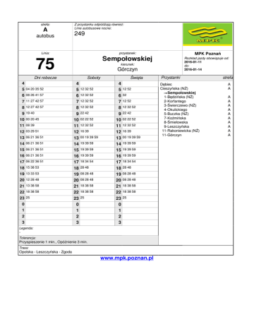strefa: A autobus Z przystanku odjeżdżają również: Linie autobusowe nocne: 249 Linia: 75 Dni robocze 4 5 04 20 35 52 6 08 26 41 57 7 11 27 42 57 8 12 27 42 57 9 19 40 10 00 20 45 11 08 39 12 03 29 51 13 06 21 36 51 14 06 21 36 51 15 06 21 36 51 16 06 21 36 51 17 06 22 36 51 18 15 38 53 19 13 33 53 20 12 28 48 21 13 38 58 22 18 38 58 23 25 0 1 2 3 Sempołowskiej Rozkład jazdy obowiązuje od: 2016-01-11 do: 2016-01-14 kierunek: Górczyn 4 5 6 7 8 9 10 11 12 13 14 15 16 17 18 19 20 21 22 23 0 1 2 3 Soboty 12 32 52 12 32 52 12 32 52 12 32 52 22 42 02 22 52 12 32 52 16 39 00 19 39 59 19 39 59 19 39 59 19 39 59 18 34 54 28 48 08 28 48 08 28 48 18 38 58 18 38 58 25 4 5 6 7 8 9 10 11 12 13 14 15 16 17 18 19 20 21 22 23 0 1 2 3 Święta 12 52 32 12 52 12 32 52 22 42 02 22 52 12 32 52 16 39 00 19 39 59 19 39 59 19 39 59 19 39 59 18 34 54 28 48 08 28 48 08 28 48 18 38 58 18 38 58 25 Legenda: - Tolerancja: Przyspieszenie 1 min., Opóźnienie 3 min. Trasa: Opolska - Leszczyńska - Zgoda MPK Poznań przystanek: www.mpk.poznan.pl Przystanki Dębiec Cieszyńska (NŻ) →Sempołowskiej 1-Będzińska (NŻ) 2-Korfantego 3-Świerczewo (NŻ) 4-Okulickiego 5-Buczka (NŻ) 7-Koźmińska 8-Śmiełowska 9-Leszczyńska 11-Rakoniewicka (NŻ) 11-Górczyn strefa A A A A A A A A A A A A