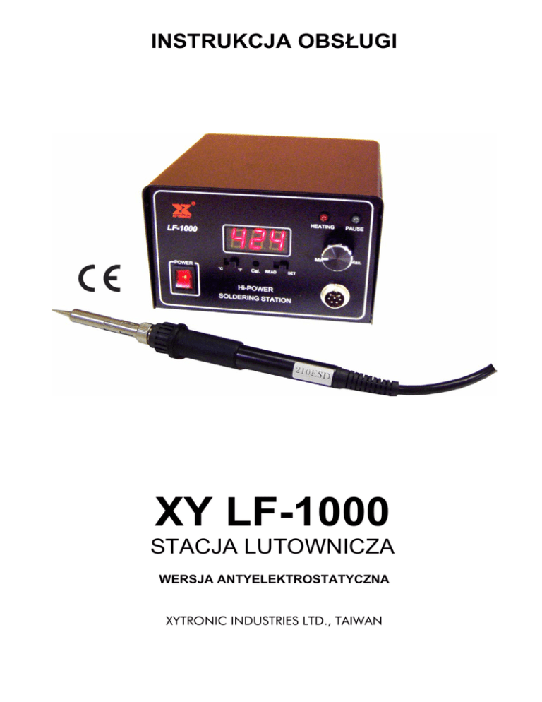 INSTRUKCJA OBSŁUGI XY LF-1000 STACJA LUTOWNICZA WERSJA ANTYELEKTROSTATYCZNA XYTRONIC INDUSTRIES LTD., TAIWAN Spis treści: 1. 2. 3. 4. 5. 6. 7. 8. 9. 10. str. CHARAKTERYSTYKA ZESTAWU..................................................................................3 OPIS ZESTAWU .............................................................................................................5 DANE TECHNICZNE ......................................................................................................6 TEMPERATURA PRACY ................................................................................................6 OBSŁUGA .......................................................................................................................7 5.1. Przygotowanie do pracy .....................................................................................7 5.2. Obsługa..............................................................................................................7 GROTY............................................................................................................................9 6.1. Przyczyny nieprawidłowego kontaktu lutowia z grotem......................................9 6.2. Konserwacja grotów...........................................................................................9 6.3. Wymiana grota .................................................................................................10 6.4. Nowy grot .........................................................................................................10 PRACA Z RĄCZKĄ PINCETOWĄ.................................................................................10 KONSERWACJA...........................................................................................................11 ZESTAW WYMIENNYCH GROTÓW ............................................................................12 9.1. GROTY DO LUTOWANIA................................................................................12 9.2. GROTY SMD DO ZESTAWÓW XYTRONIC....................................................12 9.3. GROTY SMD DO KOŃCÓWKI PINCETOWEJ TWZ100 .................................14 OCHRONA ŚRODOWISKA ..........................................................................................15 -2- GRATULUJEMY ZAKUPU STACJI LUTOWNICZEJ XY LF-1000 Stacja lutownicza XY LF-1000 firmy Xytronic została zaprojektowana tak, aby zaspokoić obecne i przyszłe potrzeby przemysłu elektronicznego. Liczne zalety produktów firmy Xytronic powodują, że są to idealne narzędzia zarówno w serwisie, jak i w produkcji. Przed przystąpieniem do uruchomienia i obsługi urządzenia należy uważnie przeczytać instrukcję obsługi. UWAGA • Urządzenie nie jest przeznaczone do obsługi przez dzieci lub osoby, które nie są w stanie posługiwać się urządzeniem w sposób bezpieczny ze względu na brak predyspozycji psychicznych lub manualnych. • Urządzenie należy trzymać z dala od dzieci. 1. CHARAKTERYSTYKA ZESTAWU OSZCZĘDNOŚĆ ENERGII Stacja lutownicza automatycznie przełącza się w stan czuwania po 15 minutach bezczynności. Przejście w stan czuwania sygnalizowany jest poprzez zaświecenie diody PAUSE a temperatura grota spada do ½ wartości ustawionej temperatury, co pozwala na zaoszczędzenie energii elektrycznej oraz grota. Należy zwrócić uwagę, że lutowie bezołowiowe wymaga wyższej temperatury lutowania, co skraca żywotność grota. Użycie rączki lutowniczej spowoduje przełączenie stacji lutowniczej z trybu czuwania do trybu normalnego pracy i wzrost temperatury grota do ustawionej wartości. CYFROWY WYŚWIETLACZ TEMPERATURY Wartość ustawionej temperatury oraz temperatury rzeczywistej grota jest wyświetlana na wyświetlaczu cyfrowym. Przełącznik znajdujący się poniżej wyświetlacza READ/SET służy do zmiany rodzaju wskazania na rzeczywistą wartość temperatury grota odczytaną za pomocą czujnika temperatury READ lub wartość temperatury ustawioną przez użytkownika SET. PRZEŁĄCZNIK JEDNOSTKI WSKAZANIA Przełącznik znajdujący się poniżej wyświetlacza ºC/ºF służy do przełączania jednostki wskazania w ºC lub ºF. -3- PODSTAWKA LUTOWNICZA Z CZYŚCIKIEM GROTÓW Czyścik grotów, wykonany z wiórów mosiężnych spełnia wymagania dyrektywy RoHS i pozwala na lepsze czyszczenie grota bez użycia wody, nie powodując jego ścierania. BEZPIECZNE ZASILANIE Obwód wtórny zasilania stacji i elementu grzejnego jest galwanicznie izolowany poprzez transformator od sieci zasilającej. Do zasilania stacji i elementu grzejnego wykorzystywane jest niskie napięcie 32V AC. Rączka lutownicza 210ESD ze względu na bezpieczeństwo, zasilana jest napięciem 32V. Element grzejny o mocy 100W pozwala na bardzo szybkie nagrzewanie i ustalanie ustawionej temperatury. OCHRONA ANTYELEKTROSTATYCZNA I UKŁADY ELEKTRONICZNE NIE WYTWARZAJĄCE PRZEPIĘĆ Układ włączania w „zerze” chroni wrażliwe elementy elektroniczne (np. układy CMOS) przed chwilowymi impulsami napięciowymi występującymi w urządzeniach nie posiadających tego zabezpieczenia. ZEWNĘTRZNY PORT KALIBRACYJNY Umożliwia łatwą i szybką kalibrację układu regulacji temperatury za pomocą płaskiego wkrętaka. ODŁACZANY PRZEWÓD ZASILAJĄCY Stacja lutownicza została wyposażona w gniazdo zasilania AC z odłączanym przewodem zasilającym, umożliwiającym dostosowanie wtyku do gniazdka instalacji zasilającej odpowiadającego wymaganiom normy CE dla danego kraju. OPCJONALNA RĄCZKA PINCETOWA I POCHŁANIACZ OPARÓW Opcjonalnym wyposażeniem zestawu XY LF-1000 jest rączka pincetowa TWZ100 [nr kat. 201047], która została zaprojektowana specjalnie dla elementów SMD, SOT, FLAT PACK itd. Rączka pincetowa została wyposażona w 2 grzałki z precyzyjnie nawiniętego drutu chromonikielinowego 32V / 2x50W i może pracować zamiennie z rączką lutowniczą typu 210ESD. Przed wymianą raczki lutowniczej należy upewnić się, 