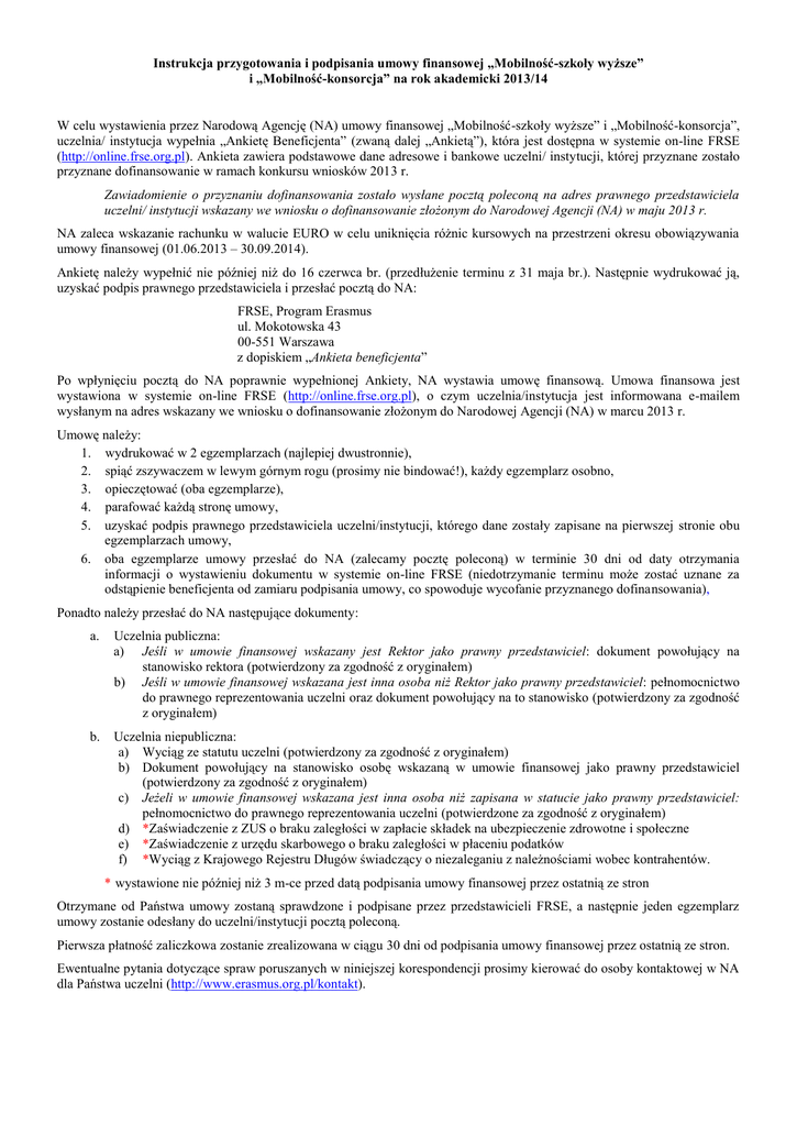 Instrukcja przygotowania i podpisania umowy finansowej „Mobilność-szkoły wyższe” i „Mobilność-konsorcja” na rok akademicki 2013/14 W celu wystawienia przez Narodową Agencję (NA) umowy finansowej „Mobilność-szkoły wyższe” i „Mobilność-konsorcja”, uczelnia/ instytucja wypełnia „Ankietę Beneficjenta” (zwaną dalej „Ankietą”), która jest dostępna w systemie on-line FRSE (http://online.frse.org.pl). Ankieta zawiera podstawowe dane adresowe i bankowe uczelni/ instytucji, której przyznane zostało przyznane dofinansowanie w ramach konkursu wniosków 2013 r. Zawiadomienie o przyznaniu dofinansowania zostało wysłane pocztą poleconą na adres prawnego przedstawiciela uczelni/ instytucji wskazany we wniosku o dofinansowanie złożonym do Narodowej Agencji (NA) w maju 2013 r. NA zaleca wskazanie rachunku w walucie EURO w celu uniknięcia różnic kursowych na przestrzeni okresu obowiązywania umowy finansowej (01.06.2013 – 30.09.2014). Ankietę należy wypełnić nie później niż do 16 czerwca br. (przedłużenie terminu z 31 maja br.). Następnie wydrukować ją, uzyskać podpis prawnego przedstawiciela i przesłać pocztą do NA: FRSE, Program Erasmus ul. Mokotowska 43 00-551 Warszawa z dopiskiem „Ankieta beneficjenta” Po wpłynięciu pocztą do NA poprawnie wypełnionej Ankiety, NA wystawia umowę finansową. Umowa finansowa jest wystawiona w systemie on-line FRSE (http://online.frse.org.pl), o czym uczelnia/instytucja jest informowana e-mailem wysłanym na adres wskazany we wniosku o dofinansowanie złożonym do Narodowej Agencji (NA) w marcu 2013 r. Umowę należy: 1. wydrukować w 2 egzemplarzach (najlepiej dwustronnie), 2. spiąć zszywaczem w lewym górnym rogu (prosimy nie bindować!), każdy egzemplarz osobno, 3. opieczętować (oba egzemplarze), 4. parafować każdą stronę umowy, 5. uzyskać podpis prawnego przedstawiciela uczelni/instytucji, którego dane zostały zapisane na pierwszej stronie obu egzemplarzach umowy, 6. oba egzemplarze umowy przesłać do NA (zalecamy pocztę poleconą) w terminie 30 dni od daty otrzymania informacji o wystawieniu dokumentu w systemie on-line FRSE (niedotrzymanie terminu może zostać uznane za odstąpienie beneficjenta od zamiaru podpisania umowy, co spowoduje wycofanie przyznanego dofinansowania), Ponadto należy przesłać do NA następujące dokumenty: a. Uczelnia publiczna: a) Jeśli w umowie finansowej wskazany jest Rektor jako prawny przedstawiciel: dokument powołujący na stanowisko rektora (potwierdzony za zgodność z oryginałem) b) Jeśli w umowie finansowej wskazana jest inna osoba niż Rektor jako prawny przedstawiciel: pełnomocnictwo do prawnego reprezentowania uczelni oraz dokument powołujący na to stanowisko (potwierdzony za zgodność z oryginałem) b. Uczelnia niepubliczna: a) Wyciąg ze statutu uczelni (potwierdzony za zgodność z oryginałem) b) Dokument powołujący na stanowisko osobę wskazaną w umowie finansowej jako prawny przedstawiciel (potwierdzony za zgodność z oryginałem) c) Jeżeli w umowie finansowej wskazana jest inna osoba niż zapisana w statucie jako prawny przedstawiciel: pełnomocnictwo do prawnego reprezentowania uczelni (potwierdzone za zgodność z oryginałem) d) *Zaświadczenie z ZUS o braku zaległości w zapłacie składek na ubezpieczenie zdrowotne i społeczne e) *Zaświadczenie z urzędu skarbowego o braku zaległości w płaceniu podatków f) *Wyciąg z Krajowego Rejestru Długów świadczący o niezaleganiu z należnościami wobec kontrahentów. * wystawione nie później niż 3 m-ce przed datą podpisania umowy finansowej przez ostatnią ze stron Otrzymane od Państwa umowy zostaną sprawdzone i podpisane przez przedstawicieli FRSE, a następnie jeden egzemplarz umowy zostanie odesłany do uczelni/instytucji pocztą poleconą. Pierwsza płatność zaliczkowa zostanie zrealizowana w ciągu 30 dni od podpisania umowy finansowej przez ostatnią ze stron. Ewentualne pytania dotyczące spraw poruszanych w niniejszej korespondencji prosimy kierować do osoby kontaktowej w NA dla Państwa uczelni (http://www.erasmus.org.pl/kontakt).