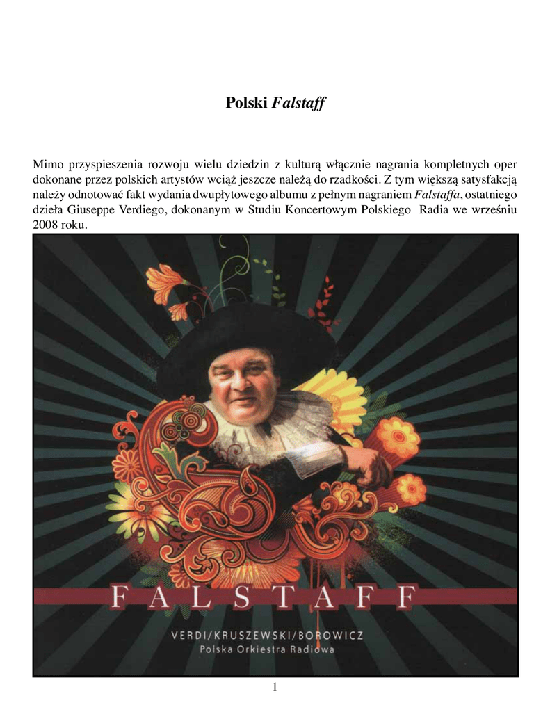 Polski Falstaff Mimo przyspieszenia rozwoju wielu dziedzin z kulturą włącznie nagrania kompletnych oper dokonane przez polskich artystów wciąż jeszcze należą do rzadkości. Z tym większą satysfakcją należy odnotować fakt wydania dwupłytowego albumu z pełnym nagraniem Falstaffa, ostatniego dzieła Giuseppe Verdiego, dokonanym w Studiu Koncertowym Polskiego Radia we wrześniu 2008 roku. 1 Sędziwy Verdi kończąc partyturę Falstaffa napisał: Ostatnie nuty „Falstaffa”. Wszystko skończone ! Idź swoją drogą, dokąd będziesz mógł... śmieszny typie, wieczyście prawdziwy pod zmienną maską, w każdym czasie i każdym miejscu! Ruszaj, ruszaj... Idź, idź, Addio!. I ruszył Falstaff na podbój świata z miejsca zdobywając serca publiczności i krytyki, zyskując przy tym opinię muzycznego arcydzieła. Zadziwiające, ale w Polsce jakoś dotychczas nie miała ta opera wielkiego powodzenia. Pierwszy raz wystawiono ją we Lwowie w 1930 roku. Kolejna premiera odbyła się dopiero w 1968 roku na scenie Opery Bytomskiej. Warszawa poznała dzieło w 1975, Poznań w 1988, Wrocław w 2000, a Łódź 2002 roku. I to jest cała historia Falstaffa na naszych scenach. Najnowszą kartą tej historii jest koncertowe wykonanie tego dzieła przygotowane przez Łukasza Borowicza i zaproszonych przez niego polskich śpiewaków na otwarcie sezonu artystycznego 2007/2008 Polskiego Radia, które znalazło się w omawianym albumie. Warto pamiętać, że Falstaff słynie z trudności technicznych, jakim musi podołać dyrygent zmuszony do precyzyjnego panowania nad wieloma ansamblami, składającymi się nieraz z dziewięciu solistów. Wszystkim tym wymaganiom sprostał znakomicie Łukasz Borowicz, prowadzący całość bardzo precyzyjnie, z właściwym temperamentem i ogromną swobodą. Przygotowana przez niego orkiestra z zapałem pokonywała zawiłości Verdiowskiej partytury, imponując pięknym soczystym brzmieniem i techniczną sprawnością. Dyrygent zadbał też o odpowiednią lekkość, wdzięk i muzyczny humor oraz właściwe proporcje brzmienia orkiestry i solistów. Adam Kruszewski w partii tytułowego bohatera daje dowód, że Verdi to jego żywioł. Wykreowany przez niego Falstaff jest szczerze śmieszny; na przemian rubaszny i nieco cyniczny. Budzi jednak sympatię, a chwilami moment zadumy nad przemijaniem i nieprzewidywalnością losu. Jednym słowem kreacja z błyskiem w oku i odrobiną lirycznej melancholii, na dodatek tworzona z lekkim dystansem do granej postaci. Od strony wokalnej prezentuje Kruszewski nie tylko pięknie brzmiący głos, wielką kulturę muzyczną, ale również daje popis naturalnego frazowania oraz swobody w prowadzeniu głosu. Świetnie w tym nagraniu prezentuje się kwartet pań. Nieco dziwaczną Meg Page jest Małgorzata Pańko, Izabella Kłośińska czaruje jako Alicja Ford, uwodząca Falstaffa zalotnością i słowiczym głosem, zaś Katarzyna Trylnik jest urokliwą liryczną Nanettą. Partię uroczej spryciary wiodącej całą intrygę, czyli Mrs. Quickly powierzono Joannie Cortes. Niestety, brakuje jej nieco dźwięcznego niskiego rejestru i przekonywującej vis comica. Lirycznym Fentonem jest Rafał Bartmiński. W sumie rzetelne nagranie z udanymi kreacjami polskich śpiewaków. 2