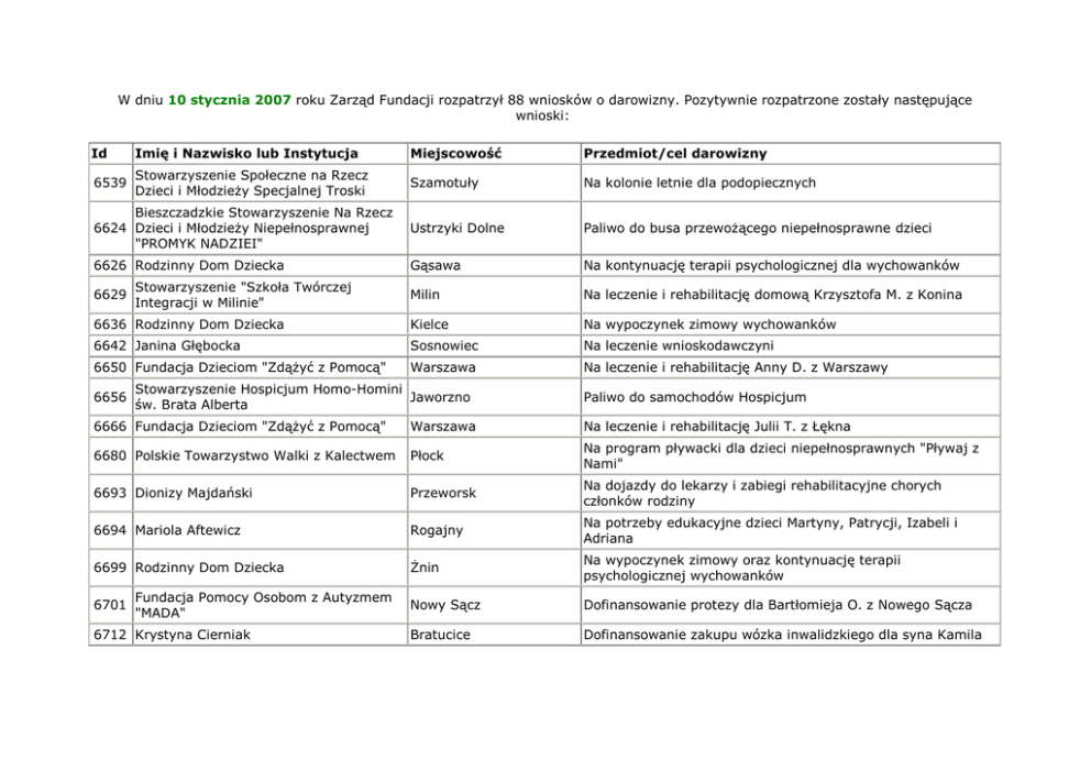 W dniu 10 stycznia 2007 roku Zarząd Fundacji rozpatrzył 88 wniosków o darowizny. Pozytywnie rozpatrzone zostały następujące wnioski: Id Imię i Nazwisko lub Instytucja Miejscowość Przedmiot/cel darowizny 6539 Stowarzyszenie Społeczne na Rzecz Dzieci i MłodzieŜy Specjalnej Troski Szamotuły Na kolonie letnie dla podopiecznych Bieszczadzkie Stowarzyszenie Na Rzecz 6624 Dzieci i MłodzieŜy Niepełnosprawnej "PROMYK NADZIEI" Ustrzyki Dolne Paliwo do busa przewoŜącego niepełnosprawne dzieci 6626 Rodzinny Dom Dziecka Gąsawa Na kontynuację terapii psychologicznej dla wychowanków Milin Na leczenie i rehabilitację domową Krzysztofa M. z Konina 6636 Rodzinny Dom Dziecka Kielce Na wypoczynek zimowy wychowanków 6642 Janina Głębocka Sosnowiec Na leczenie wnioskodawczyni 6650 Fundacja Dzieciom "ZdąŜyć z Pomocą" Warszawa Na leczenie i rehabilitację Anny D. z Warszawy 6629 6656 Stowarzyszenie "Szkoła Twórczej Integracji w Milinie" Stowarzyszenie Hospicjum Homo-Homini Jaworzno św. Brata Alberta Paliwo do samochodów Hospicjum 6666 Fundacja Dzieciom "ZdąŜyć z Pomocą" Warszawa Na leczenie i rehabilitację Julii T. z Łękna 6680 Polskie Towarzystwo Walki z Kalectwem Płock Na program pływacki dla dzieci niepełnosprawnych "Pływaj z Nami" 6693 Dionizy Majdański Przeworsk Na dojazdy do lekarzy i zabiegi rehabilitacyjne chorych członków rodziny 6694 Mariola Aftewicz Rogajny Na potrzeby edukacyjne dzieci Martyny, Patrycji, Izabeli i Adriana 6699 Rodzinny Dom Dziecka śnin Na wypoczynek zimowy oraz kontynuację terapii psychologicznej wychowanków Nowy Sącz Dofinansowanie protezy dla Bartłomieja O. z Nowego Sącza Bratucice Dofinansowanie zakupu wózka inwalidzkiego dla syna Kamila 6701 Fundacja Pomocy Osobom z Autyzmem "MADA" 6712 Krystyna Cierniak