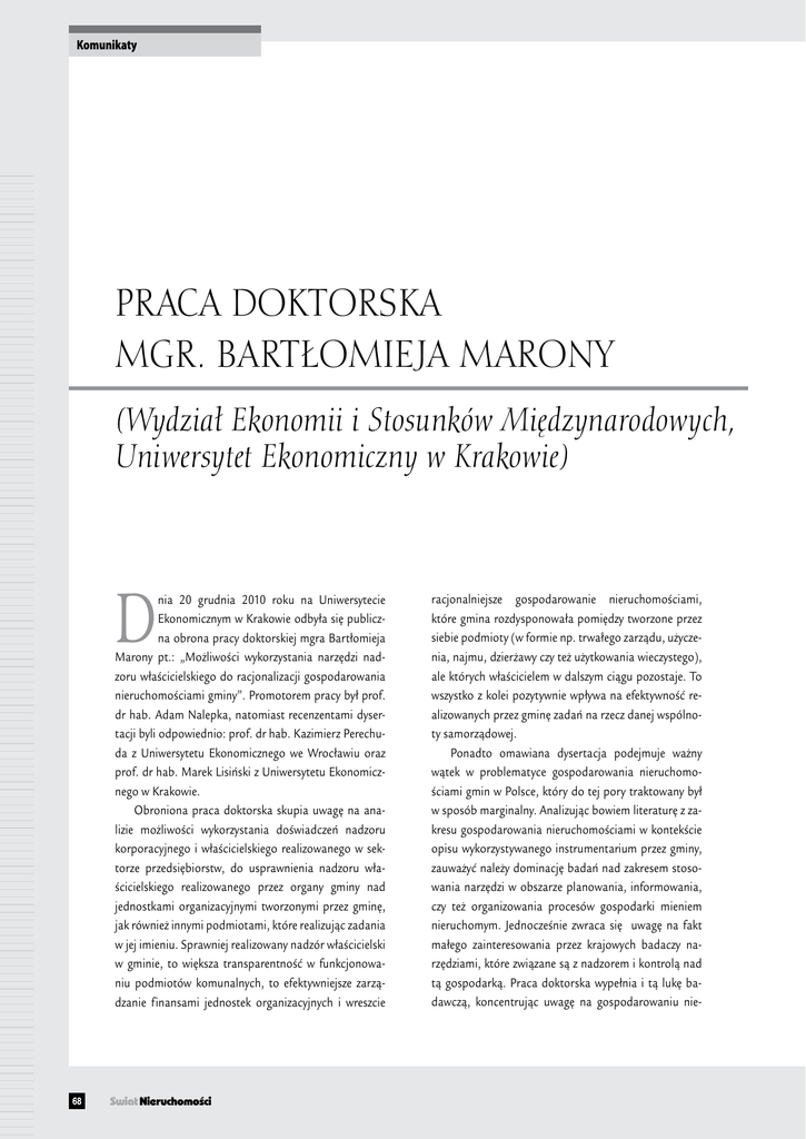 Komunikaty Praca Doktorska mgr. bartłomieja Marony (Wydział Ekonomii i Stosunków Międzynarodowych, Uniwersytet Ekonomiczny w Krakowie) D nia 20 grudnia 2010 roku na Uniwersytecie Ekonomicznym w Krakowie odbyła się publiczna obrona pracy doktorskiej mgra Bartłomieja Marony pt.: „Możliwości wykorzystania narzędzi nadzoru właścicielskiego do racjonalizacji gospodarowania nieruchomościami gminy”. Promotorem pracy był prof. dr hab. Adam Nalepka, natomiast recenzentami dysertacji byli odpowiednio: prof. dr hab. Kazimierz Perechuda z Uniwersytetu Ekonomicznego we Wrocławiu oraz prof. dr hab. Marek Lisiński z Uniwersytetu Ekonomicznego w Krakowie. Obroniona praca doktorska skupia uwagę na analizie możliwości wykorzystania doświadczeń nadzoru korporacyjnego i właścicielskiego realizowanego w sektorze przedsiębiorstw, do usprawnienia nadzoru właścicielskiego realizowanego przez organy gminy nad jednostkami organizacyjnymi tworzonymi przez gminę, jak również innymi podmiotami, które realizując zadania w jej imieniu. Sprawniej realizowany nadzór właścicielski w gminie, to większa transparentność w funkcjonowaniu podmiotów komunalnych, to efektywniejsze zarządzanie finansami jednostek organizacyjnych i wreszcie 68 Świat Nieruchomości racjonalniejsze gospodarowanie nieruchomościami, które gmina rozdysponowała pomiędzy tworzone przez siebie podmioty (w formie np. trwałego zarządu, użyczenia, najmu, dzierżawy czy też użytkowania wieczystego), ale których właścicielem w dalszym ciągu pozostaje. To wszystko z kolei pozytywnie wpływa na efektywność realizowanych przez gminę zadań na rzecz danej wspólnoty samorządowej. Ponadto omawiana dysertacja podejmuje ważny wątek w problematyce gospodarowania nieruchomościami gmin w Polsce, który do tej pory traktowany był w sposób marginalny. Analizując bowiem literaturę z zakresu gospodarowania nieruchomościami w kontekście opisu wykorzystywanego instrumentarium przez gminy, zauważyć należy dominację badań nad zakresem stosowania narzędzi w obszarze planowania, informowania, czy też organizowania procesów gospodarki mieniem nieruchomym. Jednocześnie zwraca się uwagę na fakt małego zainteresowania przez krajowych badaczy narzędziami, które związane są z nadzorem i kontrolą nad tą gospodarką. Praca doktorska wypełnia i tą lukę badawczą, koncentrując uwagę na gospodarowaniu nie- Komunikaty ruchomościami gmin, ze szczególnym uwzględnieniem problematyki nadzoru nad rozdysponowanymi nieruchomościami. W sytuacji, w której gmina rozdysponowuje swoje nieruchomości między tworzone przez siebie jednostki organizacyjne, bądź też zleca zarządzanie nimi firmie prywatnej, mamy do czynienia – podobnie jak w przypadku problematyki nadzoru właścicielskiego – z rozdzieleniem własności i zarządzania oraz koniecznością zastosowania odpowiednich narzędzi nadzoru. Praca podzielona została na część teoretyczną oraz empiryczną. Pierwsza część obejmuje rezultaty studiów literatury i analizy badań krajowych jak i zagranicznych (łącznie 309 pozycji) z zakresu: administracji publicznej, zarządzania publicznego, gospodarowania nieruchomościami oraz nadzoru korporacyjnego i właścicielskiego. Pod tym kątem przeprowadzona została analiza podstawowych aktów prawnych (w sumie 27) związanych z ustrojem i zasadami funkcjonowania gminy jako podstawowej jednostki samorządu terytorialnego w Polsce oraz tworzonych przez nią jednostek organizacyjnych. W tym miejscu należy podkreślić – cytując fragment recenzji sporządzonej przez prof. dra hab. Marka Lisińskiego – że „godną zauważenia i odnotowania cechą Autora, identyfikowaną w toku prowadzenia studiów literatury przedmiotu, a nie często spotykaną u osób będących w początkowej fazie rozwoju naukowego, jest umiejętność analizy i syntezy złożonej i wieloaspektowej problematyki będącej przedmiotem jego teoretycznych dociekań naukowych i badawczych. Autor ze swobodą, poprawnością merytoryczną i me- todyczną omawia poszczególne wątki składające się na ten obszar badawczy. Czyni to z konsekwencją, która cechującą autorów o wyrobionym już warsztacie naukowo-badawczym”. W drugiej części pracy zawarto wyniki badań przeprowadzonych przez Autora. Jak podkreśla prof. dr hab. Kazimierz Perechuda w swojej recenzji, badania te należy „traktować jako istotną próbę reorientacji schematów mentalnych decydentów życia gospodarczego na poziomie gminy w kierunku myślenia menadżerskiego. Obszerne badania empiryczne są kolejną „wartością dodaną” dysertacji”. Badania podzielono na dwie części: (i) część ilościową (w tym przypadku posłużono się badaniem ankietowym) oraz (ii) część jakościową. Badania ankietowe zostały przeprowadzone w okresie lipiec – wrzesień 2008 r. Kwestionariusz ankiety składający się z 11 pytań, wysłano w wersji elektronicznej oraz tradycyjnej do wszystkich miast w Polsce na prawach powiatu (łącznie 65 największych polskich gmin) z prośbą o jego wypełnienie. Po zrealizowaniu badań ilościowych, dokonano badań jakościowych, w których wykorzystano metodę „studium przypadku”. W badaniach posłużono się zarówno zbiorowym studium przypadku (analiza funkcjonowania nadzoru właścicielskiego w sześciu wybranych miastach) oraz tzw. instrumentalnym studium przypadku (sprawowanie nadzoru właścicielskiego w mieście Opole oraz Białystok). Wszystkich zainteresowanych szczegółową analizą dysertacji doktorskiej zapraszamy do Biblioteki Głównej Uniwersytetu Ekonomicznego w Krakowie. R e d a k c j a k wa r ta ln i k a „Ś w i at N i e r u c h o m o ś c i ” Świat Nieruchomości 69