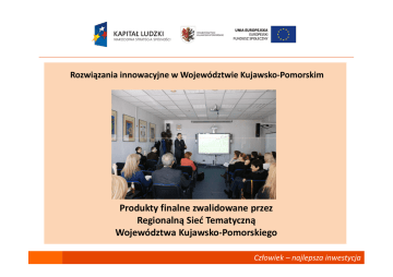 Rozwiązania innowacyjne w Województwie Kujawsko-Pomorskim Produkty finalne zwalidowane przez Regionalną Sieć Tematyczną Województwa Kujawsko-Pomorskiego Człowiek – najlepsza inwestycja MENTORING 50+: innowacyjne wykorzystanie potencjału dojrzałych pracowników dla rozwoju zasobów ludzkich Beneficjent: Okres realizacji: Fundacja Gospodarcza Pro Europa od lipca 2010 r. do września 2012 Odbiorcy: Użytkownicy: osoby pracujące w wieku 50+ głównie w MŚP, administracja publiczna specjaliści ds. HR, pracodawcy/kadra zarządzająca (MŚP i administracja publiczna), organizacje pracodawców i przedsiębiorców, specjaliści (doradcy, psychologowie, trenerzy i coachowie) Produktem finalnym jest model mentoringu dla osób 50+. Celem stworzenia rozwiązania było rozpowszechnienie słabo w Polsce znanej i stosowanej przez przedsiębiorstwa idei mentoringu jako narzędzia wykorzystującego potencjał, wiedzę, doświadczenie i autorytet pracowników w wieku 50+, a także zbudowanie określonego standardu, modelu wdrożenia tego narzędzia, które mogłoby być replikowane zwłaszcza w MMŚP i administracji publicznej. Drugi cel to wpłynięcie w dalszej perspektywie na grupę pracowników po 50 roku życia – mentoring tworzy szansę na dłuższe pozostanie na rynku pracy, zwiększenie autorytetu i prestiżu w środowisku pracy, ale także wykorzystanie bogatego doświadczenia w roli pokrewnej do dotychczas wykonywanego zawodu (np. trener szkoleń zawodowych). Strona internetowa: Kontakt: www.fundacja-proeuropa.org.pl/pl/content/mentoring-50 [email protected] Człowiek – najlepsza inwestycja 50+ doświadczenie Beneficjent: Okres realizacji: Caritas Polska 1 lipca 2010 r. do 31 października 2012 r. Odbiorcy: Użytkownicy: pracownicy MŚP 50+ pracodawcy, przedstawiciele kadry zarządzającej firm, osoby ze środowiska naukowo–edukacyjnego, instytucje i partnerzy rynku pracy oraz instytucje szkoleniowe W projekcie wypracowano dwa produkty finalne: 1) nowoczesne strategie zarządzania wiekiem opracowane na podstawie typów przedsiębiorstw woj. kujawsko-pomorskiego obejmujące: zmodyfikowane 4 formy wsparcia 50+ wypracowane w ramach EQUAL oraz podręcznik przygotowania strategii zarządzania wiekiem dla tych, którzy będą chcieli ją samodzielnie przygotować we własnej firmie. 2) model funkcjonowania instytucji o specyfice ORP, w tym gromadzenia i przetwarzania danych o rynku pracy ze szczególnym uwzględnieniem 50+ (procedury, narzędzia). Strona internetowa: Kontakt: www.piecdziesiatplus.com [email protected] Człowiek – najlepsza inwestycja Profilowanie bezrobotnych jako instrument wydłużania aktywności zawodowej grup wymagających szczególnego wsparcia Beneficjent: Okres realizacji: Uniwersytet Mikołaja Kopernika w Toruniu 1 czerwca 2012 r. – 31 marca 2013 r. Odbiorcy: Użytkownicy: osoby bezrobotne zarejestrowane w PUP pracownicy Publicznych Służb Zatrudnienia W projekcie opracowano innowacyjne narzędzie w postaci aplikacji komputerowej o nazwie PROFIL do profilowania bezrobotnych i doboru dla nich szkoleń najbardziej skracających przewidywany czas pozostawania bez pracy. Dodatkowo stworzony podręcznik stanowi kompendium wiedzy o procedurach profilowania bezrobotnych i zawiera szczegółową instrukcję wdrożenia, obsługi i wykorzystania aplikacji PROFIL. Opracowane rozwiązanie ma wspomagać i systematyzować codzienne decyzje podejmowane przez pracowników powiatowych urzędów pracy w zakresie określenia stopnia zagrożenia długotrwałym bezrobociem bezrobotnych zarejestrowanych bądź dopiero co rejestrujących się w powiatowych urzędach pracy. Wskazuje również, który typ szkolenia zawodowego najbardziej skraca przewidywany okres pozostawania bez pracy. Strona internetowa: Kontakt: www.profilowanie.umk.pl [email protected] Człowiek – najlepsza inwestycja Model Mobilnego Centrum Aktywizacji Zawodowej Beneficjent: Okres realizacji: Stowarzyszenie Rozwoju Regionalnego „Partner” 1 lipca 2011 r. – 31 stycznia 2014 r. Odbiorcy: Użytkownicy: bezrobotne kobiety w wieku 15-60 lat mieszkające na obszarach wiejskich pracownicy PUP, którzy zajmują się bezpośrednio aktywizacją zawodową osób bezrobotnych tj. doradcy zawodowi, liderzy Klubu Pracy, specjaliści ds. rozwoju zawodowego i pośrednicy pracy. Model Mobilnego Centrum Aktywizacji Zawodowej (MMCAZ) polega na prowadzeniu działań w ramach Mobilnego Centrum Aktywizacji Zawodowej (MCAZ), które działa w ramach struktury Centrum Aktywizacji Zawodowej (CAZ) w Powiatowym Urzędzie Pracy. MMCAZ został opracowany w celu zwiększenia skuteczności działań podejmowanych na rzecz aktywizacji zawodowej bezrobotnych kobiet zamieszkałych na wsi, gdzie obiektywną barierę stanowi ograniczona liczba połączeń komunikacji publicznej z miastem gdzie mieści się Powiatowy Urząd Pracy, a dodatkowe ograniczenie stanowią koszty dojazdu. Model MCAZ jest bezpośrednią odpowiedzią na zdiagnozowane wśród bezrobotnych kobiet z terenów wiejskich bariery natury społecznej i kulturowej, determinujące ich brak aktywności zawodowej. Działania aktywizacyjne w ramach MCAZ prowadzą do poprawy ich zatrudnialności, ale także zwiększają mobilność pracowników powiatowych urzędów pracy w docieraniu z ofertą usług do ośrodków wiejskich, niebędących siedzibami gmin. Strona internetowa: Kontakt: www.srr-partner.pl [email protected] Człowiek – najlepsza inwestycja Nic o nas bez nas Beneficjent: Okres realizacji: Wyższa Szkoła Gospodarki w Bydgoszczy 1 listopada 2011 – 31 grudnia 2013 Odbiorcy: Użytkownicy: młode osoby (18-24 lata) zagrożone wykluczeniem społecznym pracownicy jednostek administracji rządowej i samorządowej oraz sektora pozarządowego. Pracownicy ośrodków pomocy społecznej - na każdym poziomie: miejskim, rejonowym i gminnym, pracownicy ośrodków opiekuńczowychowawczych, centrów pomocy rodzinie oraz fundacji i stowarzyszeń, w tym centrów wolontariatu, ś