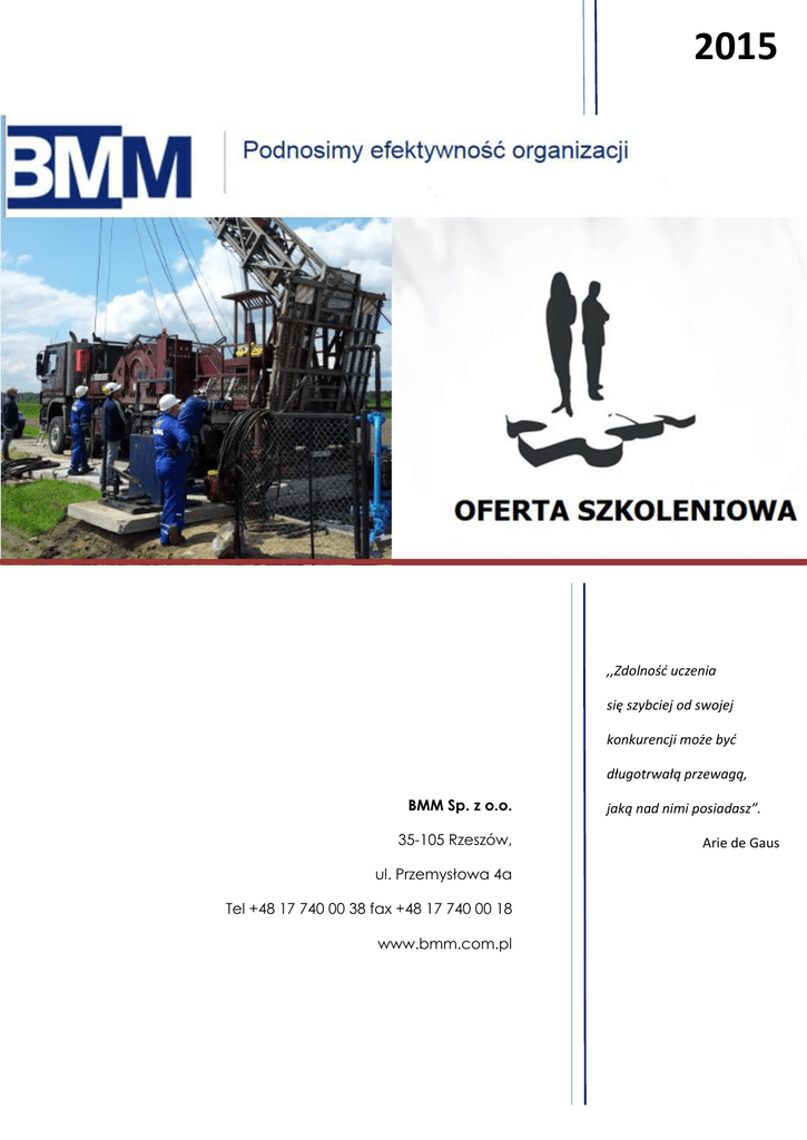 2015 ,,Zdolność uczenia się szybciej od swojej konkurencji może być długotrwałą przewagą, BMM Sp. z o.o. 35-105 Rzeszów, ul. Przemysłowa 4a Tel +48 17 740 00 38 fax +48 17 740 00 18 www.bmm.com.pl jaką nad nimi posiadasz”. Arie de Gaus O FIRMIE Centrum Szkoleniowe BMM Sp. z o.o. działa na polskim rynku doradczo-szkoleniowym od 2000 roku. Jesteśmy wyodrębnioną jednostką polskiej dynamicznie rozwijającej się spółki informatyczno – szkoleniowej, która od 1995 roku wspomaga rozwój procesów biznesowych w przedsiębiorstwach i instytucjach na terenie całego kraju. Na bazie własnych doświadczeń i kilkuletniej praktyki szkoleniowej, stworzyliśmy programy szkoleń, by wspierały działalność firm, pozwalały rozwiązywać problemy i otwierały na nowe możliwości, odpowiadające zmieniającym się wymaganiom rynku. Zachęcamy naszych klientów aby na każdym etapie projektu szkoleniowego aktywnie brali udział w konstruowaniu i modyfikacji poszczególnych modułów szkoleniowych, aby w pełni odpowiadały one konkretnym zapotrzebowaniom ich firmy. Nasza kadra trenerska to specjaliści danej branży, którzy posiadają nie tylko wieloletnie doświadczenie i wiedzę teoretyczną, ale przede wszystkim praktyczną. Doskonale znający zarówno przepisy jak i problemy z jakimi borykają się pracownicy na co dzień. Nasi Trenerzy podczas szkolenia dzielą się z Państwem bezcennym doświadczeniem oraz zainspirują sprawdzonymi rozwiązaniami omawianych problemów. Dziś nasze usługi świadczymy na terenie całego kraju, współpracując z Klientami ze wszystkich sektorów. Zaufali nam m.in: OFERTA SZKOLENIOWA W naszej ofercie znajdą Państwo gamę szkoleń dedykowanych dla branży naftowo-gazowej, energetyki i górnictwa. Jeżeli potrzebują Państwo szkolenia zamkniętego dla swojej grupy pracowników, prosimy o kontakt. Jesteśmy otwarci na propozycję, które pomogą w jeszcze lepszym świadczeniu przez nas usług. Agnieszka Janik Specjalista ds. sprzedaży produktów szkoleniowych i obsługi szkoleń tel. 17 740 00 38, 509 906 318. [email protected] REALIZOWANE TEMATY SZKOLEŃ TEMAT CENA TRENER LICZBA GODZIN Netto* Janusz Malinga 8 690,00 Janusz Malinga 16 1380,00 1. Szkolenie z zakresu Zmian w Prawie Geologicznym i Górniczym MIEJSCE Katowice/ Piotrków Trybunalski Katowice/ Piotrków Trybunalski Szkolenie odpowie na wszystkie nurtujące Państwa pytania dotyczące ustawy Prawo geologiczne i górnicze, a zwłaszcza przepisów wykonawczych. Podpowie jak przełożyć nowe przepisy na rzeczywistość, jak przygotować dokumentacje zgodnie z ustawą i przepisami oraz jak przygotować się do kontroli. W trakcie szkolenia zostaną także poruszone następujące zagadnienia: użytkowania górnicze, koncesje na działalność regulowaną nową ustawą, prace i dokumentacje geologiczne, plany ruchu zakładu górniczego, kwalifikacje, działalność represyjna i przepisy karne i inne wskazane przez grupę. 2. Odszkodowania za szkody w pożytkach i w częściach składowych nieruchomości powstałe podczas budowy urządzeń przesyłowych i dystrybucyjnych Jerzy Dąbek 8 650,00 Łódź/ Piotrków Trybunalski Przybliżymy uczestnikom pojęcie szkody i odszkodowania oraz wynagrodzenia w Kodeksie cywilnym oraz w postępowaniu administracyjnym. Przedstawimy rodzaje szkód o charakterze tymczasowym i trwałym spowodowane budową i eksploatacja urządzeń infrastruktury technicznej. Podpowiemy jak określać wartości szkód w produkcji rolniczej. Poruszone zostaną zagadnienia określania wartości szkód w drzewostanie leśnym oraz określanie wartości pojedynczych drzew. Określanie utraconego dochodu z nieruchomości na której istnieje kopalina oraz wartości utraconego dochodu ze stawów rybnych na skutek ich czasowego zajęcia. A także określanie szkód o charakterze trwałym w nieruchomości. Podamy przykłady określenia wynagrodzenia za czasowe zajęcie części nieruchomości w celu budowy urządzenia. Określanie wartości szkód w pożytkach z nieruchomości. Przedstawimy przykłady określenia wartości szkód w produkcji rolniczej. Łukasz Jankowski i Jakub Kasnowski 3. Prawo energetyczne 8 560,00 Łódź/ Piotrków Trybunalski Celem szkolenia jest omówienie kluczowych instytucji prawa energetycznego. Szkolenie przedstawia kompleksowo system prawa energetycznego wskazując na jego podstawowe cechy i określając podmioty występujące na rynku energetycznym wraz z ich obowiązkami. Ważnym elementem szkolenia jest zarysowanie granic ryzyk regulacyjnych, zarówno w ujęciu energetycznym, jak i antymonopolowym oraz z zakresu ochrony konsumentów. Ponadto na szkoleniu zostaną omówione najnowsze i projektowane zmiany w prawie energetycznym i pozostałych ustawach sektorowych oraz przepisach wykonawczych. 4. Infrastruktura techniczna na nieruchomościach Obowiązujące i planowane przepisy prawne oraz zasady określania odszkodowań i wynagrodzeń przy urządzeniach infrastruktury/ technicznej /wiertniczych, dystrybucyjnych i przesyłowych Piotr Zamroch i Jerzy Dąbek 16 1390,00 Łódź/ Piotrków Trybunalski Celem jest zapoznanie uczestników z aktualnym i planowanym stanem prawnym dotyczącym praw własności w sytuacji realizacji inwestycji infrastrukturalnych na cudzym gruncie oraz zadań i obowiązków inwestora w obszarze uzgadniania i wypłacania wynagrodzeń i odszkodowań. Trenerzy odpowiedzą na pytania Jak egzekwować decyzje administracyjne od organów samorządowych w przysługujących terminach? Na jakich obecnie przepisach opierać swoje wnioski i uzasadnienia. Czego można się spodziewać po wejściu planowanych nowelizacji aktów prawnych regulujących sprawy nie-ruchomości?! 5. Sektorowe Zamówienia Publiczne -kompleksowe warsztaty Wojciech Piórkowski 8 490,00 Piotrków Trybunalski/Katow ice Zajęcia prowadzone będą w formie interaktywnych zajęć praktycznych z prezentacją licznych przykładów. Dodatkowo zajęcia wspomagane będą pre