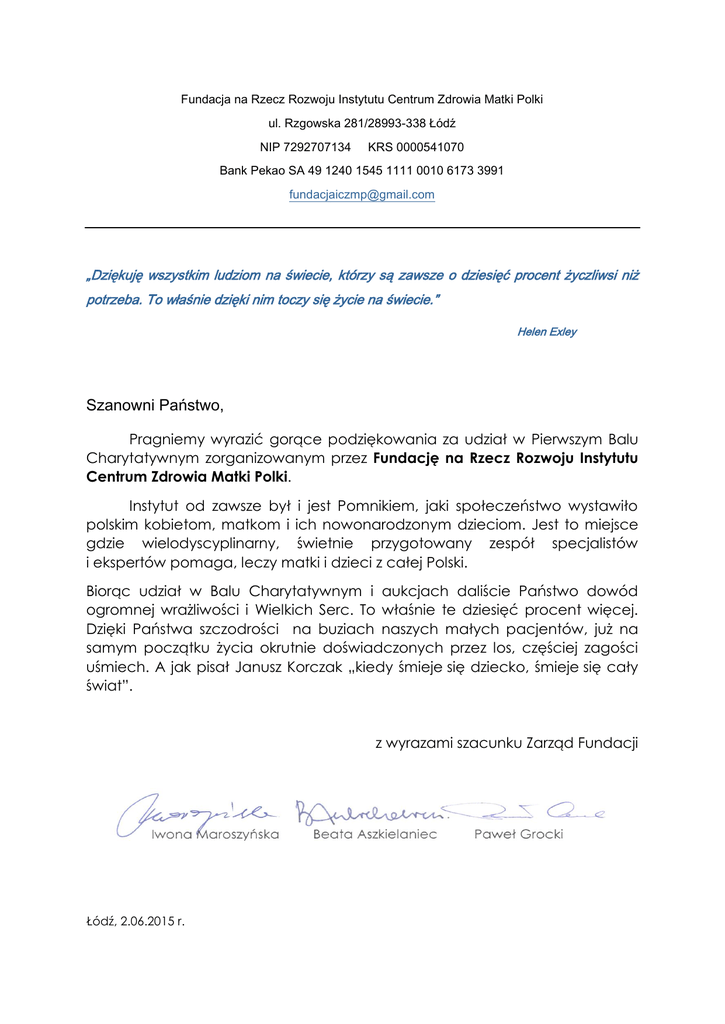 Fundacja na Rzecz Rozwoju Instytutu Centrum Zdrowia Matki Polki ul. Rzgowska 281/28993-338 Łódź NIP 7292707134 KRS 0000541070 Bank Pekao SA 49 1240 1545 1111 0010 6173 3991 [email protected] „Dziękuję wszystkim ludziom na świecie, którzy są zawsze o dziesięć procent życzliwsi niż potrzeba. To właśnie dzięki nim toczy się życie na świecie.” Helen Exley Szanowni Państwo, Pragniemy wyrazić gorące podziękowania za udział w Pierwszym Balu Charytatywnym zorganizowanym przez Fundację na Rzecz Rozwoju Instytutu Centrum Zdrowia Matki Polki. Instytut od zawsze był i jest Pomnikiem, jaki społeczeństwo wystawiło polskim kobietom, matkom i ich nowonarodzonym dzieciom. Jest to miejsce gdzie wielodyscyplinarny, świetnie przygotowany zespół specjalistów i ekspertów pomaga, leczy matki i dzieci z całej Polski. Biorąc udział w Balu Charytatywnym i aukcjach daliście Państwo dowód ogromnej wrażliwości i Wielkich Serc. To właśnie te dziesięć procent więcej. Dzięki Państwa szczodrości na buziach naszych małych pacjentów, już na samym początku życia okrutnie doświadczonych przez los, częściej zagości uśmiech. A jak pisał Janusz Korczak „kiedy śmieje się dziecko, śmieje się cały świat”. z wyrazami szacunku Zarząd Fundacji Łódź, 2.06.2015 r.