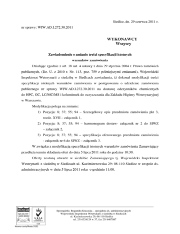 Siedlce, dn. 29 czerwca 2011 r. nr sprawy: WIW.AD.I.272.30.2011 WYKONAWCY Wszyscy Zawiadomienie o zmianie treści specyfikacji istotnych warunków zamówienia Działając zgodnie z art. 38 ust. 4 ustawy z dnia 29 stycznia 2004 r. Prawo zamówień publicznych, (Dz. U. z 2010 r. Nr. 113, poz. 759 z późniejszymi zmianami), Wojewódzki Inspektorat Weterynarii z siedzibą w Siedlcach zawiadamia, iż dokonał modyfikacji treści specyfikacji istotnych warunków zamówienia w postępowaniu o udzielenie zamówienia publicznego nr sprawy WIW.AD.I.272.30.2011 na dostawę odczynników chemicznych do HPC, GC, LC/MC/MS i kolumienek do oczyszczania dla Zakładu Higieny Weterynaryjnej w Warszawie. Modyfikacja polega na zmianie: 1) Pozycja: 8; 37; 55; 94 – Szczegółowy opis przedmiotu zamówienia pkt 3, rozdz. XVII – załącznik 1, 2) Pozycja: 8; 37; 55; 94 – harmonogram dostaw- załącznik nr 2 do SIWZ – załącznik 2, 3) Pozycja: 8; 37; 55; 94 – specyfikacja oferowanego przedmiotu zamówienia - załącznik nr 6 do SIWZ – załącznik 3. W związku z modyfikacją specyfikacji istotnych warunków zamówienia Zamawiający przedłuża termin składania ofert do dnia 5 lipca 2011 roku do godziny 10:30. Oferty zostaną otwarte w siedzibie Zamawiającego tj. Wojewódzki Inspektorat Weterynarii z siedzibą w Siedlcach ul. Kazimierzowska 29; 08-110 Siedlce w zespole ds. administracyjnych w dniu 5 lipca 2011 roku o godzinie 11:00. Sporządziła: Bogumiła Krasuska – specjalista ds. administracyjnych Wojewódzki Inspektorat Weterynarii z siedzibą w Siedlcach ul. Kazimierzowska 29, 08-110 Siedlce tel. 25/ 6324129 w 37, fax 25/ 6407087 Numer certyfikatu 9131 nr sprawy WIW.AD.I.272.30.2011 Załącznik nr 1 Modyfikacja Specyfikacji Istotnych warunków zamówienia w na dostawę odczynników chemicznych do HPC, GC, LC/MC/MS i kolumienek do oczyszczania dla Zakładu Higieny Weterynaryjnej w Warszawie jak niżej: Modyfikacja pozycji: 8; 37; 55; 94 – Szczegółowy opis przedmiotu zamówienia pkt 3, rozdz. XVII jak niżej: Przedmiot Lp. zamówienia Opis - parametry Ilość Wielkość Jednostka zamawiana op. miary − 2op. lub 1 op. 0,5 litra lub 1 l op. techniczne 8. Alkohol etylowy 99,5% 37. Eter dietylowy Cz.d.a., 40 op. 1 litr op. 55. Kwas nadchlorowy Cz.d.a., 1 op. 100 ml op. 94 Tween 20 − 1 op. lub 2 op. 50 ml lub 25 ml op. Wymagany termin gwarancji Minimum 12 miesięcy od dnia dostawy. Minimum 12 miesięcy od dnia dostawy. Minimum 12 miesięcy od dnia dostawy. Minimum 12 miesięcy od dnia dostawy. Sporządziła: Bogumiła Krasuska – specjalista ds. administracyjnych Wojewódzki Inspektorat Weterynarii z siedzibą w Siedlcach ul. Kazimierzowska 29, 08-110 Siedlce tel. 25/ 6324129 w 37, fax 25/ 6407087 Numer certyfikatu 9131 Inne wymagania Certyfikat jakości produktu dołączony do dostawy dla każdej serii. Certyfikat jakości produktu dołączony do dostawy dla każdej serii. Certyfikat jakości produktu dołączony do dostawy dla każdej serii. Certyfikat jakości produktu dołączony do dostawy dla każdej serii. Załącznik nr 2 Modyfikacja harmonogramu dostaw jak niżej: Modyfikacja pozycji: 8; 37; 55; 94 – harmonogram dostaw- załącznik nr 2 do SIWZ jak niżej: Rok 2011 Miesiąc: Lp. Przedmiot zamówienia Ilość zamawiana - - - 21 dni od podpisania umowy Sierpień Listopad 2 op. a’0,5 l lub 1 op. a’1 l 2 op. lub 1 op. − − 40 op. a’1 l 10 op. 10 op. 20 op. 1 op. a’100 ml 1op. − − 1 op. a’50 ml lub 2 op. a’25 ml 1op. lub 2 op. − − 8. Alkohol etylowy 99,5% 37. Eter dietylowy 55. Kwas nadchlorowy 94. Tween 20 Sporządziła: Bogumiła Krasuska – specjalista ds. administracyjnych Wojewódzki Inspektorat Weterynarii z siedzibą w Siedlcach ul. Kazimierzowska 29, 08-110 Siedlce tel. 25/ 6324129 w 37, fax 25/ 6407087 Numer certyfikatu 9131 Załącznik nr 3 Modyfikacja specyfikacji oferowanego przedmiotu zamówienia jak niżej: Modyfikacja pozycji: 8; 37; 55; 94 – specyfikacja oferowanego przedmiotu zamówienia - załącznik nr 6 do SIWZ jak niżej: Lp 8. Przedmiot zamówienia Opis- parametry techniczne Alkohol etylowy 99,5% - 37. Eter dietylowy Cz.d.a. 55. Kwas nadchlorowy Cz.d.a. 94. Tween 20 Oferowane przez Wykonawcę parametry techniczne * - Sporządziła: Bogumiła Krasuska – specjalista ds. administracyjnych Wojewódzki Inspektorat Weterynarii z siedzibą w Siedlcach ul. Kazimierzowska 29, 08-110 Siedlce tel. 25/ 6324129 w 37, fax 25/ 6407087 Numer certyfikatu 9131 Producent, nr katalogowy, termin gwarancji.