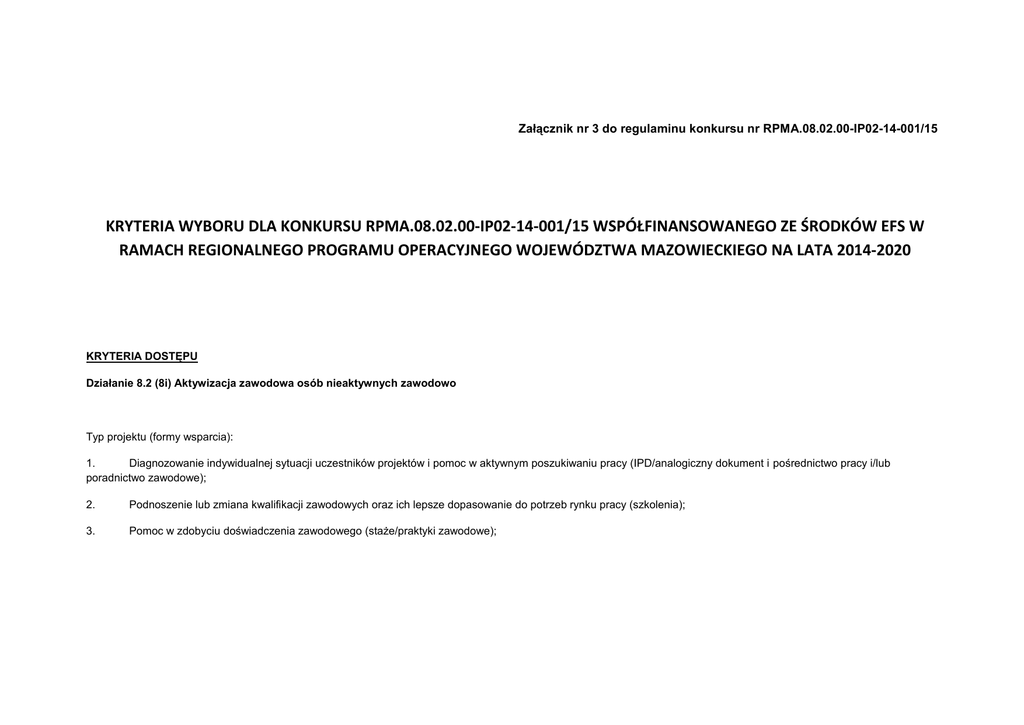 Załącznik nr 3 do regulaminu konkursu nr RPMA.08.02.00-IP02-14-001/15 KRYTERIA WYBORU DLA KONKURSU RPMA.08.02.00-IP02-14-001/15 WSPÓŁFINANSOWANEGO ZE ŚRODKÓW EFS W RAMACH REGIONALNEGO PROGRAMU OPERACYJNEGO WOJEWÓDZTWA MAZOWIECKIEGO NA LATA 2014-2020 KRYTERIA DOSTĘPU Działanie 8.2 (8i) Aktywizacja zawodowa osób nieaktywnych zawodowo Typ projektu (formy wsparcia): 1. Diagnozowanie indywidualnej sytuacji uczestników projektów i pomoc w aktywnym poszukiwaniu pracy (IPD/analogiczny dokument i pośrednictwo pracy i/lub poradnictwo zawodowe); 2. Podnoszenie lub zmiana kwalifikacji zawodowych oraz ich lepsze dopasowanie do potrzeb rynku pracy (szkolenia); 3. Pomoc w zdobyciu doświadczenia zawodowego (staże/praktyki zawodowe); L.p. Kryterium 1. Opis kryterium Wsparcie kierowane jest wyłącznie do osób biernych zawodowo, w wieku 30 lat i więcej należących co najmniej do jednej z poniższych grup: osoby powyżej 50 roku życia, osoby z niepełnosprawnościami, osoby o niskich kwalifikacjach, kobiety. Projekt zapewni kompleksowe wsparcie poprzez zastosowanie w odniesieniu do każdego uczestnika co najmniej dwóch form wsparcia z niżej wymienionych: 2. - diagnozowanie indywidualnej sytuacji uczestnika projektu i pośrednictwo pracy i/lub poradnictwo zawodowe (obligatoryjne); - staży/praktyk zawodowych; - szkoleń. Grupa docelowa jest zgodna z zestawieniem głównych grup docelowych dla danego Działania, określoną w Regionalnym Programie Operacyjnym Województwa Mazowieckiego 2014-2020 oraz w SZOOP RPO WM i Regulaminie Konkursu. Punktacja 0/1 Spełnienie kryterium jest warunkiem koniecznym do otrzymania dofinansowania. Ocena kryterium jest 0/1. Uzyskanie oceny „0” jest jednoznaczne z odrzuceniem projektu. Działania przewidziane do realizacji w projekcie, które obejmą wszystkich uczestników odpowiadają indywidualnej diagnozie sytuacji uczestników projektu RPO WM przeprowadzonej przez Wnioskodawcę dla potrzeb projektu oraz zapewniają pomoc w poszukiwaniu pracy. Zastosowanie szerszego wachlarza instrumentów wobec każdego uczestnika projektu zwiększy skuteczność realizowanego wsparcia. Obowiązkowe zapewnienie w ramach projektu realizacji staży/praktyk zawodowych i/lub szkoleń bezpośrednio przyczyni się do podniesienia atrakcyjności zawodowej uczestnika projektu. 0/1 Spełnienie kryterium jest warunkiem koniecznym do otrzymania dofinansowania. Ocena kryterium jest 0/1. Uzyskanie oceny „0” jest jednoznaczne z odrzuceniem projektu. 3. W przypadku gdy projekt obejmuje wsparcie w postaci podnoszenia lub zmiany kwalifikacji oferowane usługi szkoleniowe są realizowane przez instytucje posiadające wpis do Rejestru Instytucji Szkoleniowych Usługi szkoleniowe będą realizowane przez jednostki posiadające wpis do Rejestru Instytucji Szkoleniowych Wprowadzenie kryterium 0/1 prowadzonego przez Wojewódzkie Urzędy Pracy właściwy ze względu na siedzibę instytucji szkoleniowej. wynika z konieczności zapewnienia minimalnych wymagań jakościowych wynikających z Wytycznych w zakresie realizacji przedsięwzięć z udziałem środków Europejskiego Funduszu Społecznego w obszarze rynku pracy na lata 2014-2020. Spełnienie kryterium jest warunkiem koniecznym do otrzymania dofinansowania. Ocena kryterium jest 0/1. Uzyskanie oceny „0” jest jednoznaczne z odrzuceniem projektu. Możliwe warianty odpowiedzi: tak, nie, nie dotyczy 4. Zastosowane w projekcie instrumenty wsparcia dla osób z grup defaworyzowanych, wiążą się z koniecznością zachowania standardów oraz poziomów kosztów dla poszczególnych form określonych w Wytycznych w zakresie realizacji przedsięwzięć z udziałem środków Europejskiego Funduszu Społecznego w obszarze rynku pracy na lata 2014-2020. W przypadku zastosowania w projekcie instrumentów wsparcia osób z grup defaworyzowanych, konieczne będzie zachowanie standardów oraz poziomu kosztów dla poszczególnych form określonych w Wytycznych w zakresie realizacji przedsięwzięć z udziałem środków Europejskiego Funduszu Społecznego w obszarze rynku pracy na lata 2014-2020. 0/1 Spełnienie kryterium jest warunkiem koniecznym do otrzymania dofinansowania. Ocena kryterium jest 0/1. Uzyskanie oceny „0” jest jednoznaczne z odrzuceniem projektu. 5. W przypadku, gdy projekt obejmuje wsparcie w postaci szkoleń prowadzących do uzyskania kwalifikacji lub nabycia kompetencji muszą zostać one zweryfikowane poprzez przeprowadzenie odpowiedniego sprawdzenia przyswojonej wiedzy i uzyskanych kwalifikacji lub kompetencji (np. w formie egzaminu) oraz być potwierdzone odpowiednim dokumentem (np. certyfikatem). Kryterium przyczyni się do podniesienia jakości szkoleń oferowanych w ramach projektu. Kryterium zapewni uzyskanie przez uczestników szkoleń konkretnej wiedzy, kwalifikacji i kompetencji zgodnych z ustalonymi standardami. W ramach przedmiotowego kryterium konieczne jest określenie efektów uczenia się, czyli wskazanie co dana osoba powinna wiedzieć, potrafić i jakie kompetencje społeczne powinna posiadać po zakończeniu danej formy wsparcia tj. szkolenia prowadzącego do nabycia kwalifikacji lub kompetencji. W przypadku szkoleń prowadzących do uzyskania kwalifikacji konieczne jest spełnienie warunków dotyczących walidacji i certyfikacji. W ramach szkoleń prowadzących do uzyskania kompetencji, muszą zostać zrealizowane 4 etapy nabycia 0/1 kompetencji zgodnie z „Wytycznymi w zakresie monitorowania postępu rzeczowego realizacji programów operacyjnych na lata 2014-2020” (załącznik nr 2 Wspólna Lista Wskaźników Kluczowych), zaś po zakończeniu szkolenia rezultaty muszą zostać zweryfikowane np. poprzez egzamin wewnętrzny, test, rozmowę oceniającą i porównane ze standardem wymagań. Kryterium zostanie zweryfikowane na podstawie zapisów we wniosku o dofinansowanie projektu. Spełnienie kryterium jest warunkiem koniecznym do otrzymania dofinansowania. Ocena kryterium jest 0/1. Uzyskanie oceny „0