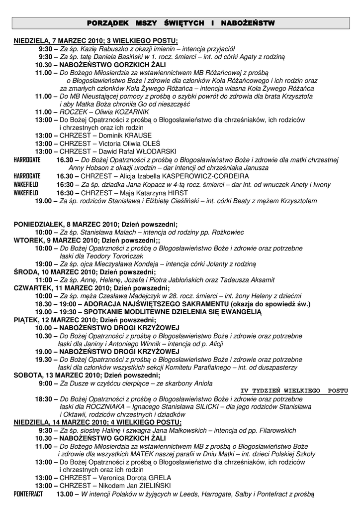PORZĄDEK MSZY ŚWIĘTYCH IĘTYCH I NABOŻEŃSTW NIEDZIELA, 7 MARZEC 2010; 3 WIELKIEGO POSTU; 9:30 – Za śp. Kazię Rabuszko z okazji imienin – intencja przyjaciół 9:30 – Za śp. tatę Daniela Basiński w 1. rocz. śmierci – int. od córki Agaty z rodziną 10.30 – NABOŻEŃSTWO GORZKICH ŻALI 11.00 – Do Bożego Miłosierdzia za wstawiennictwem MB Różańcowej z prośbą o Błogosławieństwo Boże i zdrowie dla członków Koła Różańcowego i ich rodzin oraz za zmarłych członków Koła Żywego Różańca – intencja własna Koła Żywego Różańca 11.00 – Do MB Nieustającej pomocy z prośbą o szybki powrót do zdrowia dla brata Krzysztofa i aby Matka Boża chroniła Go od nieszczęść 11.00 – ROCZEK – Oliwia KOZARNIK 13:00 – Do Bożej Opatrzności z prośbą o Błogosławieństwo dla chrześniaków, ich rodziców i chrzestnych oraz ich rodzin 13:00 – CHRZEST – Dominik KRAUSE 13:00 – CHRZEST – Victoria Oliwia OLEŚ 13:00 – CHRZEST – Dawid Rafał WŁODARSKI HARROGATE 16.30 – Do Bożej Opatrzności z prośbą o Błogosławieństwo Boże i zdrowie dla matki chrzestnej Anny Hobson z okazji urodzin – dar intencji od chrześniaka Janusza HARROGATE 16.30 – CHRZEST – Alicja Izabella KASPEROWICZ-CORDEIRA WAKEFIELD 16:30 – Za śp. dziadka Jana Kopacz w 4-tą rocz. śmierci – dar int. od wnuczek Anety i Iwony WAKEFIELD 16:30 – CHRZEST – Maja Katarzyna HIRST 19.00 – Za śp. rodziców Stanisława i Elżbietę Cieśliński – int. córki Beaty z mężem Krzysztofem PONIEDZIAŁEK, 8 MARZEC 2010; Dzień powszedni; 10:00 – Za śp. Stanisława Malach – intencja od rodziny pp. Rożkowiec WTOREK, 9 MARZEC 2010; Dzień powszedni;; 10:00 – Do Bożej Opatrzności z prośbą o Błogosławieństwo Boże i zdrowie oraz potrzebne łaski dla Teodory Torończak 19:00 – Za śp. ojca Mieczysława Kondeja – intencja córki Jolanty z rodziną ŚRODA, 10 MARZEC 2010; Dzień powszedni; 11:00 – Za śp. Annę, Helenę, Jozefa i Piotra Jabłońskich oraz Tadeusza Aksamit CZWARTEK, 11 MARZEC 2010; Dzień powszedni; 10:00 – Za śp. męża Czesława Madejczyk w 28. rocz. śmierci – int. żony Heleny z dziećmi 18.30 – 19:00 – ADORACJA NAJŚWIĘTSZEGO SAKRAMENTU (okazja do spowiedź św.) 19.00 – 19:30 – SPOTKANIE MODLITEWNE DZIELENIA SIĘ EWANGELIĄ PIĄTEK, 12 MARZEC 2010; Dzień powszedni; 10.00 – NABOŻEŃSTWO DROGI KRZYŻOWEJ 10.30 – Do Bożej Opatrzności z prośbą o Błogosławieństwo Boże i zdrowie oraz potrzebne łaski dla Janiny i Antoniego Winnik – intencja od p. Alicji 19.00 – NABOŻEŃSTWO DROGI KRZYŻOWEJ 19.30 – Do Bożej Opatrzności z prośbą o Błogosławieństwo Boże i zdrowie oraz potrzebne łaski dla członków wszystkich sekcji Komitetu Parafialnego – int. od duszpasterzy SOBOTA, 13 MARZEC 2010; Dzień powszedni; 9:00 – Za Dusze w czyśćcu cierpiące – ze skarbony Anioła IV TYDZIEŃ WIELKIEGO 18:30 – Do Bożej Opatrzności z prośbą o Błogosławieństwo Boże i zdrowie oraz potrzebne łaski dla ROCZNIAKA – Ignacego Stanisława SILICKI – dla jego rodziców Stanisława i Oktawii, rodziców chrzestnych i dziadków NIEDZIELA, 14 MARZEC 2010; 4 WIELKIEGO POSTU; 9:30 – Za śp. siostrę Halinę i szwagra Jana Małkowskich – intencja od pp. Filarowskich 10.30 – NABOŻEŃSTWO GORZKICH ŻALI 11.00 – Do Bożego Miłosierdzia za wstawiennictwem MB z prośbą o Błogosławieństwo Boże i zdrowie dla wszystkich MATEK naszej parafii w Dniu Matki – int. dzieci Polskiej Szkoły 13:00 – Do Bożej Opatrzności z prośbą o Błogosławieństwo dla chrześniaków, ich rodziców i chrzestnych oraz ich rodzin 13:00 – CHRZEST – Veronica Dorota GRELA 13:00 – CHRZEST – Nikodem Jan ZIELIŃSKI PONTEFRACT 13.00 – W intencji Polaków w żyjących w Leeds, Harrogate, Salby i Pontefract z prośbą POSTU o dobre przygotowanie duchowe do przeżycia nadchodzących świąt wielkanocnych WAKEFIELD 16:30 – Za śp. Irenę i Wacława Grądzkich oraz Zbigniewa i Stanisława Boguszewskich – dar intencji od dzieci i wnuków 19.00 – Do Bożej Opatrzności z prośbą o szczęśliwe rozwiązanie dla żony Agnieszki, oraz Błogosławieństwo Boże i zdrowie dla mamy i dziecka – intencja od męża Rafała 19.00 – Za śp. wujka Zygmunta Gajderowicz – dar int. od siostrzenicy z rodziną OGŁOSZENIA DUSZPASTERSKIE * NABOŻEŃSTWA WIELKOPOSTNE Wraz z rozpoczęciem Wielkiego Postu zaczniemy gromadzić się na nabożeństwach wielkopostnych. W piątki wspólnie będziemy rozważać Drogę Krzyżową RANO O GODZ. 10:00, oraz WIECZOREM O GODZ. 19:00, a w niedzielę śpiewać Gorzkie Żale O GODZ. 10:30. * CZWARTKOWE SPOTKANIA MODLITEWNE – proponujemy w każdy czwartek wspólną modlitwę spontaniczną przed Najświętszym Sakramentem od godz. 18:30 do 19:00, po niej zaś zapraszamy na dzielenie się Ewangelią nadchodzącej niedzieli, jako nasze przygotowanie do Eucharystii niedzielnej. Na tych spotkaniach modlitewnych po dzieleniu się Ewangelią przygotujemy wspólnie wezwania modlitwy wiernych na nadchodząca niedzielę. * OKRES SPOWIEDZI WIELKANOCNEJ - W Środę Popielcową rozpoczyna się okres obowiązkowej spowiedzi wielkanocnej. Potraktujmy bardzo poważnie to wymaganie prawa kościelnego. * KSIĘGA INTENCJI MSZALNYCH NA ROK 2010 - Prosimy Parafian o składanie intencji na Nowy Rok 2010. Przyjmowanie intencji odbywa się w kaplicy przy zakrystii po Mszach św. * KANCELARIA PARAFIALNA - czynna jest każdego dnia po Mszach Świętych rano lub wieczorem. Można umówić się także telefonicznie na spotkanie z Ks. Proboszczem na określony termin. * ZMIANA TAJEMNIC RÓŻAŃCOWYCH odbędzie się w dzisiejszej niedzieli po Sumie. * REKOLEKCJE WIELKOPOSTNE rozpoczniemy od środy 17 marca i zakończymy w niedziele 21 marca. Prowadzić je będzie Rektor Polskiej Misji Katolickiej Ks. Marian Łękawa. Prosimy Parafian o modlitwę w Jego intencji i liczny udział w nich. Spowiedź wielkanocna z udziałem spowiedn