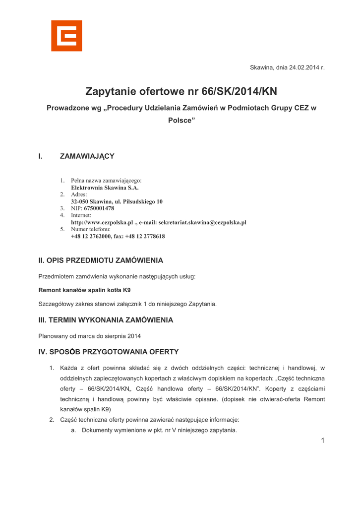 Skawina, dnia 24.02.2014 r. Zapytanie ofertowe nr 66/SK/2014/KN Prowadzone wg „Procedury Udzielania Zamówień w Podmiotach Grupy CEZ w Polsce” I. ZAMAWIAJĄCY 1. 2. 3. 4. 5. Pełna nazwa zamawiającego: Elektrownia Skawina S.A. Adres: 32-050 Skawina, ul. Piłsudskiego 10 NIP: 6750001478 Internet: http://www.cezpolska.pl ., e-mail: [email protected] Numer telefonu: +48 12 2762000, fax: +48 12 2778618 II. OPIS PRZEDMIOTU ZAMÓWIENIA Przedmiotem zamówienia wykonanie następujących usług: Remont kanałów spalin kotła K9 Szczegółowy zakres stanowi załącznik 1 do niniejszego Zapytania. III. TERMIN WYKONANIA ZAMÓWIENIA Planowany od marca do sierpnia 2014 IV. SPOSÓB PRZYGOTOWANIA OFERTY 1. Każda z ofert powinna składać się z dwóch oddzielnych części: technicznej i handlowej, w oddzielnych zapieczętowanych kopertach z właściwym dopiskiem na kopertach: „Część techniczna oferty – 66/SK/2014/KN„ Część handlowa oferty – 66/SK/2014/KN”. Koperty z częściami techniczną i handlową powinny być właściwie opisane. (dopisek nie otwierać-oferta Remont kanałów spalin K9) 2. Część techniczna oferty powinna zawierać następujące informacje: a. Dokumenty wymienione w pkt. nr V niniejszego zapytania. 1 3. Część handlowa oferty powinna zawierać następujące informacje: a. Dokumenty wymienione w pkt. nr VI niniejszego zapytania. 4. Każdy oferent może złożyć tylko jedną ofertę. 5. Sposób przygotowania oferty: a. Oferta powinna być napisana czytelnie w języku polskim, b. Wszystkie strony oferty wraz z załącznikami powinny być podpisane przez osobę (osoby) uprawnioną do występowania w imieniu oferenta, c. Wszystkie strony oferty wraz z załącznikami powinny być spięte w sposób zapobiegający jej dekompletacji, d. Wszelkie poprawki lub zmiany w tekście oferty muszą być parafowane i datowane własnoręcznie przez osobę podpisującą ofertę lub przez osobę upoważnioną. 6. Opakowanie i oznakowanie ofert: Ofertę należy złożyć w zamkniętym opakowaniu w miejscu wskazanym w pkt. VIII. 7. Zamawiający nie bierze odpowiedzialności za skutki braku zachowania powyższych warunków przez Oferenta. Nie spełnienie wymagań j/w spowoduje odrzucenie oferty. 8. Oferent poniesie wszelkie koszty związane z przygotowaniem i złożeniem oferty. 9. Płyta CD (opisana: nazwa firmy + dopisek: „Zapytanie – „66/SK/2014/KN” ze wszystkimi dokumentami i załącznikami wymienionymi w pkt V i VI załączona w części technicznej oferty). Dokumenty składane są w wersji papierowej w oryginale lub kserokopii poświadczonej za zgodność z oryginałem. Wszelkie dokumenty wymienione w powyższych punktach oprócz tego, że powinny zostać złożone w wersji papierowej, muszą zostać przesłane również w wersji elektronicznej na nośniku CD. V. INFORMACJE O DOKUMENTACH, JAKIE MAJĄ DOSTARCZYĆ DOSTAWCY W CZĘŚCI TECHNICZNEJ OFERTY: 1. Koncesję, zezwolenie lub licencję, (jeżeli ustawy nakładają obowiązek posiadania koncesji, zezwolenia lub licencji na podjęcie działalności gospodarczej w zakresie objętym zamówieniem). 2. Dokumenty stwierdzające, że osoby, które będą wykonywać zamówienie, posiadają wymagane uprawnienia, jeżeli ustawy nakładają obowiązek posiadania takich uprawnień. 2 3. Listę referencyjną klientów potwierdzającą wykonywanie Prac takich samych lub pokrewnych (wraz z danymi kontaktowymi). 4. Szczegółowy harmonogram realizacji prac. 5. Dokument gwarancji uwzględniający jej okres i warunki. VI. INFORMACJE O DOKUMENTACH, JAKIE MAJĄ DOSTARCZYĆ DOSTAWCY W CZĘŚCI HANDLOWEJ OFERTY: 1. Aktualny odpis z właściwego rejestru albo aktualne zaświadczenie o wpisie do ewidencji działalności gospodarczej, jeżeli odrębne przepisy wymagają wpisu do rejestru lub zgłoszenia do ewidencji działalności gospodarczej, wystawiony nie wcześniej niż 6 miesięcy przed upływem terminu składania ofert. (lub dokument potwierdzony w tym terminie przez organ wydający), 2. Pełnomocnictwo, jeżeli ofertę podpisują inne osoby niż uprawnione do zaciągania zobowiązań w imieniu oferenta, 3. Oświadczenie oferenta, że nie podlega wykluczeniu z następujących powodów stanowiące załącznik nr 1 do niniejszego zapytania: nie wywiązanie się wobec Zamawiającego z należytą starannością choćby z jednej umowy, nie jest objęty postępowaniem układowym bądź innymi postępowaniami związanymi z restrukturyzacja zadłużenia, wszczęcie postępowania upadłościowego, ogłoszenie upadłości lub będących w trakcie prowadzenia likwidacji. 4. Wypełniony załącznik nr 2 „ First Assesment.xls” do niniejszego zapytania ofertowego. 5. Dane kontaktowe osoby upoważnionej ze strony Oferenta do kontaktu z Zamawiającym. 6. Cenę netto w PLN i warunki płatności. Cena winna zawierać wszystkie składniki związane z wykonaniem usług i dostaw opisanych w punkcie nr II niniejszego Zapytania. 7. Kosztorys ofertowy na wykonanie usługi 8. Oświadczenie oferenta związane z wymaganiami w stosunku do wykonawstwa: a) Oświadczenie akceptujące postanowienia Ogólnych Warunków Realizacji Zamówień stanowiące załącznik nr 3 do niniejszego zapytania. b) Akceptacja terminu płatności wynoszącego 30 dni liczonych od daty otrzymania faktury przez Zamawiającego. 3 VII. TERMIN DO KTÓREGO DOSTAWCA BĘDZIE ZWIĄZANY ZŁOŻONĄ OFERTĄ: Dostawca będzie związany złożoną ofertą do dnia 30.08.2014. VIII. MIEJSCE ORAZ TERMIN SKŁADANIA OFERT 1. Oferta powinna być przesłana za pośrednictwem: poczty, kuriera lub też dostarczona osobiście na adres: CEZ Polska sp. z o.o., Centrum Usług Wspólnych, ul. Piłsudskiego 10, 32-050 Skawina, na nazwisko: Krzysztof Narecki, do dnia .19.03.2014 roku do godz. 15:00. 2. Oferty złożone po terminie nie będą rozpatrywane. 3. Zamawiający oceni ważność ofert pod względem formalnym oraz przyjętych w zapytaniu kryteriów oceny ofert na posiedzeniu niejawnym. IX. OPIS KRY