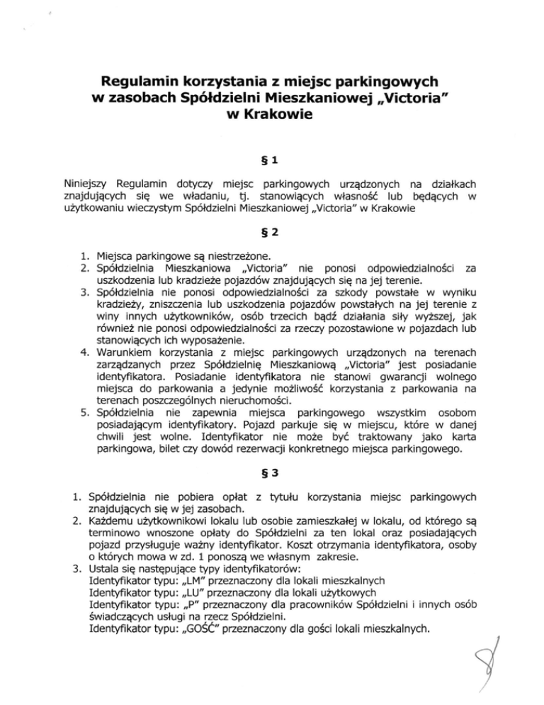 Regulamin korzystania z miejsc parkingowych w zasobach Spötdzielni Mieszkaniowej „Victoria w Krakowie §1 Niniejszy Regulamin dotyczy miejsc parkingowych urzadzonych na dziaJkach znajdujacych sie. we wtedaniu, tj. stanowiacych wtasnosc lub be.da.cych w uzytkowaniu wieczystym Spötdzielni Mieszkaniowej „Victoria" w Krakowie §2 1. Miejsca parkingowe sa. niestrzezone. 2. Spötdzielnia Mieszkaniowa „Victoria" nie ponosi odpowiedzialnosci za uszkodzenia lub kradzieze pojazdöw znajduja.cych sie. na jej terenie. 3. Spöldzielnia nie ponosi odpowiedzialnosci za szkody powstate w wyniku kradziezy, zniszczenia lub uszkodzenia pojazdöw powstatych na jej terenie z winy innych uzytkowniköw, osöb trzecich badz dziatania sity wyzszej, jak röwniez nie ponosi odpowiedzialnosci za rzeczy pozostawione w pojazdach lub stanowiacych ich wyposazenie. 4. Warunkiem korzystania z miejsc parkingowych urzadzonych na terenach zarzadzanych przez Spötdzielni^ Mieszkaniowa. „Victoria" jest posiadanie identyfikatora. Posiadanie identyfikatora nie stanowi gwarancji wolnego miejsca do parkowania a jedynie mozliwosc korzystania z parkowania na terenach poszczegölnych nieruchomosci. 5. Spöldzielnia nie zapewnia miejsca parkingowego wszystkim osobom posiadajacym identyfikatory. Pojazd parkuje sie. w miejscu, ktöre w danej chwili jest wolne. Identyfikator nie moze byc traktowany jako karta parkingowa, bilet czy dowöd rezerwacji konkretnego miejsca parkingowego. §3 1. Spöldzielnia nie pobiera oplat z tytulu korzystania miejsc parkingowych znajduja.cych sie. w jej zasobach. 2. Kazdemu uzytkownikowi lokalu lub osobie zamieszkatej w lokalu, od ktörego sa. terminowo wnoszone optaty do Spöldzielni za ten lokal oraz posiadajacych pojazd przysluguje wazny identyfikator. Koszt otrzymania identyfikatora, osoby o ktörych mowa w zd. 1 ponosza. we wtasnym zakresie. 3. Ustala sie. naste.puja.ce typy identyfikatoröw: Identyfikator typu: „LM" przeznaczony dla lokali mieszkalnych Identyfikator typu: „LU" przeznaczony dla lokali uzytkowych Identyfikator typu: „P" przeznaczony dla pracowniköw Spötdzielni i innych osöb swiadczacych ustugi na rzecz Spöldzielni. Identyfikator typu: „GOSC" przeznaczony dla gosci lokali mieszkalnych. 4. Identyfikatory wydawane sa. bezterminowo. W przypadku osöb zawierajacych ze Spöldzielnia. umowy cywilno-prawne (np. najmu, dzierzawy) identyfikatory wydawane sa. na czas trwania umowy. 5. Warunkiem uzyskania identyfikatora jest: a) ztozenie pisemnego wniosku na odpowiednim formularzu z podaniem numeru rejestracyjnego pojazdu; dowöd rejestracyjny pojazdu okazuje sie. pracownikowi Spötdzielni wraz ze sktadaniem wniosku, b) zfozenie pisemnego oswiadczenia przez osobe. uprawniona. o zapoznaniu sie. z niniejszym Regulaminem, c) sprawdzenie przez Spöfdzielnie. uprawnienia do otrzymania identyfikatora. 6. Wzör wniosku oraz oswiadczenia stanowi zalacznik nr 1. 7. Warunkiem otrzymania duplikatu jest zwrot zniszczonego lub uszkodzonego identyfikatora oraz wniesienie oplaty w wysokosci 10 z\. 8. Zarzad moze odmöwic wydania identyfikatora w przypadkach nie stosowania sie. uzytkowniköw lokali lub uzytkowniköw pojazdöw do niniejszego Regulaminu oraz w przypadku: a) uzytkowania lokalu lub post^powania przez uzytkownika lokalu w sposöb sprzeczny z przepisami, b) zalegania z oplatami przez uzytkownika lokalu lub przez osoby solidarnie odpowiedzialne za ponoszenie oplat, c) zlozenia pisemnego wniosku o wydanie identyfikatora przez osobe. nieuprawniona.. 9. Osoba uprawniona moze wysta.pic o przyznanie mu identyfikatora na samochöd sluzbowy (osobowy) pod warunkiem ziozenia oswiadczenia przez podmiot, z ktörym wspölpracuje w ramach umowy o prace. lub na podstawie umowy cywilno-prawnej (umowa zlecenie, umowa o dzieto) o posiadanym prawie do tego samochodu. Osoba uprawniona moze wysta.pic o identyfikator dla czlonka rodziny (goscia) nie zamieszkuja.cego w zasobach S.M. „Victoria^ Identyfikator, ktörym mowa w zd. 1 wydawany jest bezterminowo. 10. Jeden identyfikator typu „GOSC" przysluguje na jeden lokal mieszkalny. Identyfikatoröw typu „GOSC" nie wydaje sie. dla lokali uzytkowych. W wyja.tkowych wypadkach osoba uprawniona moze ubiegac sie. o drugi identyfikator typu „GOSC" po zlozeniu pisemnego wniosku wraz z uzasadnieniem do Zarzadu SM „Victoria". 11. Zarza.d Spötdzielni prowadzi rejestr identyfikatoröw, zawierajacy wszystkie dane niezbQdne do organizacji systemu identyfikatoröw okreslonego niniejszym Regulaminem. 12. Rejestr identyfikatoröw jest objqty systemem ochrony danych osobowych. r §4 Otrzymanie identyfikatora nast^puje na wniosek osoby uprawnionej, zlozony w Dziale czlonkowskim Spötdzielni. W przypadku zgubieniu lub kradziezy identyfikatora nalezy niezwtocznie powiadomic SpöWzielnie. w celu uniewaznienia zgubionego 2 identyfikatora i wystawienia nowego. W razie odnalezienia zgubionego identyfikatora po wystawieniu nowego, poprzedni identyfikator nalezy zwröcic z powrotem do Spötdzielni. §5 1. Prawo do postoju na miejscach parkingowych urzadzonych na terenie mienia wspölnego przystuguje kazdemu uzytkownikowi lokalu lub osobie zamieszkalej w lokalu, na terenie danej nieruchomosci oraz ich gosciom. 2. Prawo do postoju na miejscach parkingowych urzadzonych na terenie danej nieruchomosci niestanowiacej mienia wspölnego (oznaczone za pomoca. odpowiednich znaköw z oznaczeniem nieruchomosci) przystuguje kazdemu uzytkownikowi lokalu lub osobie zamieszkalej w lokalu, na terenie danej nieruchomosci oraz ich gosciom. 3. Osobom, o ktörych mowa w ust. 1 i 2 przysluguje prawo do postoju na miejscach parkingowych pod warunkiem posiadania identyfikatora wydanego przez Spötdzielni^ i umieszczonego w widocznym miejscu wewna.trz pojazdu. Identyfikator posiada cechy okreslaja.ce nieruchomosc i numer rejestracyjny pojazdu. Wzör identyfikatora stanowi zatacznik nr 2 do niniejszego regulaminu. Spötdzielnia prowadzi rejestr wydanych identyfikatoröw. 4. Prawo do postoju na m