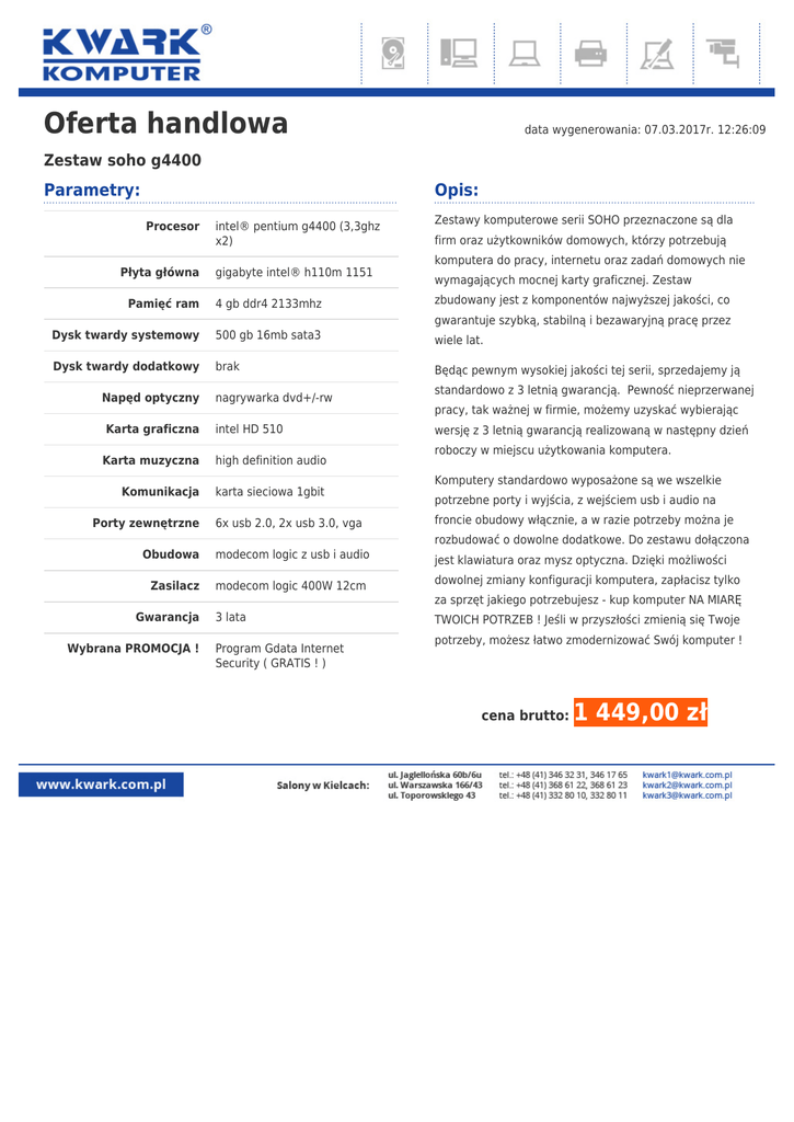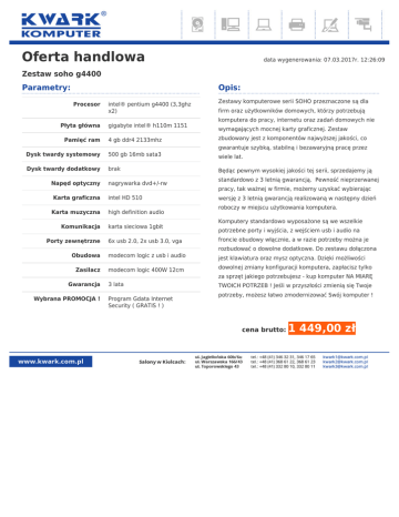 Oferta handlowa data wygenerowania: 07.03.2017r. 12:26:09 Zestaw soho g4400 Parametry: Opis: Procesor Płyta główna intel® pentium g4400 (3,3ghz x2) gigabyte intel® h110m 1151 Zestawy komputerowe serii SOHO przeznaczone są dla firm oraz użytkowników domowych, którzy potrzebują komputera do pracy, internetu oraz zadań domowych nie wymagających mocnej karty graficznej. Zestaw zbudowany jest z komponentów najwyższej jakości, co Pamięć ram 4 gb ddr4 2133mhz Dysk twardy systemowy 500 gb 16mb sata3 wiele lat. Dysk twardy dodatkowy brak Będąc pewnym wysokiej jakości tej serii, sprzedajemy ją gwarantuje szybką, stabilną i bezawaryjną pracę przez Napęd optyczny nagrywarka dvd+/-rw Karta graficzna intel HD 510 Karta muzyczna high definition audio Komunikacja karta sieciowa 1gbit Porty zewnętrzne 6x usb 2.0, 2x usb 3.0, vga standardowo z 3 letnią gwarancją. Pewność nieprzerwanej pracy, tak ważnej w firmie, możemy uzyskać wybierając wersję z 3 letnią gwarancją realizowaną w następny dzień roboczy w miejscu użytkowania komputera. Komputery standardowo wyposażone są we wszelkie potrzebne porty i wyjścia, z wejściem usb i audio na froncie obudowy włącznie, a w razie potrzeby można je rozbudować o dowolne dodatkowe. Do zestawu dołączona Obudowa modecom logic z usb i audio jest klawiatura oraz mysz optyczna. Dzięki możliwości Zasilacz modecom logic 400W 12cm dowolnej zmiany konfiguracji komputera, zapłacisz tylko za sprzęt jakiego potrzebujesz - kup komputer NA MIARĘ Gwarancja Wybrana PROMOCJA ! 3 lata Program Gdata Internet Security ( GRATIS ! ) TWOICH POTRZEB ! Jeśli w przyszłości zmienią się Twoje potrzeby, możesz łatwo zmodernizować Swój komputer ! cena brutto: 1 449,00 zł
