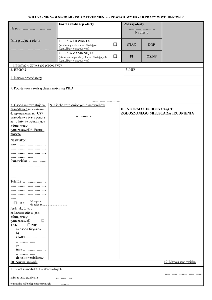 ZGŁOSZENIE WOLNEGO MIEJSCA ZATRUDNIENIA – POWIATOWY URZĄD PRACY W WEJHEROWIE Forma realizacji oferty Rodzaj oferty .............................. Nr oferty Nr rej. .................................. Data przyjęcia oferty OFERTA OTWARTA ............................................. (zawierająca dane umożliwiające identyfikację pracodawcy) OFERTA ZAMKNIĘTA (nie zawierająca danych umożliwiających identyfikację pracodawcy) STAŻ DOP. PI OS.NP I. Informacje dotyczące pracodawcy 2. REGON 3. NIP 1. Nazwa pracodawcy 5. Podstawowy rodzaj działalności wg PKD 8. Osoba reprezentująca pracodawcę (upoważniona do reprezentowania)7. Czy pracodawca jest agencją zatrudnienia zgłaszającą ofertę pracy tymczasowej?6. Forma prawna ............................... 9. Liczba zatrudnionych pracowników ................. Nazwisko i imię ............................... ........................................ ........................................ ............................ Stanowisko ................... ........................................ ........................................ ........................................ ........ Telefon .......................... ........................................ ........................................ ........................................ ....... Nr wpisu TAK do rejestru ................................. Jeśli tak, to czy zgłaszana oferta jest ofertą pracy tymczasowej? TAK NIE a) osoba fizyczna b) spółka ...................... ...................... c) inna .......................... ...................... d) sektor publiczny 10. Nazwa zawodu II. INFORMACJE DOTYCZĄCE ZGŁOSZONEGO MIEJSCA ZATRUDNIENIA 12. Nazwa stanowiska 11. Kod zawodu13. Liczba wolnych ......................................... miejsc zatrudnienia w tym dla osób niepełnosprawnych .................. ........... 15. Adres miejsca wykonywania pracy14. Wnioskowana liczba ......................................................... ......................................................... ......................................................... kandydatów ..... ............. 16. Dodatkowe informacje 17. Forma kontaktu kandydatów z pracodawcą a) zakwaterowanie b) dowóz c) inne ................... a) telefoniczny pod nr ............................................................................. . b) osobisty w godz. ........................................................................ .......... c) inny .......................................................................... ............................ d) spotkanie (giełda pracy): dzień .............. godz. ............ miejsce ............... 20. Czy przekazać ofertę: 18. Rodzaj zatrudnienia a) umowa na czas nieokreślony b) umowa na czas określony c) umowa na okres próbny d) umowa na zastępstwo e) umowa zlecenie f) umowa o dzieło g) umowa o pracę tymczasową h) inne ............................. 21. Wysokość wynagrodzenia (kwota brutto) 22. System wynagradzania 23. Data rozpoczęcia zatrud. (miesięczny, godzinowy, akord, prowizja) ................................................ ................................ ............... 25. Wymagania – oczekiwania 26. Charakterystyka lub rodzaj pracodawcy24. Okres ważności oferty wykonywanej pracy ................................................. Wykształcenie ............................................ .................................... Kierunek/Specjalność ................................ .................................... Staż pracy .......................................................... ............................ Język obcy – stopień znajomości (biegły, komunikatywny) .................................................................... .................................... Uprawnienia/Umiejętności ........................ .................................... .................................................................... .................................... .................................................................... .................................... .................................................................... .................................... .................................................................... .................................... (ogólny zakres obowiązków) .................................................................... ................................... .................................................................... ................................... .................................................................... ................................... .................................................................... ................................... .................................................................... ................................... .................................................................... ................................... .................................................................... ................................... .................................................................... ................................... .................................................................... ................................... (do kiedy) ................................................. 27. Czy pracodawca w okresie 365 dni przed dniem zgłoszenia oferty pracy został skazany prawomocnym wyrokiem za naruszenie przepisów prawa pracy albo jest objęty postępowaniem dotyczącym naruszenia przepisów prawa pracy? TAK NIE 28. Czy oferta pracy została złożona w innym Powiatowym Urzędzie Pracy w Polsce? TAK NIE Do wskazanych powiatowych urzędów pracy w celu upowszechnienia – jeżeli TAK to jakich? …………………………………. Do upowszechnienia w wybranych państwach EOG TAK NIE 29. Częstotliwość kontaktu z pracodawcą w/s realizacji oferty: a) 3 dni, b) 1 tydzień, c) 2 tygodnie, d) inny .................